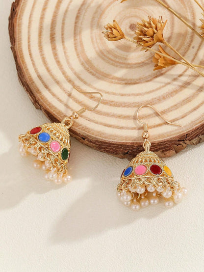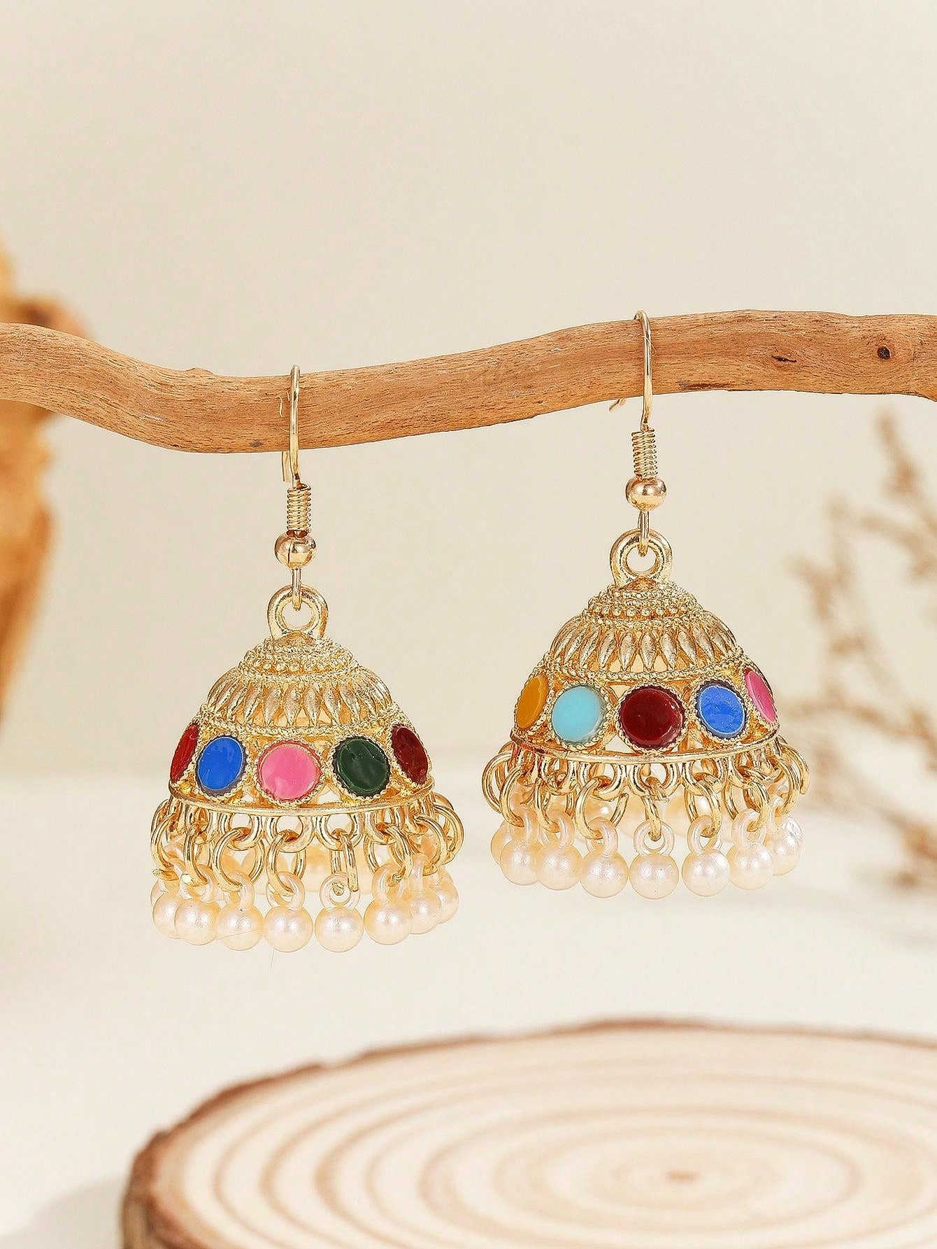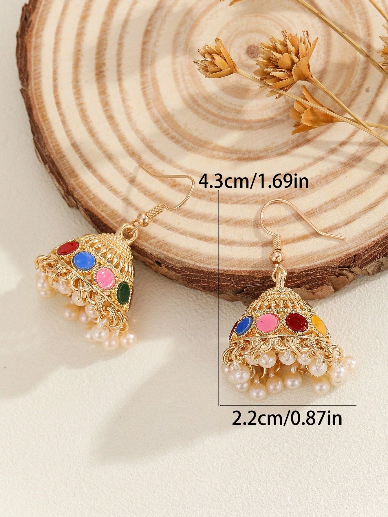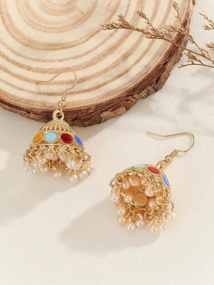 1 Pair Of Colorful Gold Jhumka Earrings, Bohemian Faux Pearl Beaded Tassel Dangle Earrings For Women, Suitable For Daily, Festival, Wedding And Party Wear / Jewelry Gift