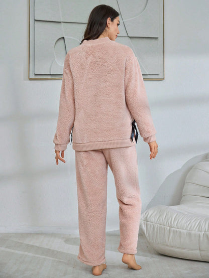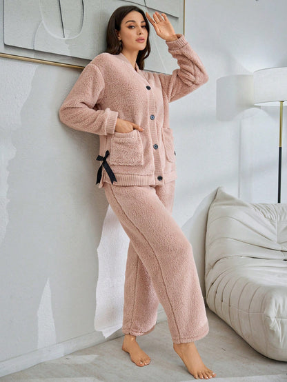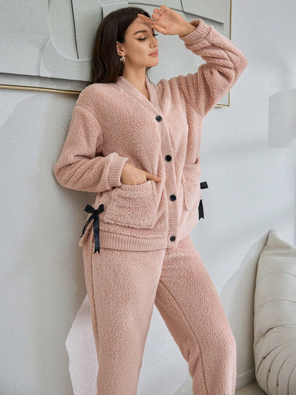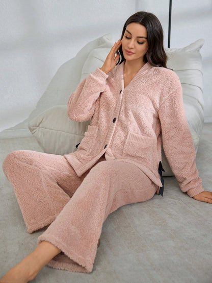 1set Women Plain Cardigan Casual Fluffy Long Sleeve Pajama Set