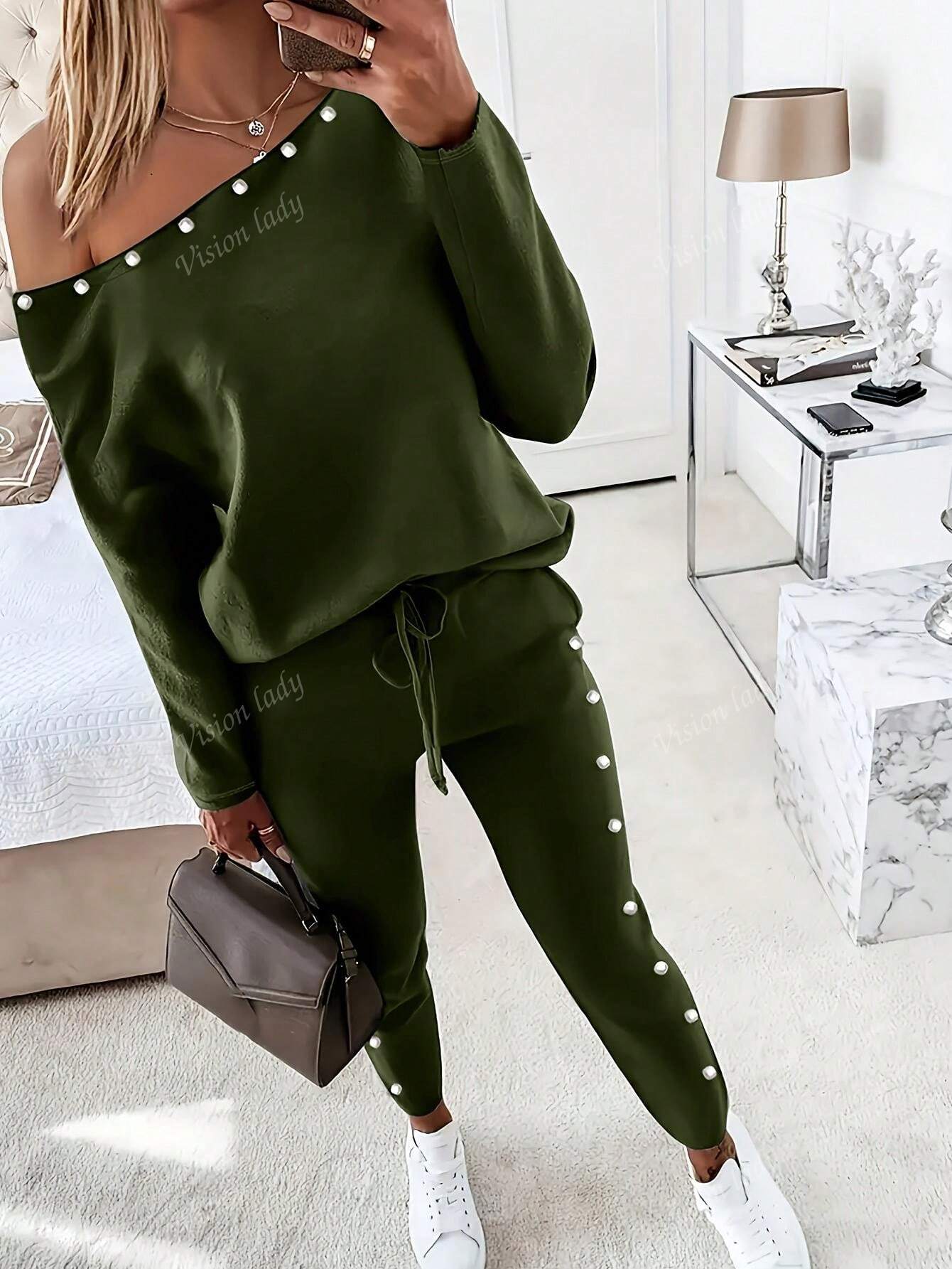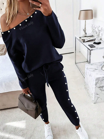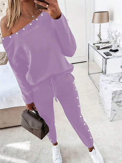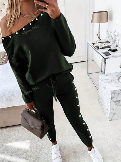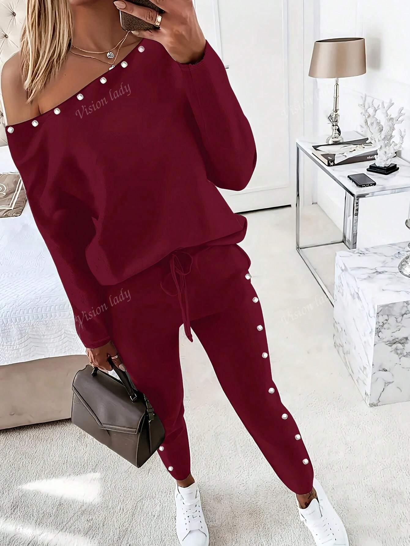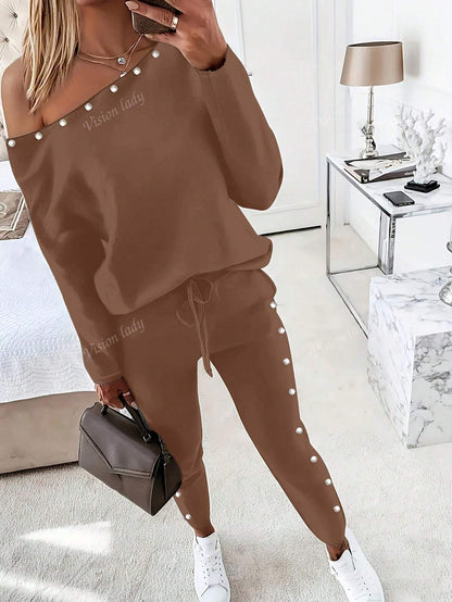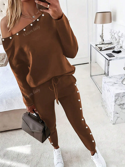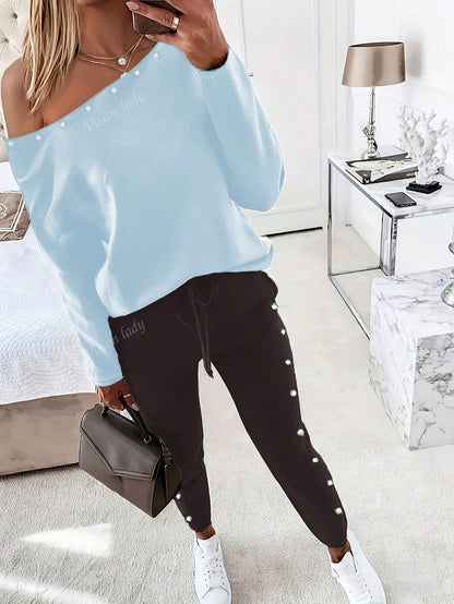 2pcs/Set Women's Fashionable Plain Long Sleeve Top And Pants Casual Outfit