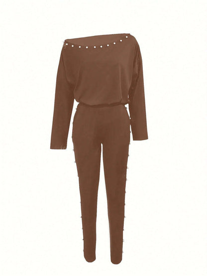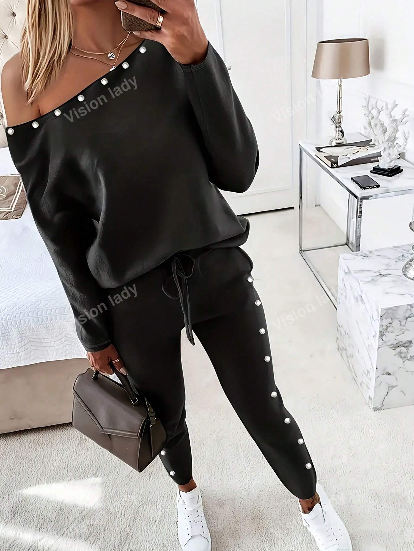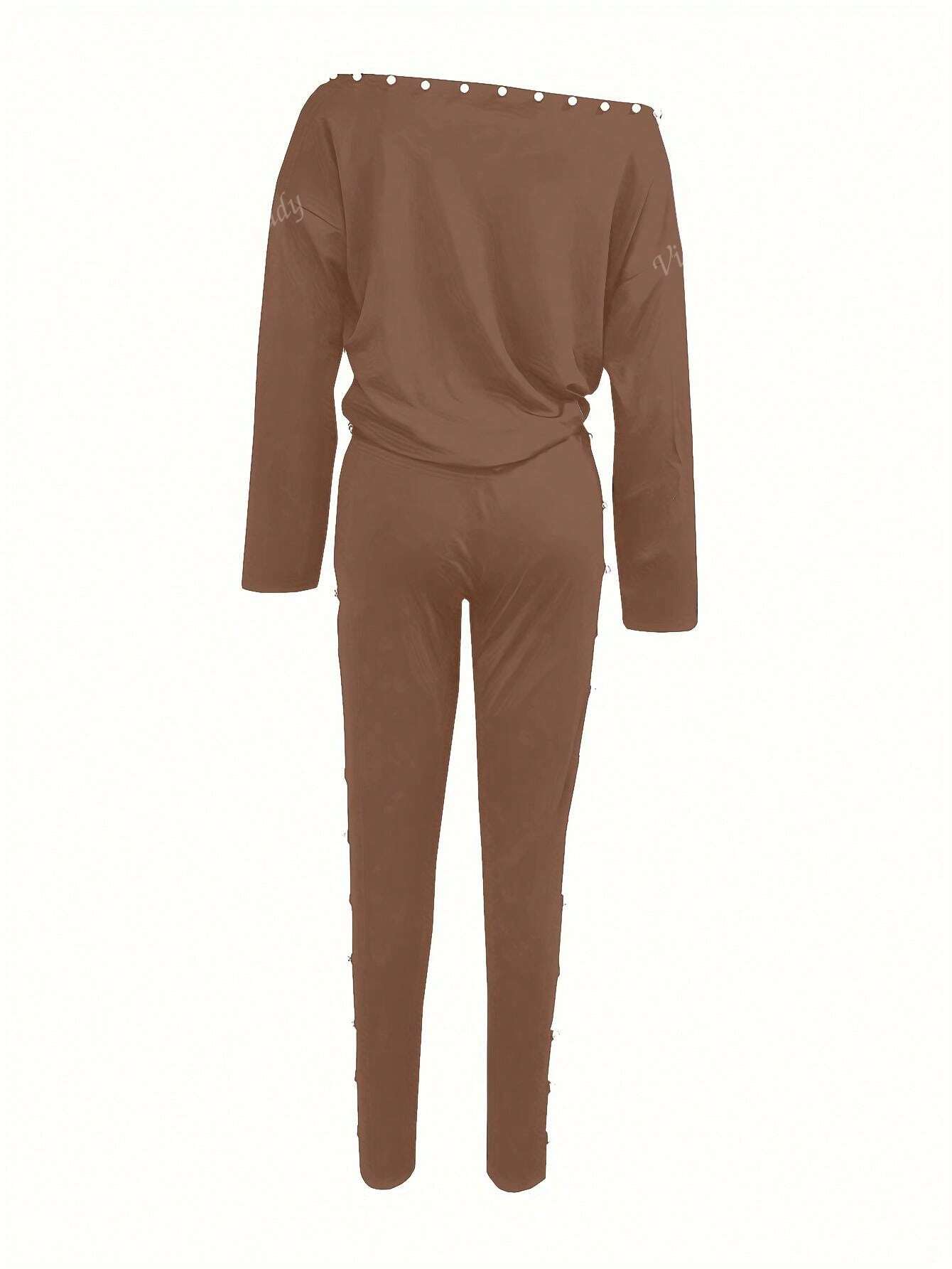 2pcs/Set Women's Fashionable Plain Long Sleeve Top And Pants Casual Outfit