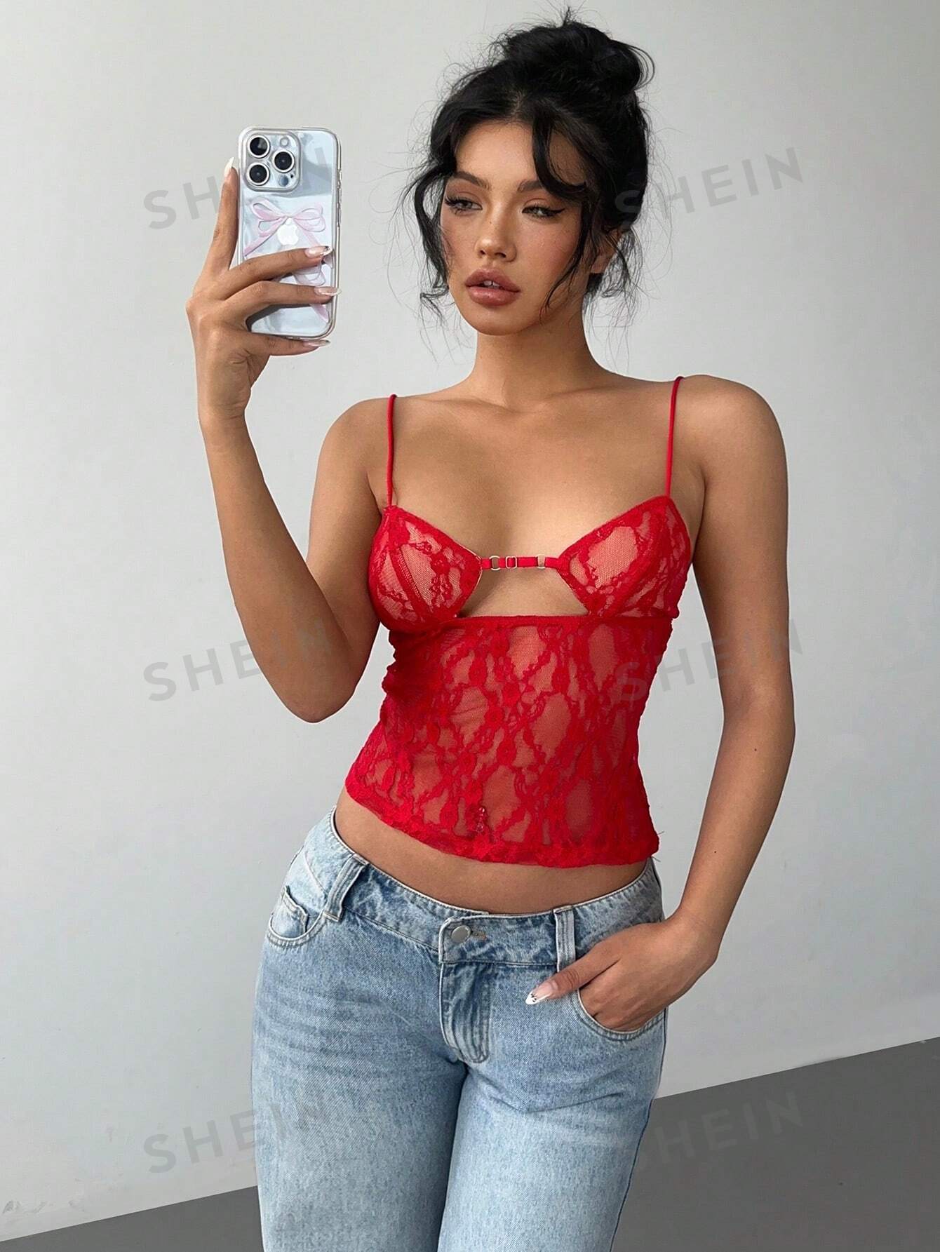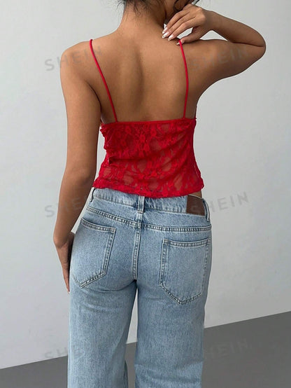 Aloruh Women's Red Lace Vest Sexy Camisole Top Solid Color Hollow Lace Slim Camisole