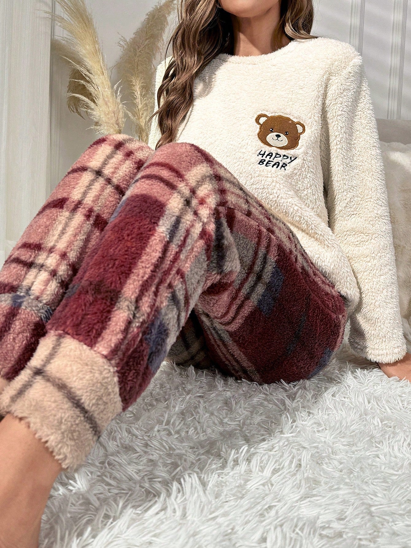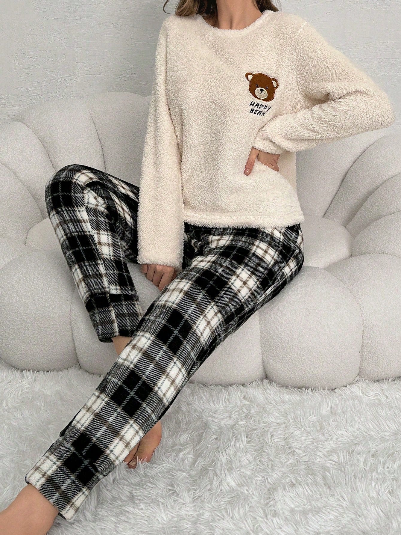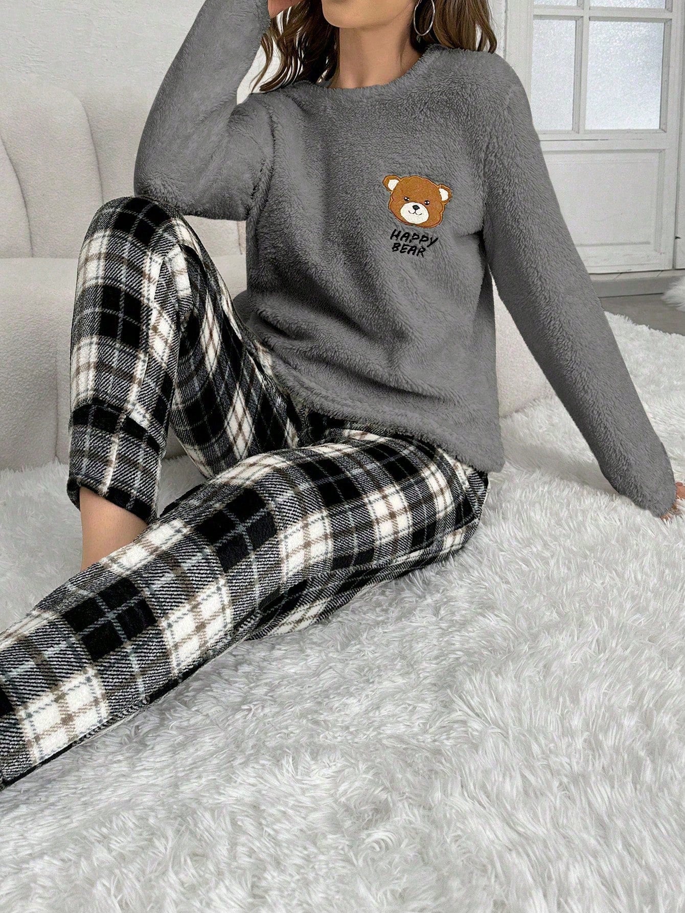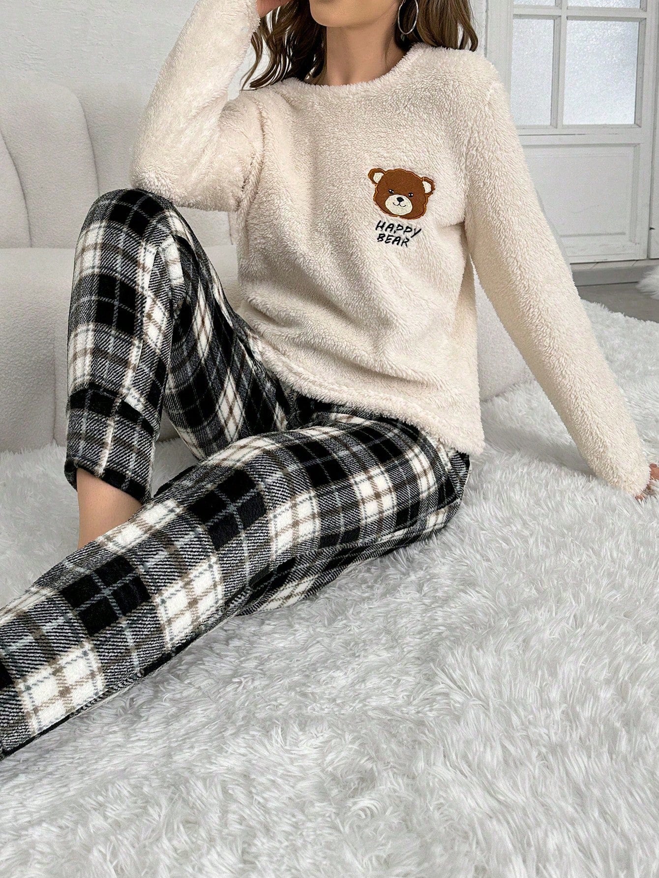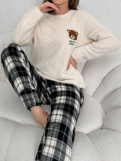 Bear & Letter Embroidery Drop Shoulder Teddy PJ Set