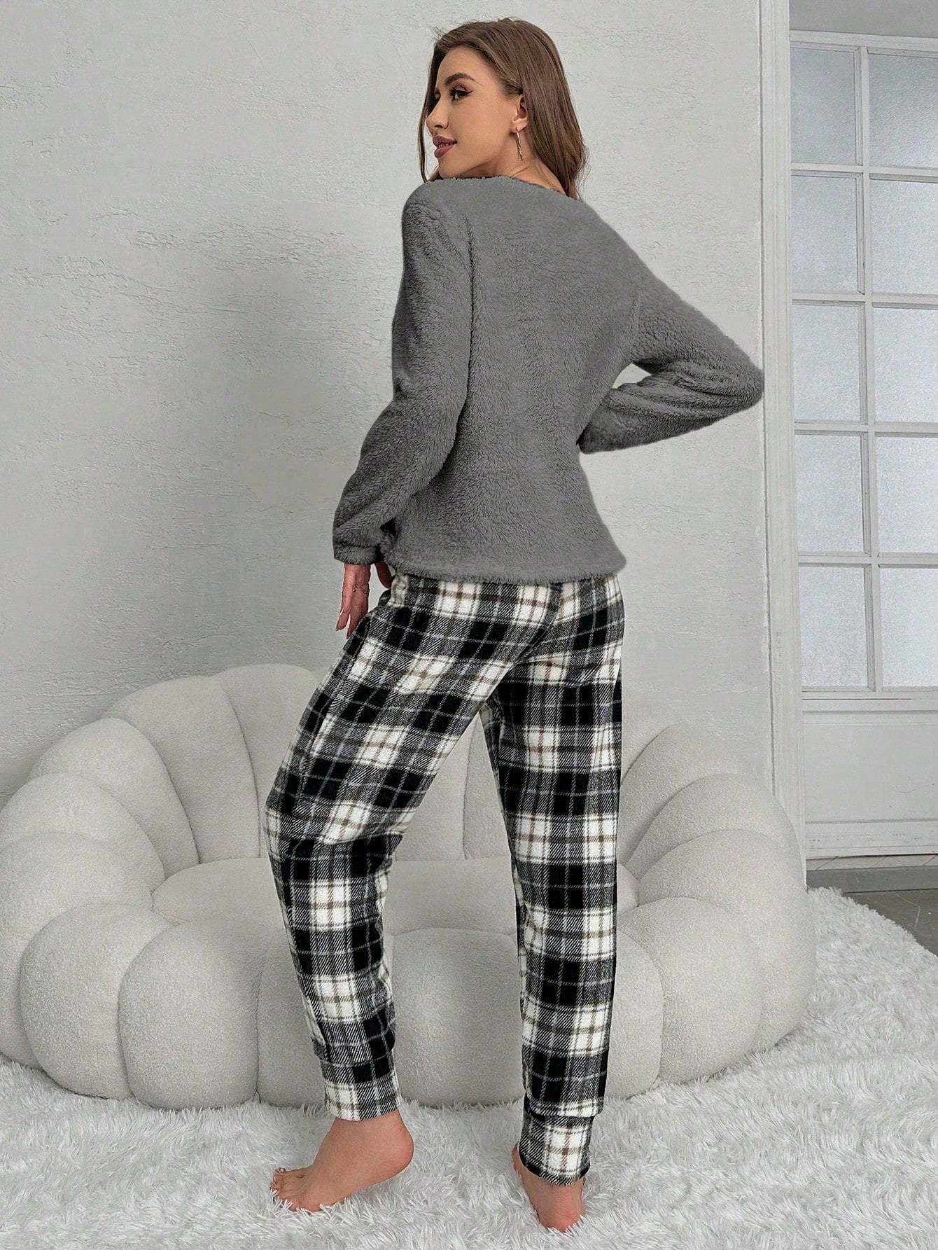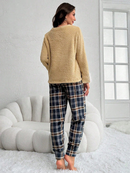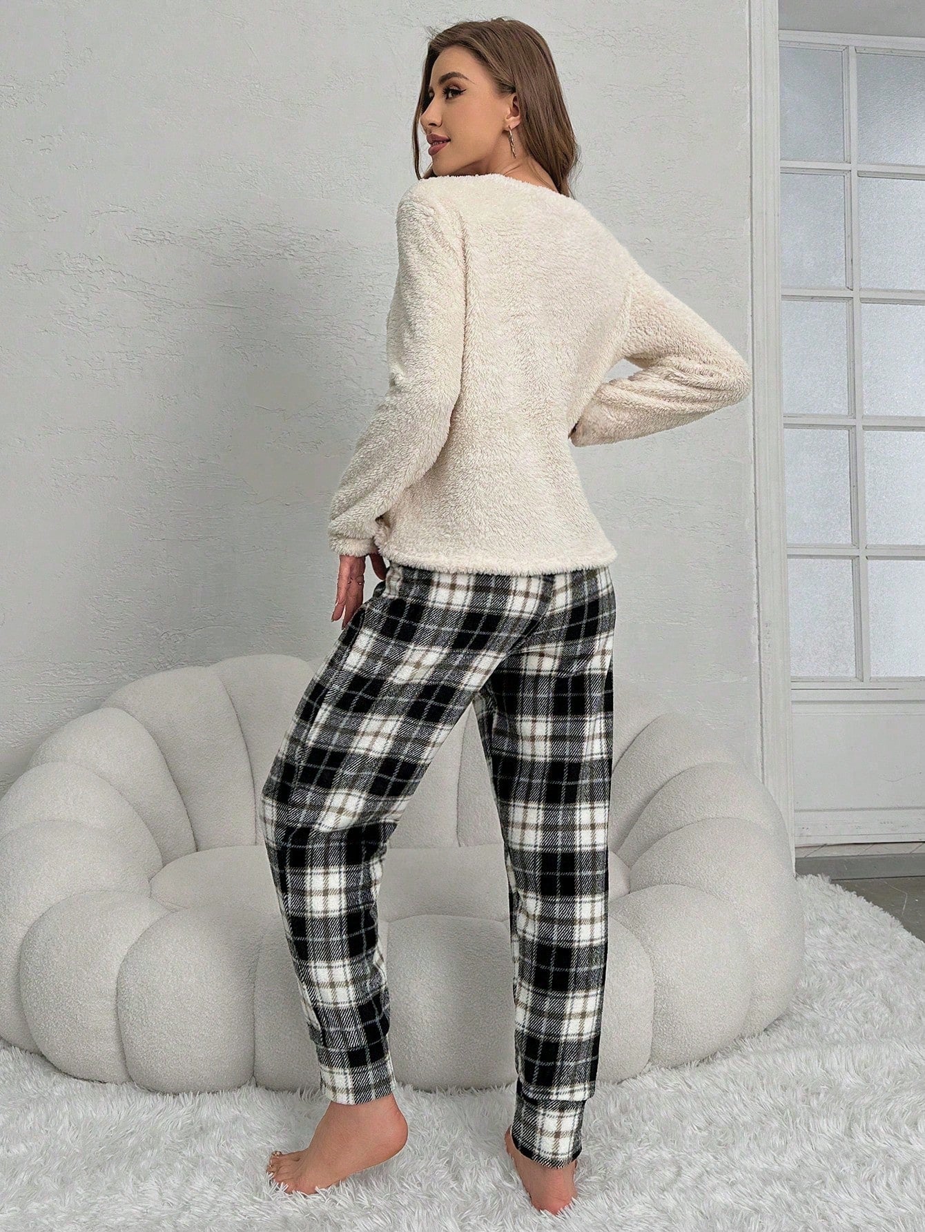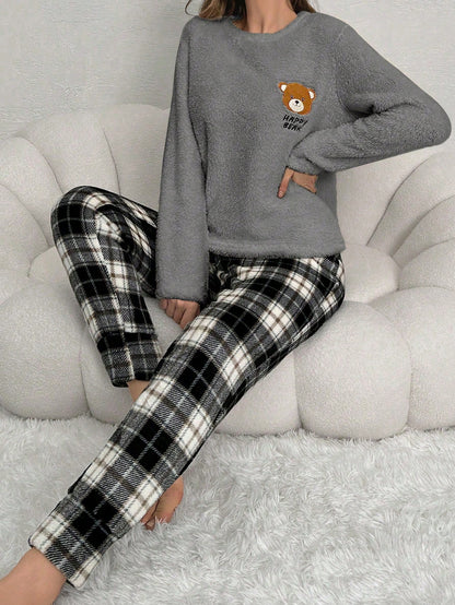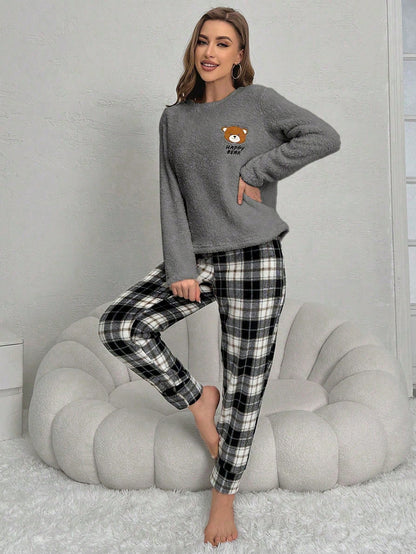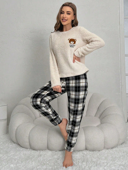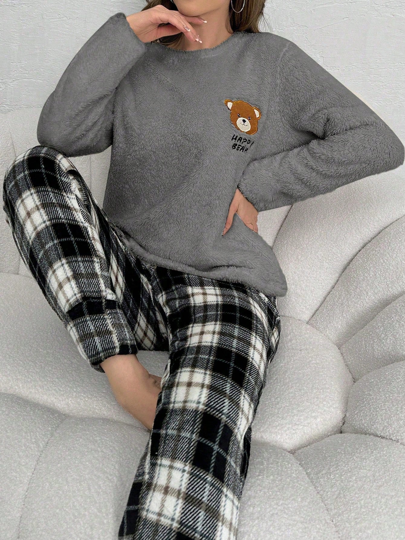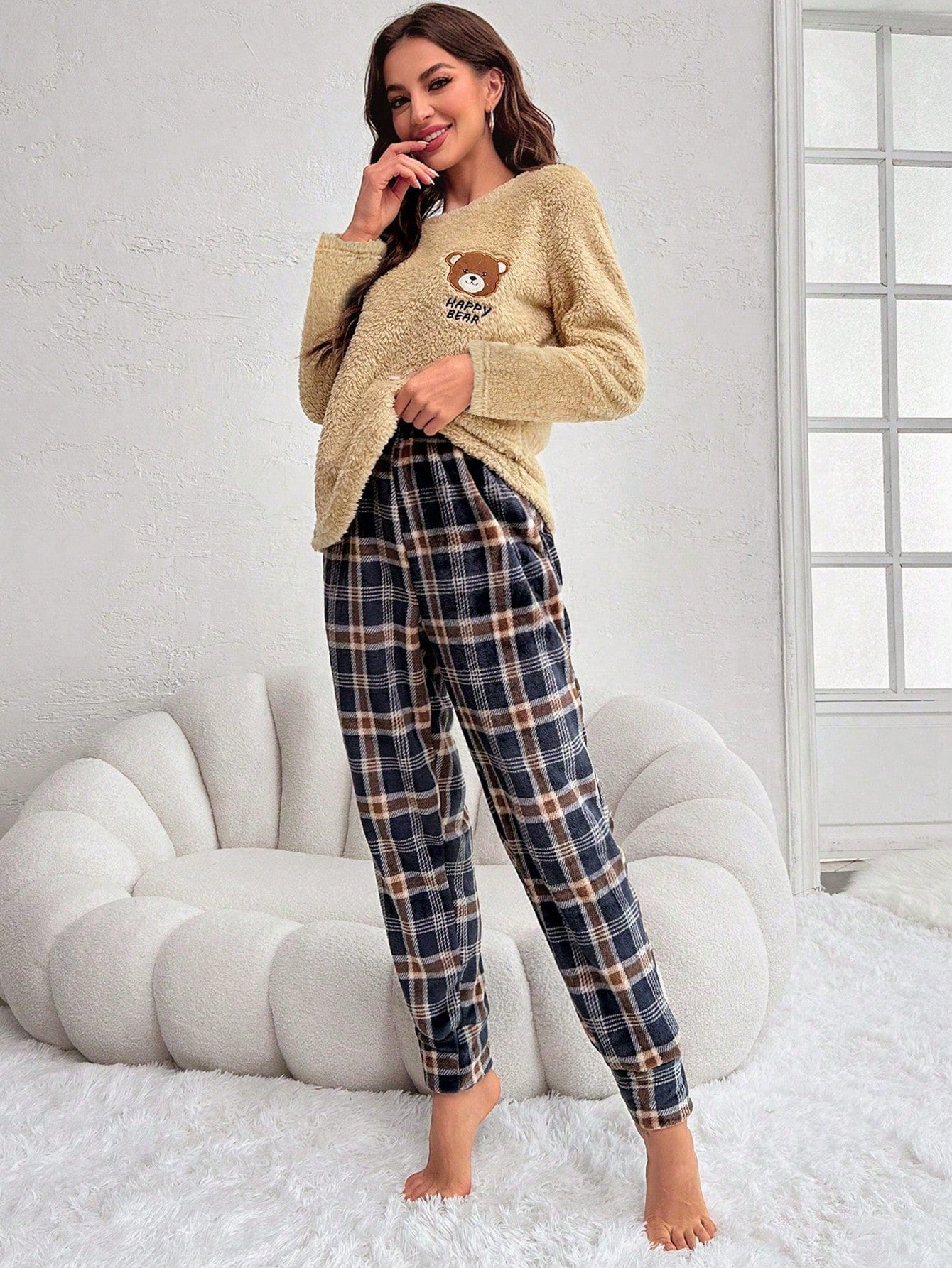 Bear & Letter Embroidery Drop Shoulder Teddy PJ Set
