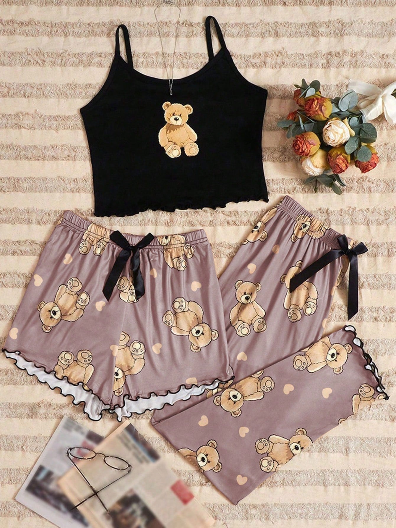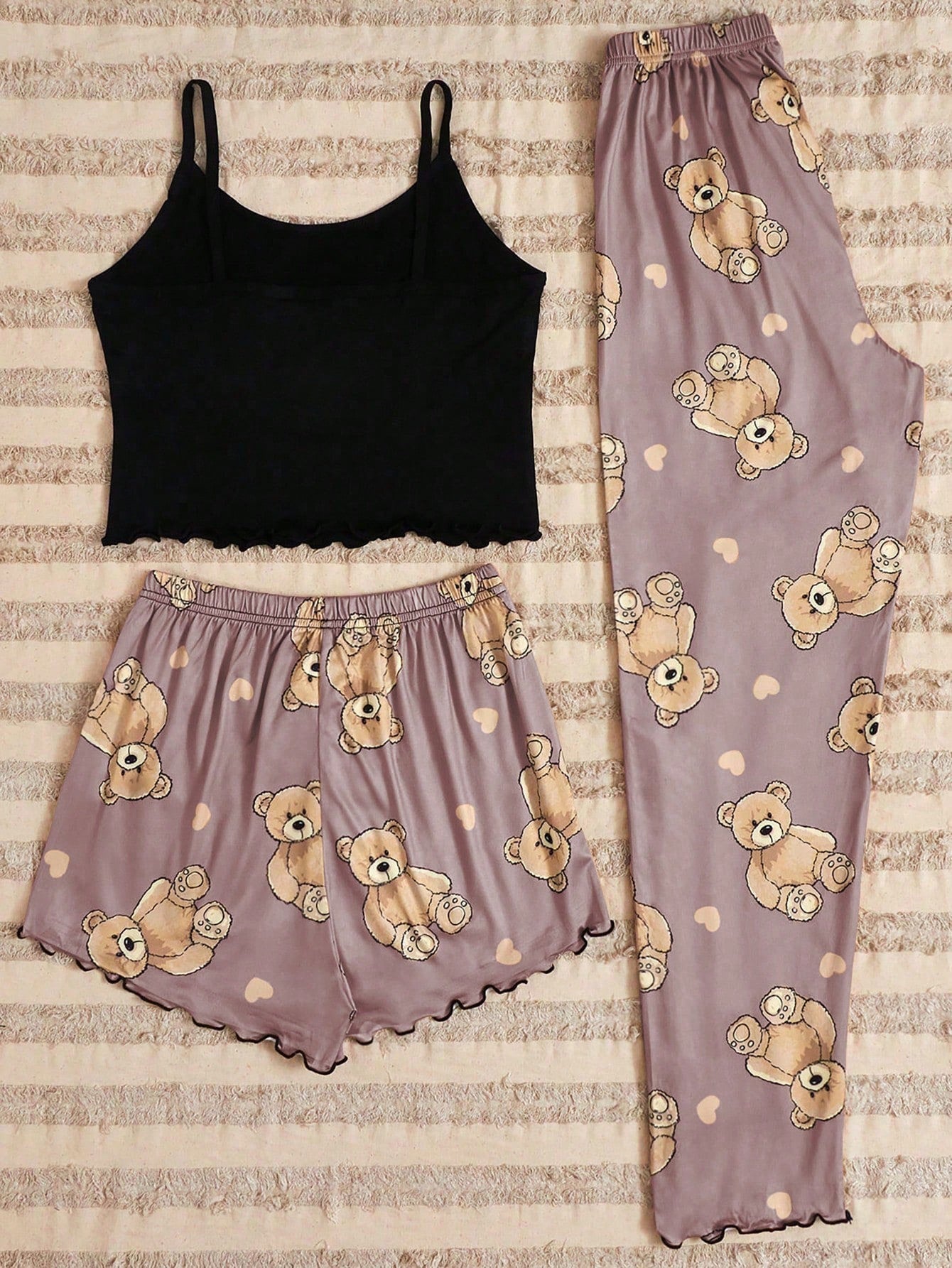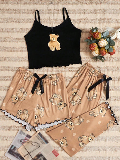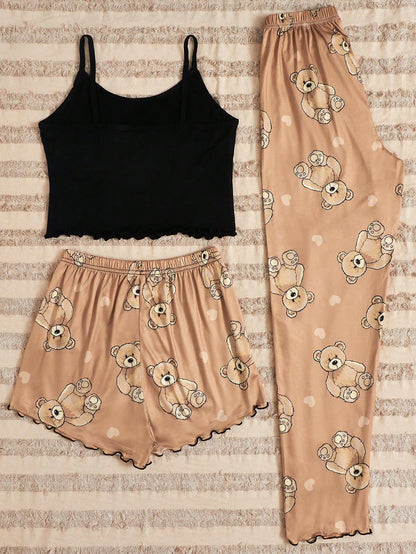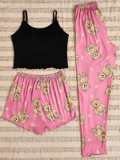 Bear Print Lettuce Trim Cami Top & Shorts & Pants PJ Set