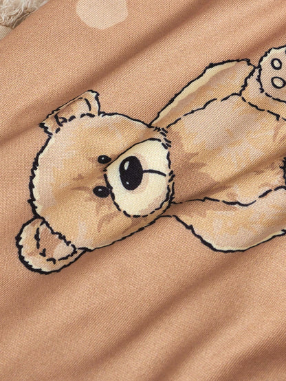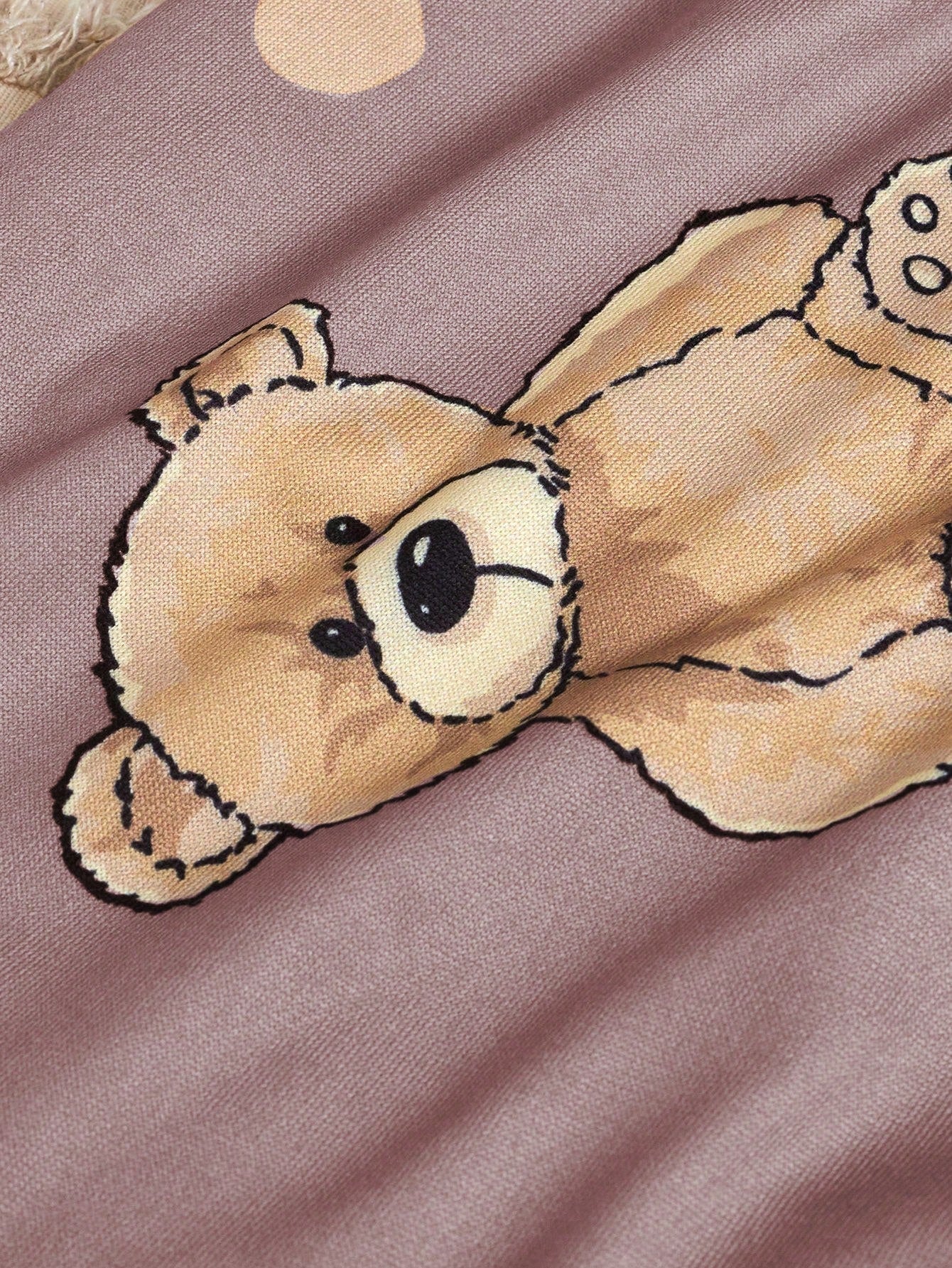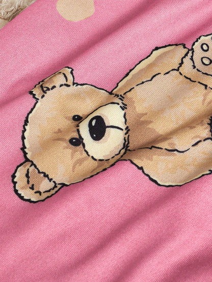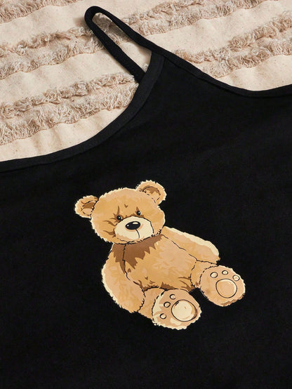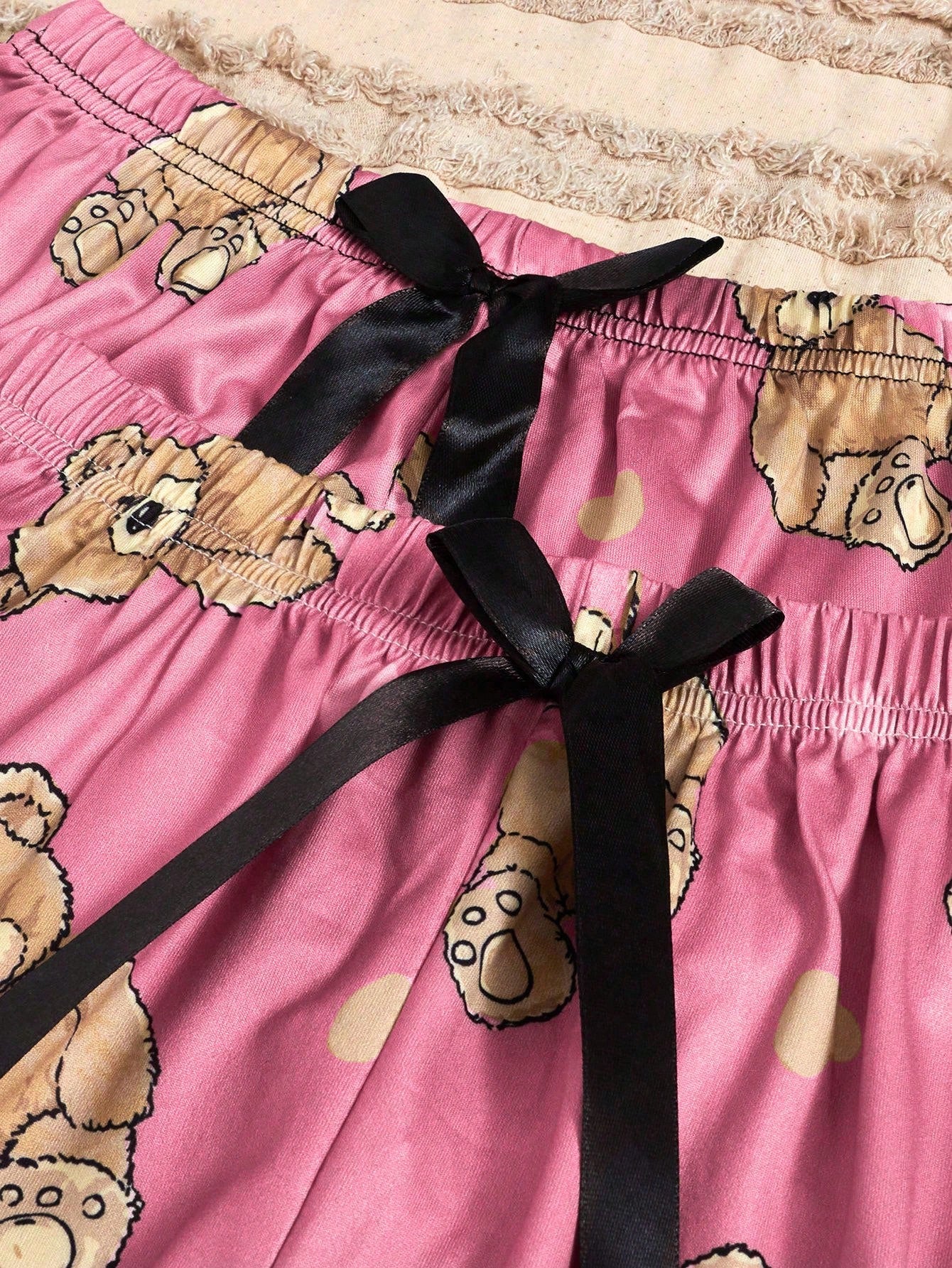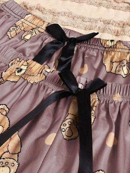 Bear Print Lettuce Trim Cami Top & Shorts & Pants PJ Set