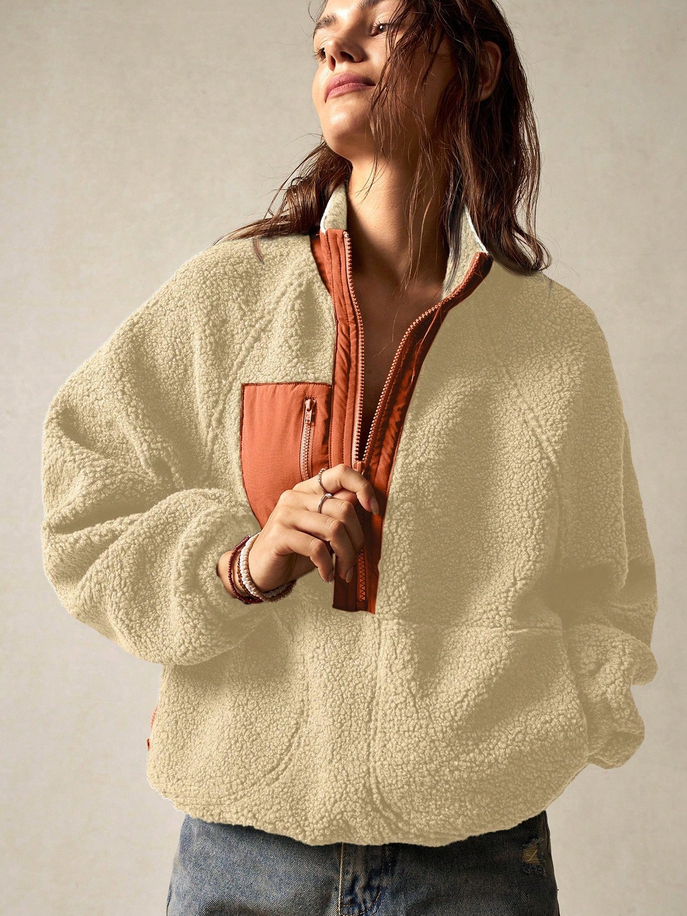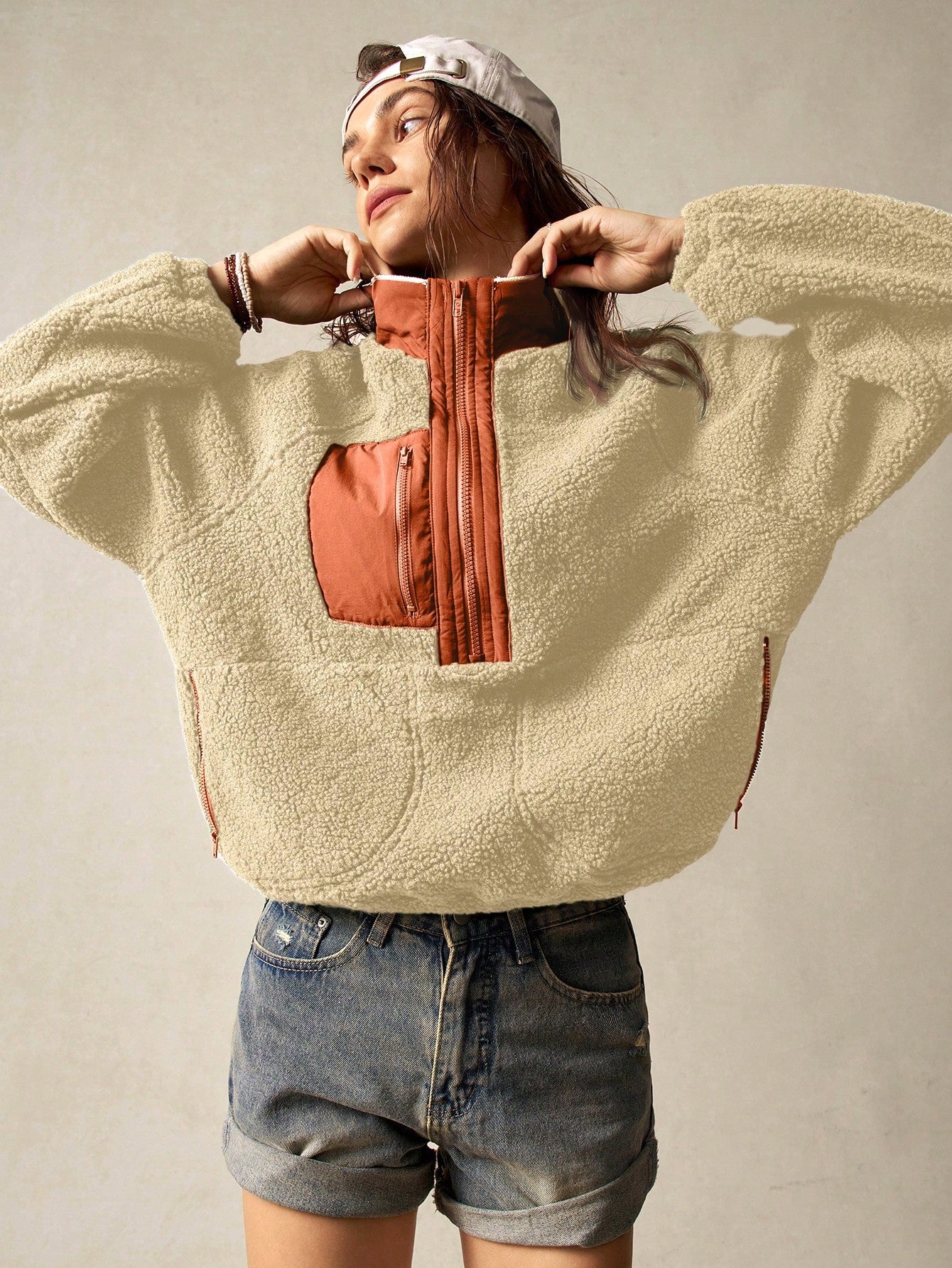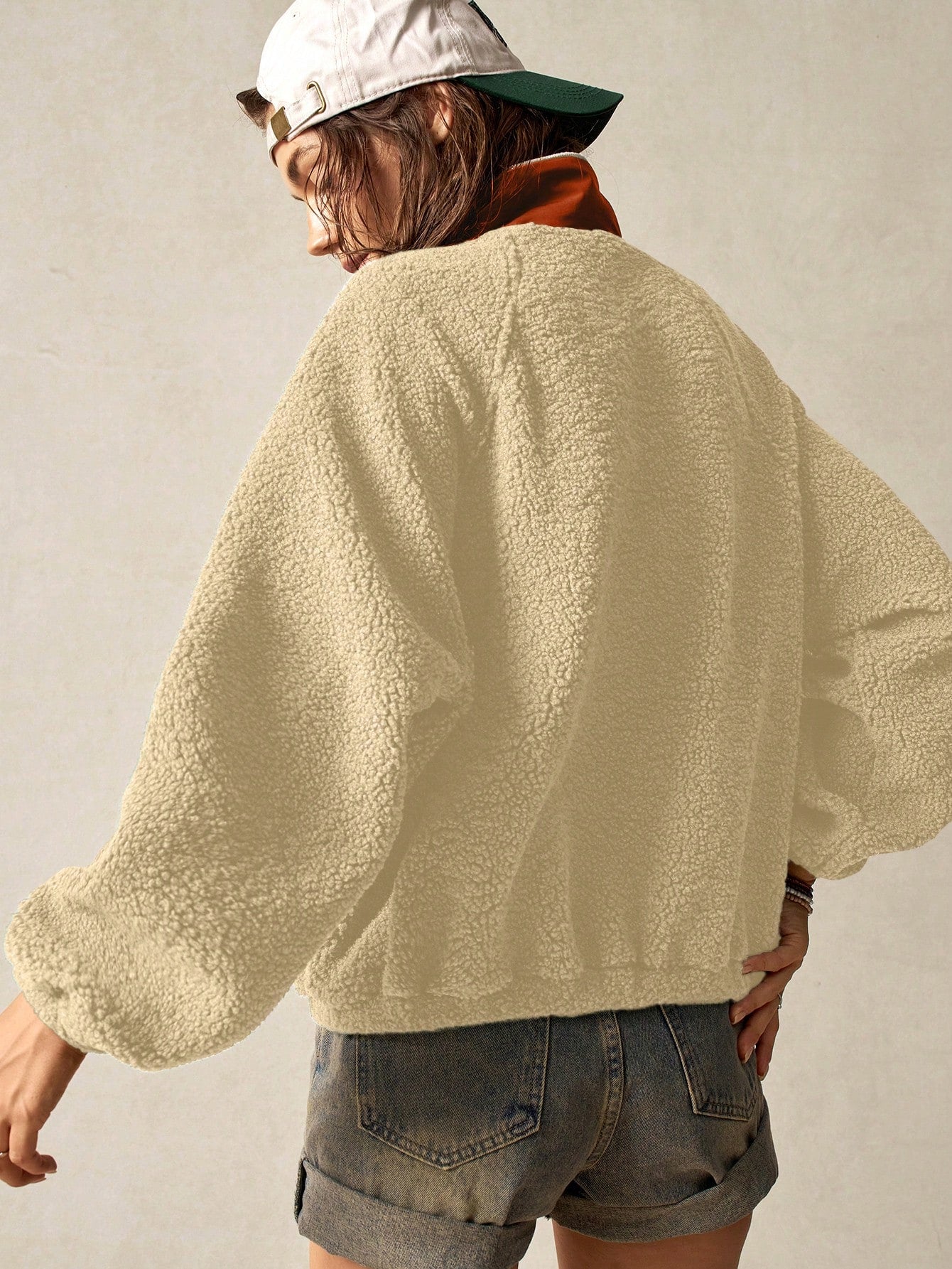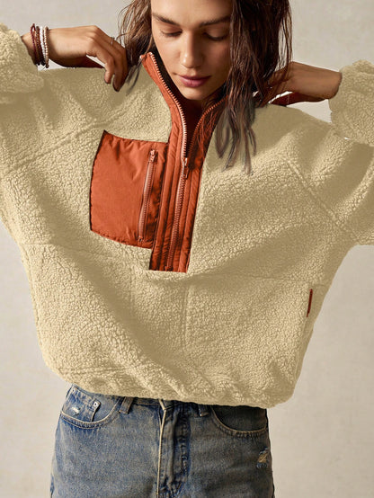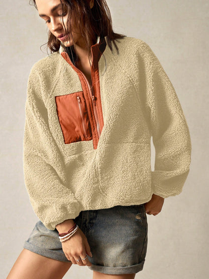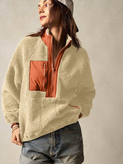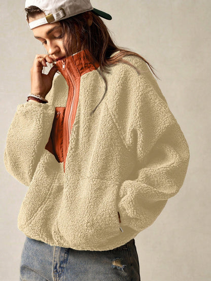 Bohemela Vacation Solid Color Knit Raglan Sleeve Long Sleeve Half-Zip Loose Women Sweatshirt