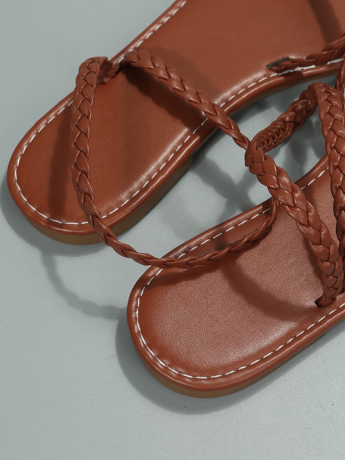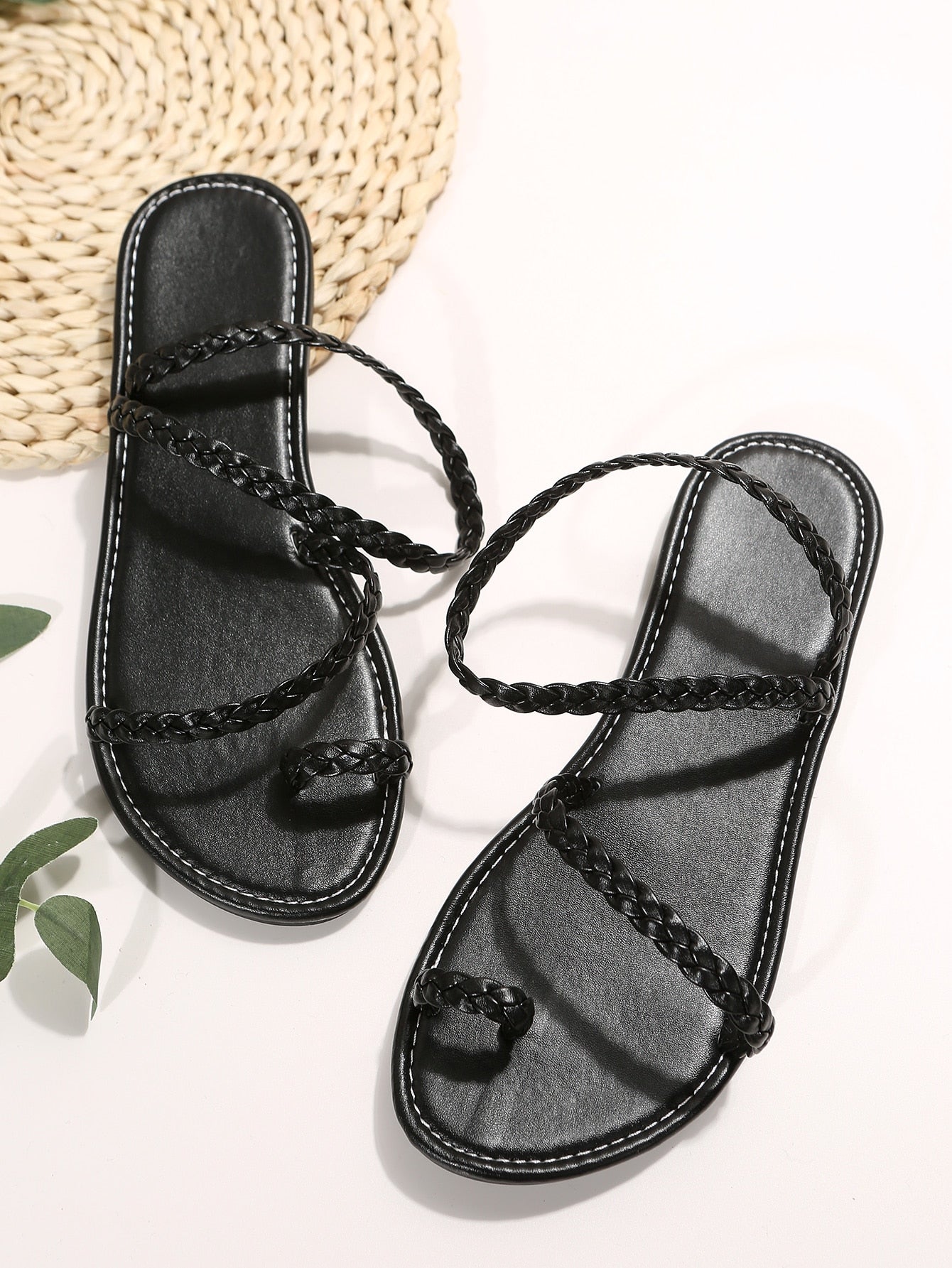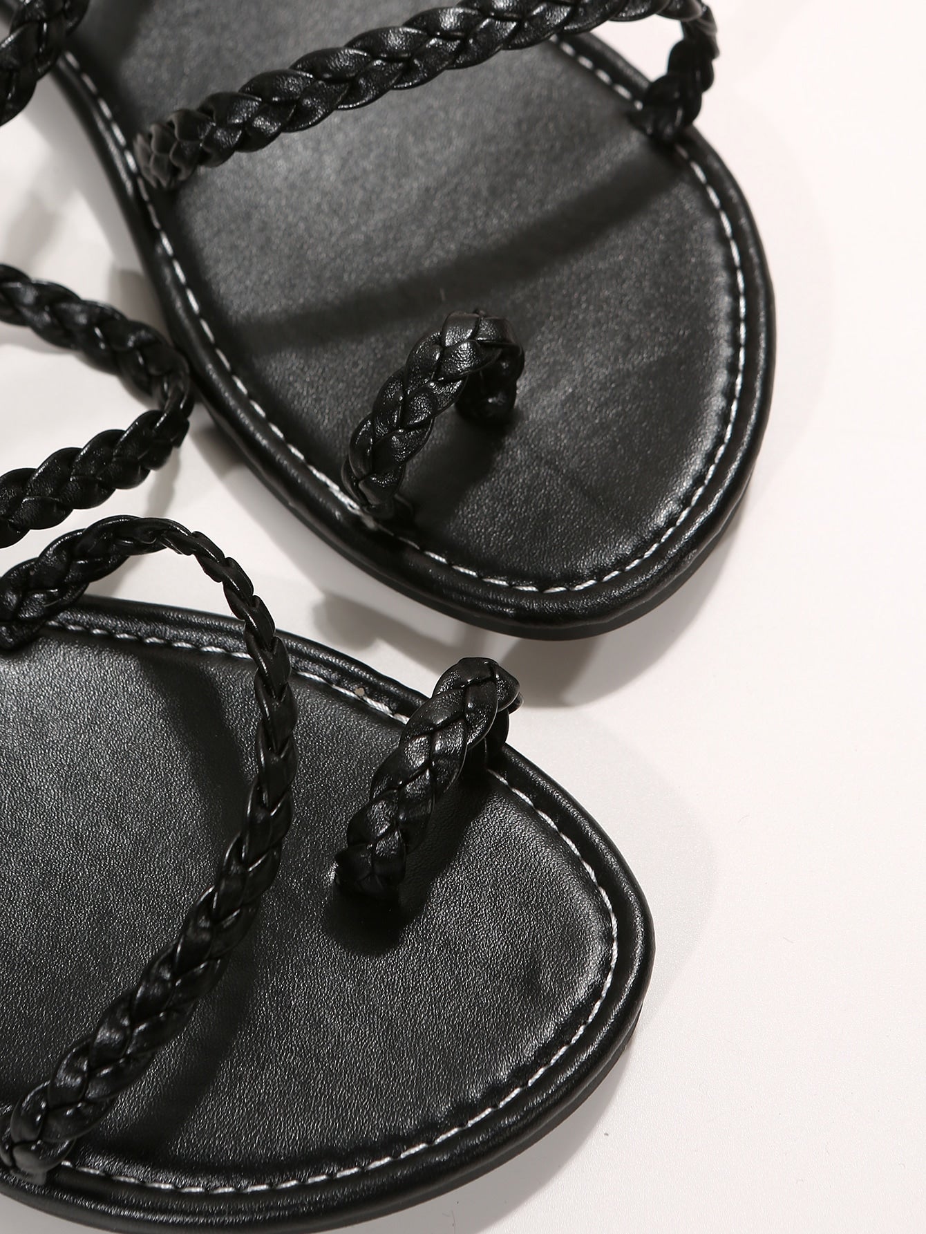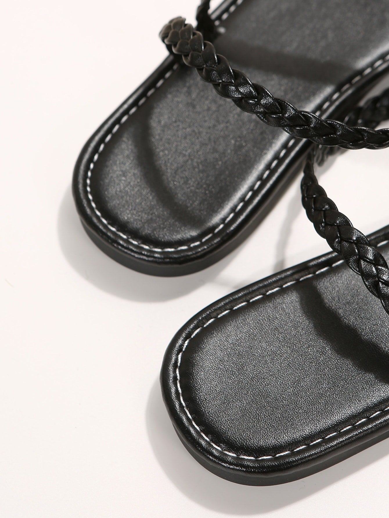 Braided Detail Plain Artificial Leather Toe Post Flat Sandals