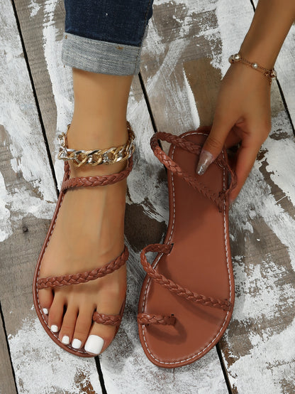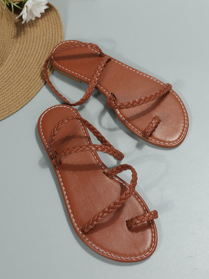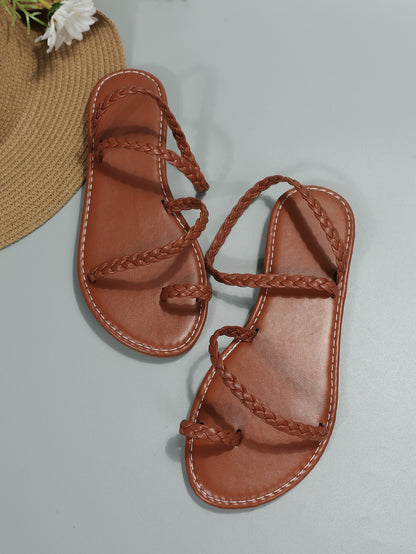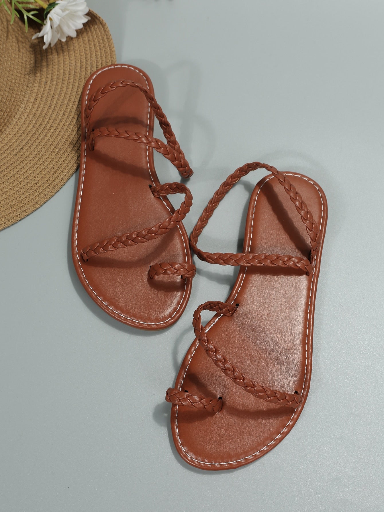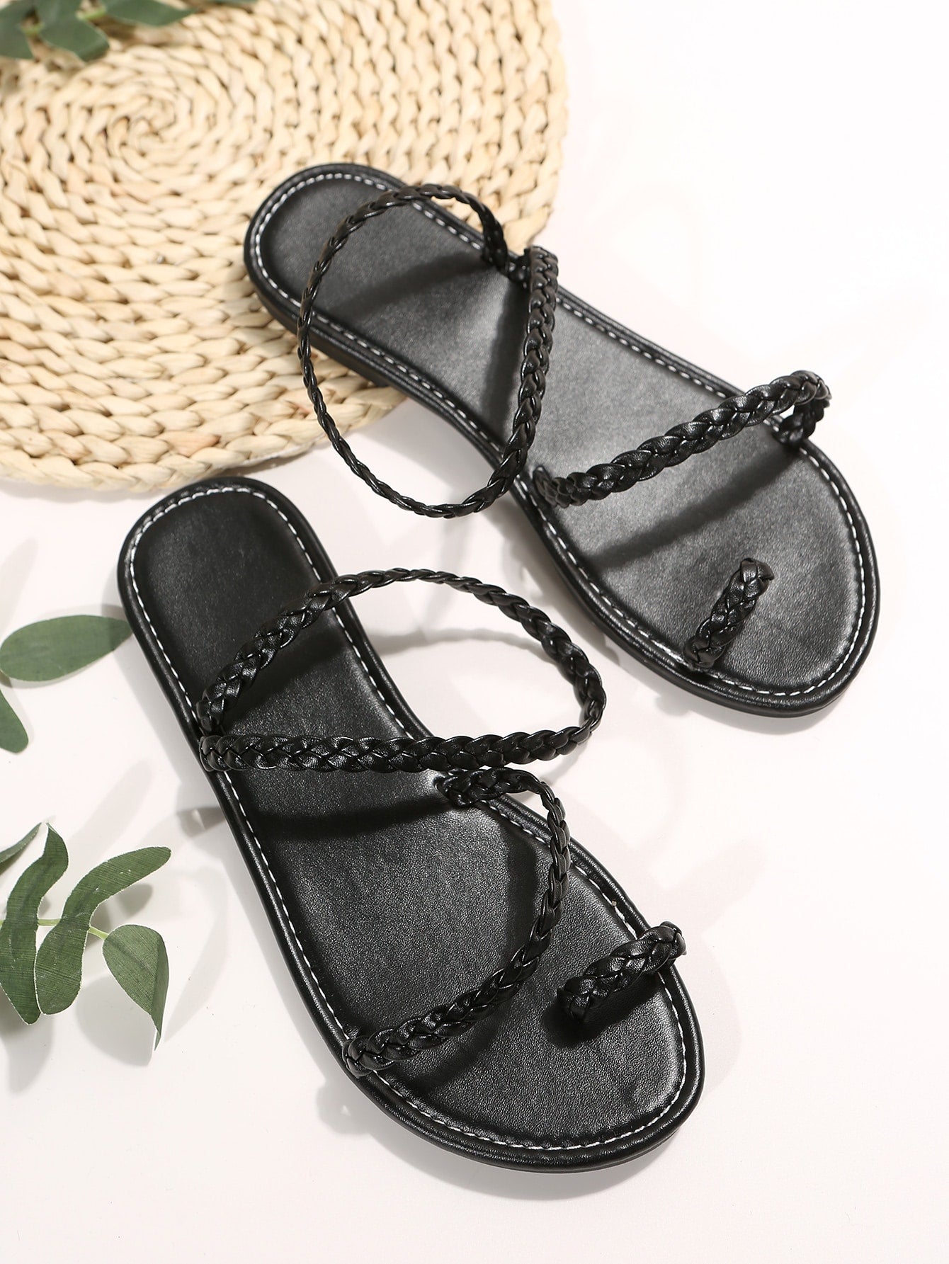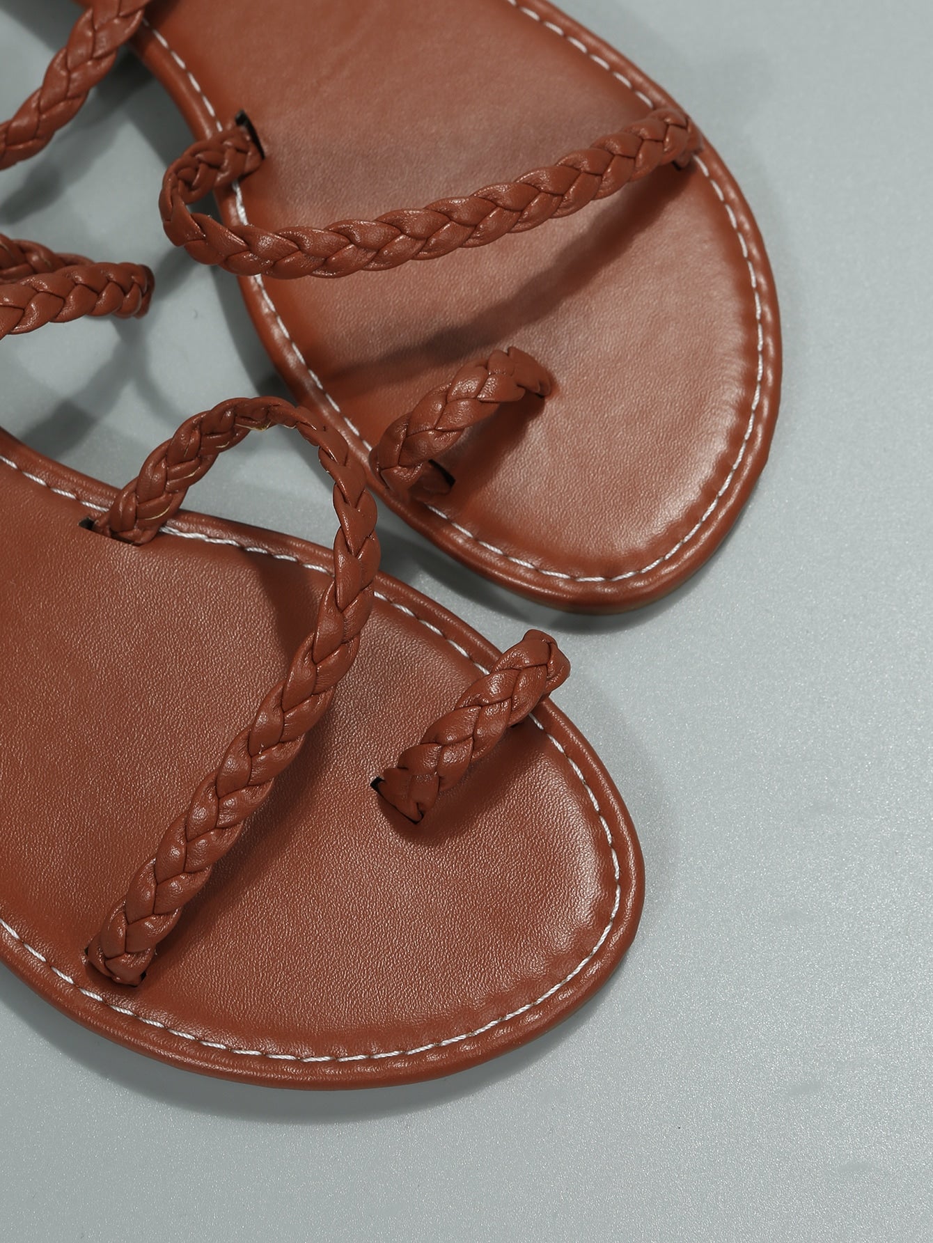 Braided Detail Plain Artificial Leather Toe Post Flat Sandals