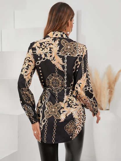 Chain And Baroque Print Curved Hem Button Up Blouse