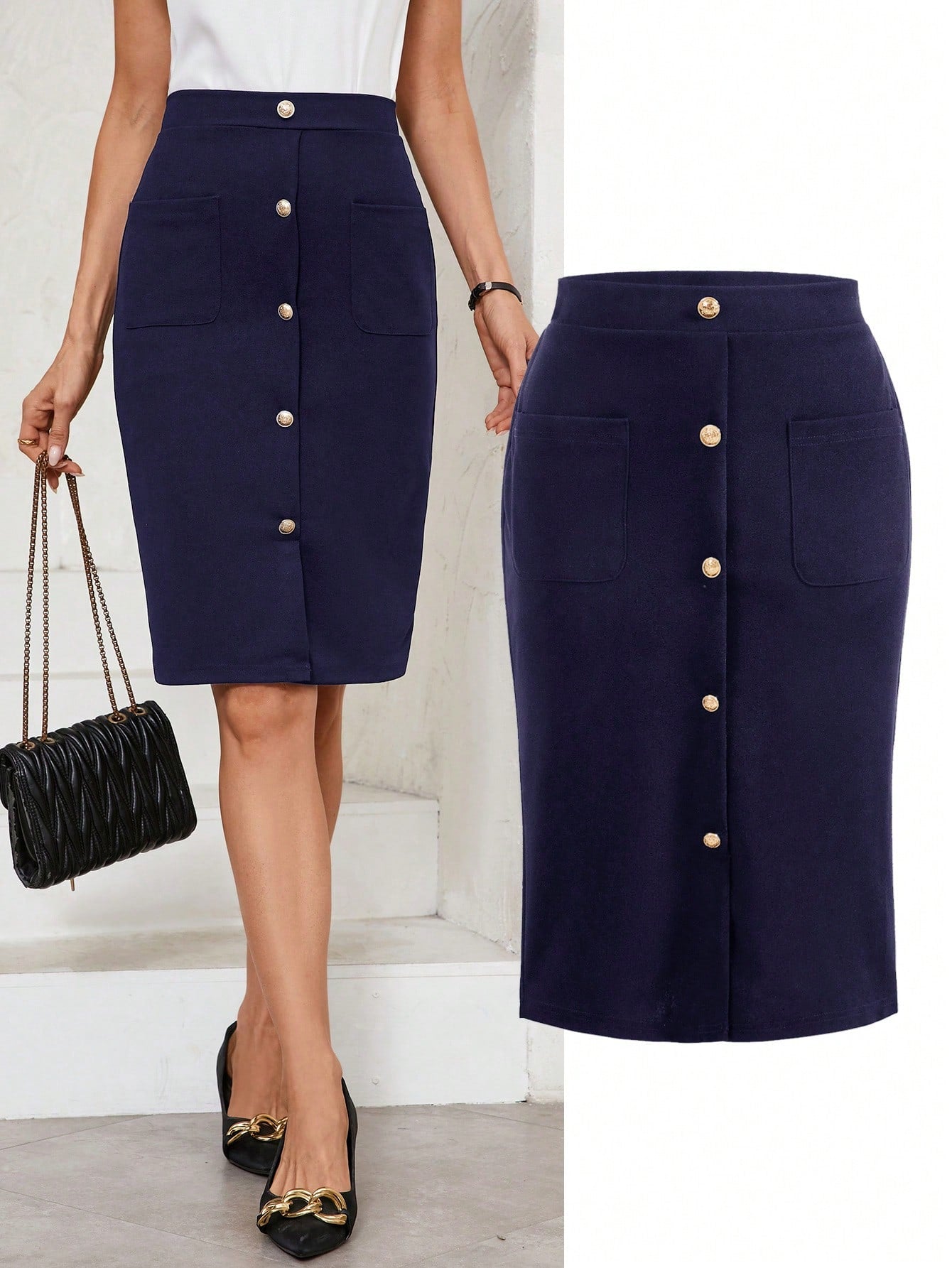 Clasi Women's Simple Metal Button Front Fitted Casual Skirt