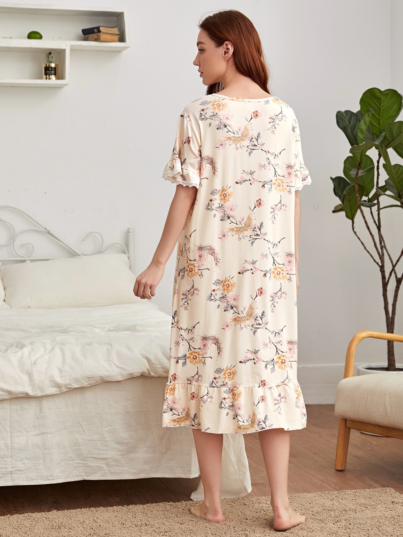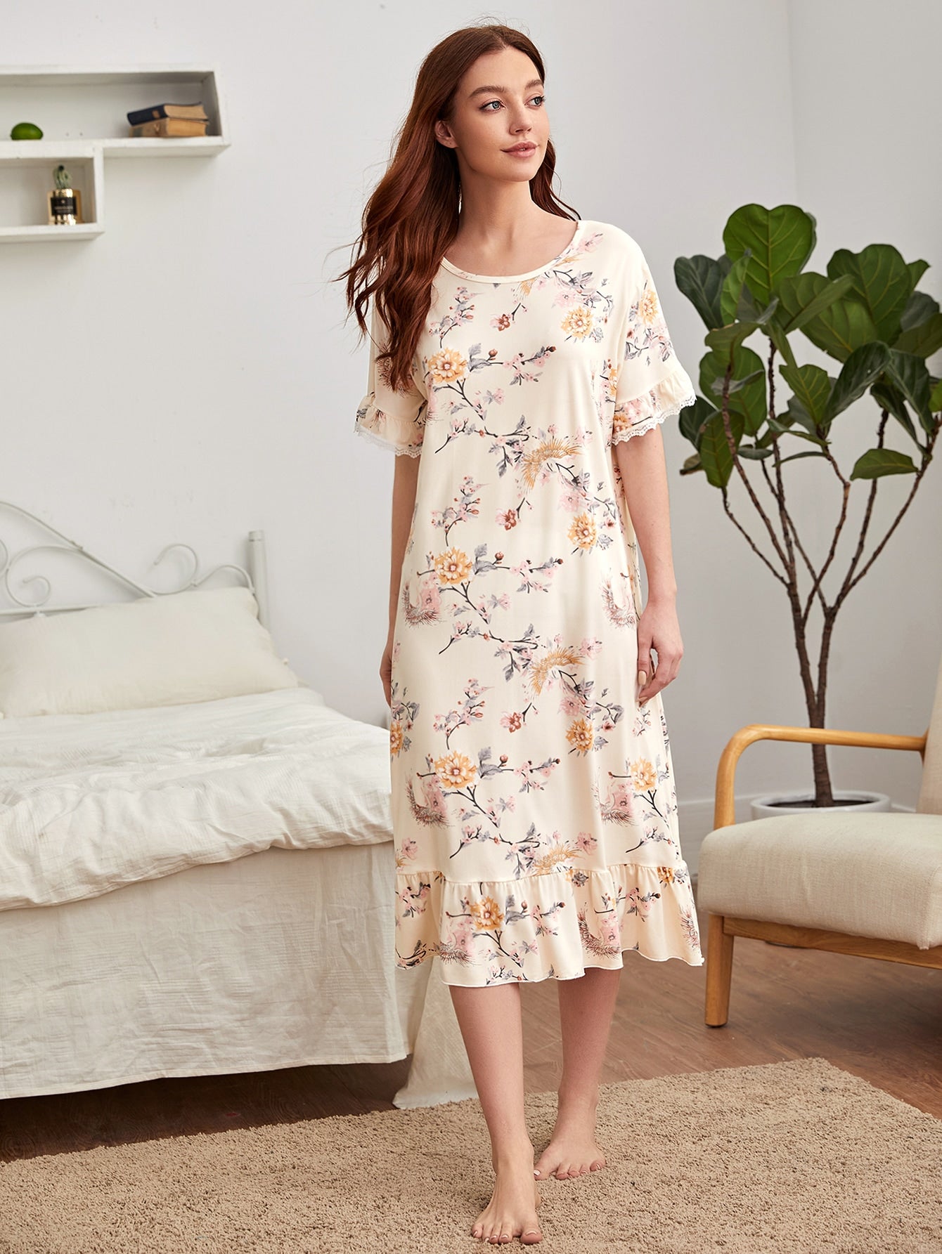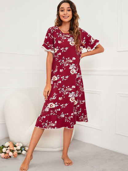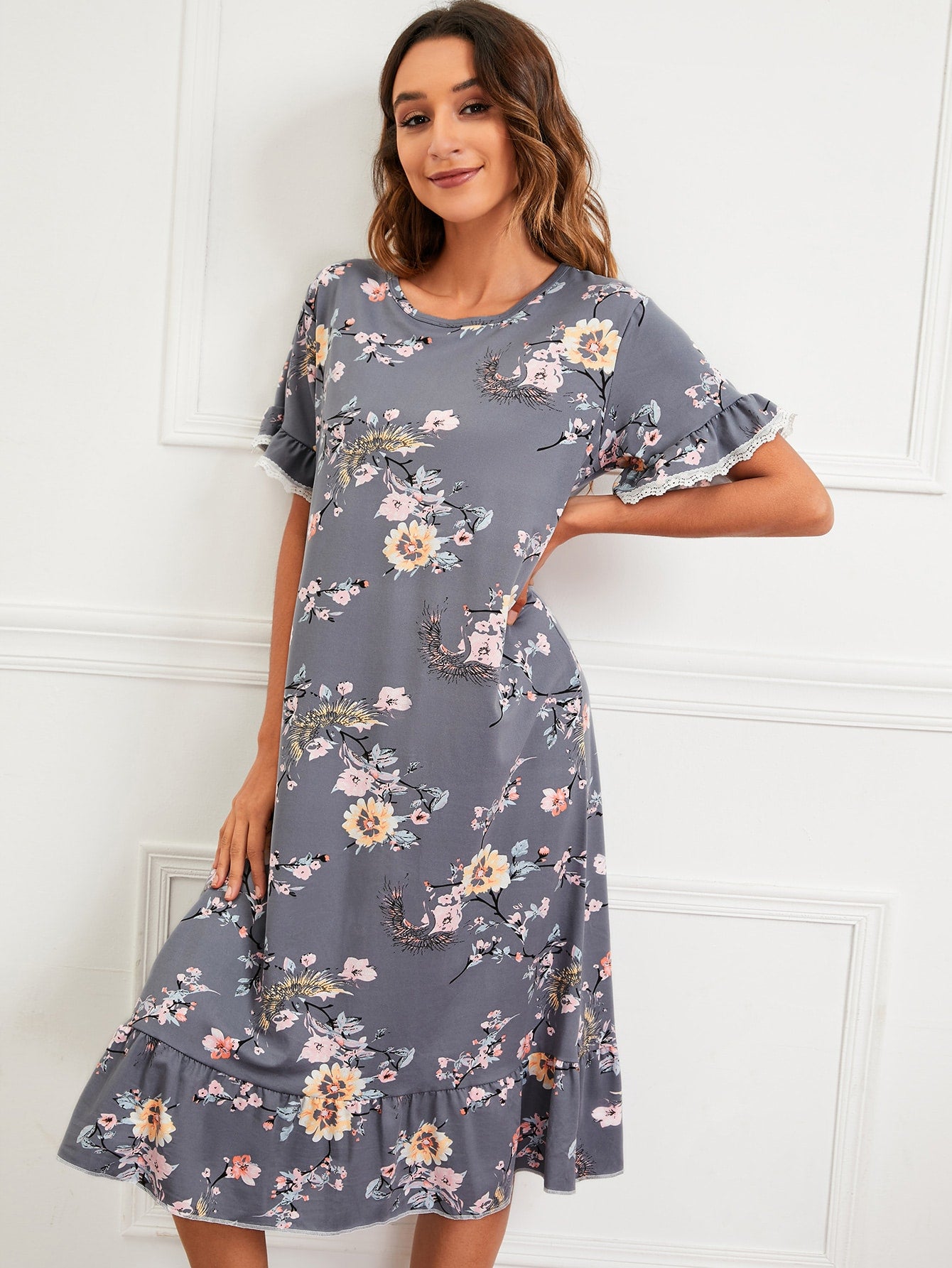 Contrast Lace Floral Print Ruffle Hem Night Dress