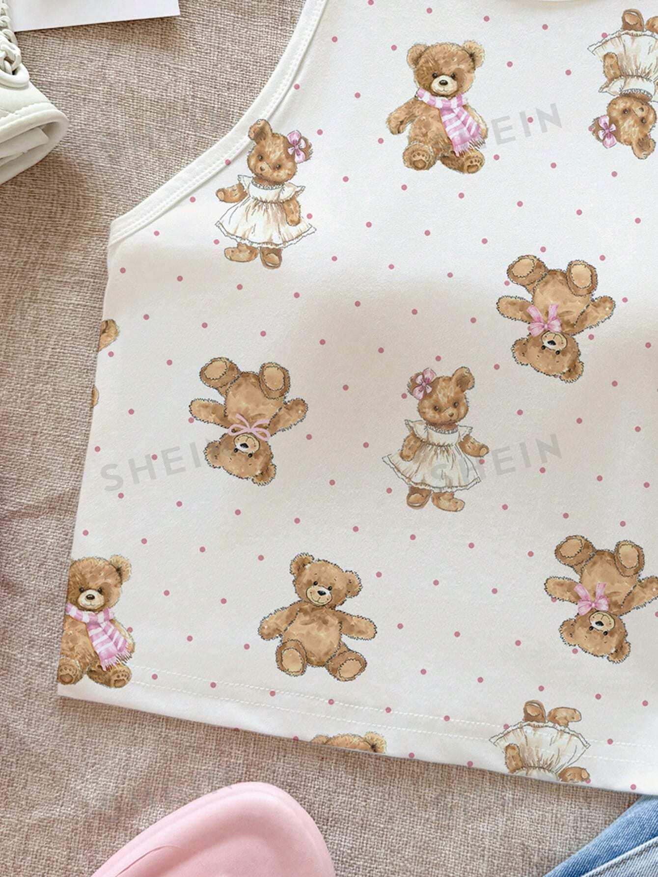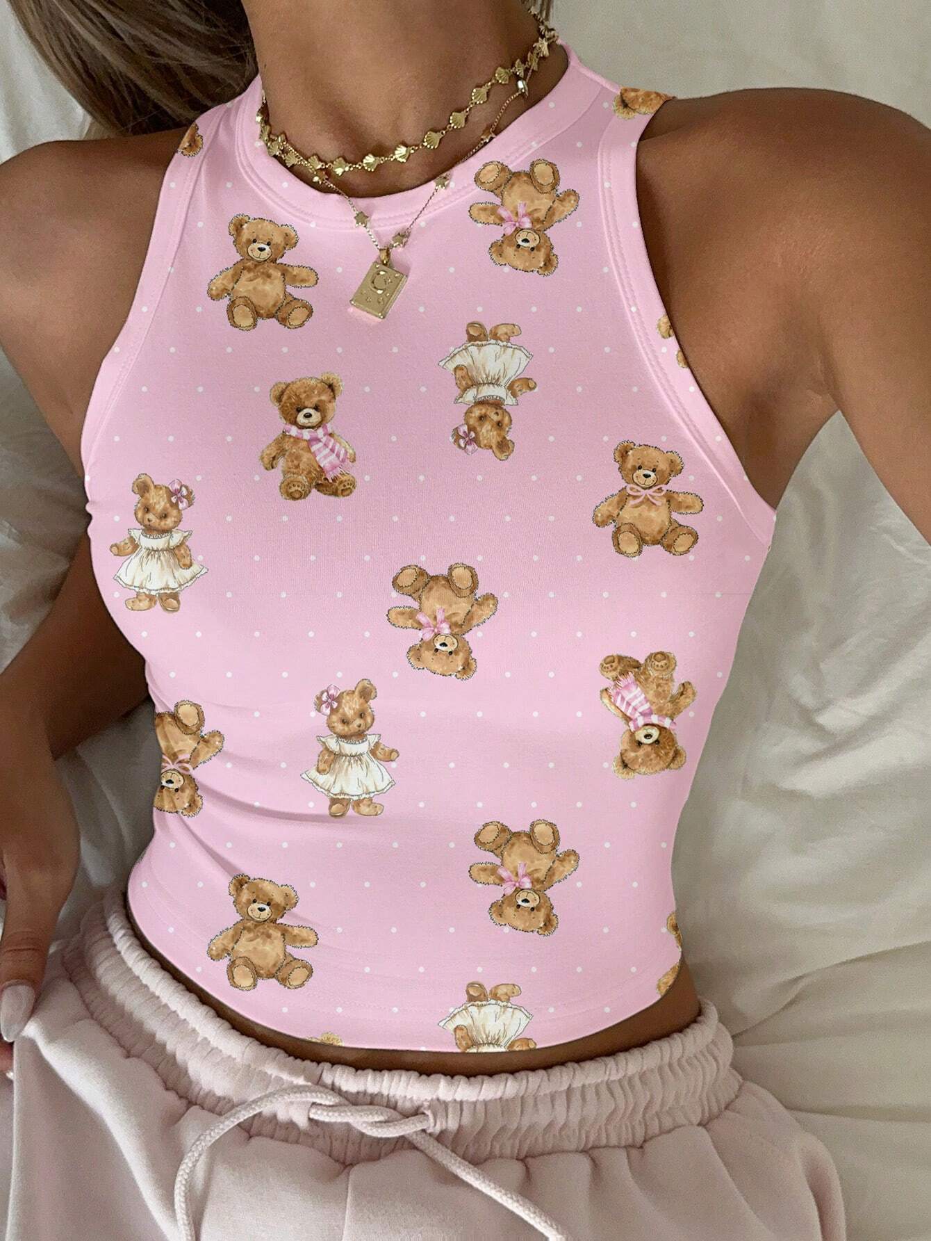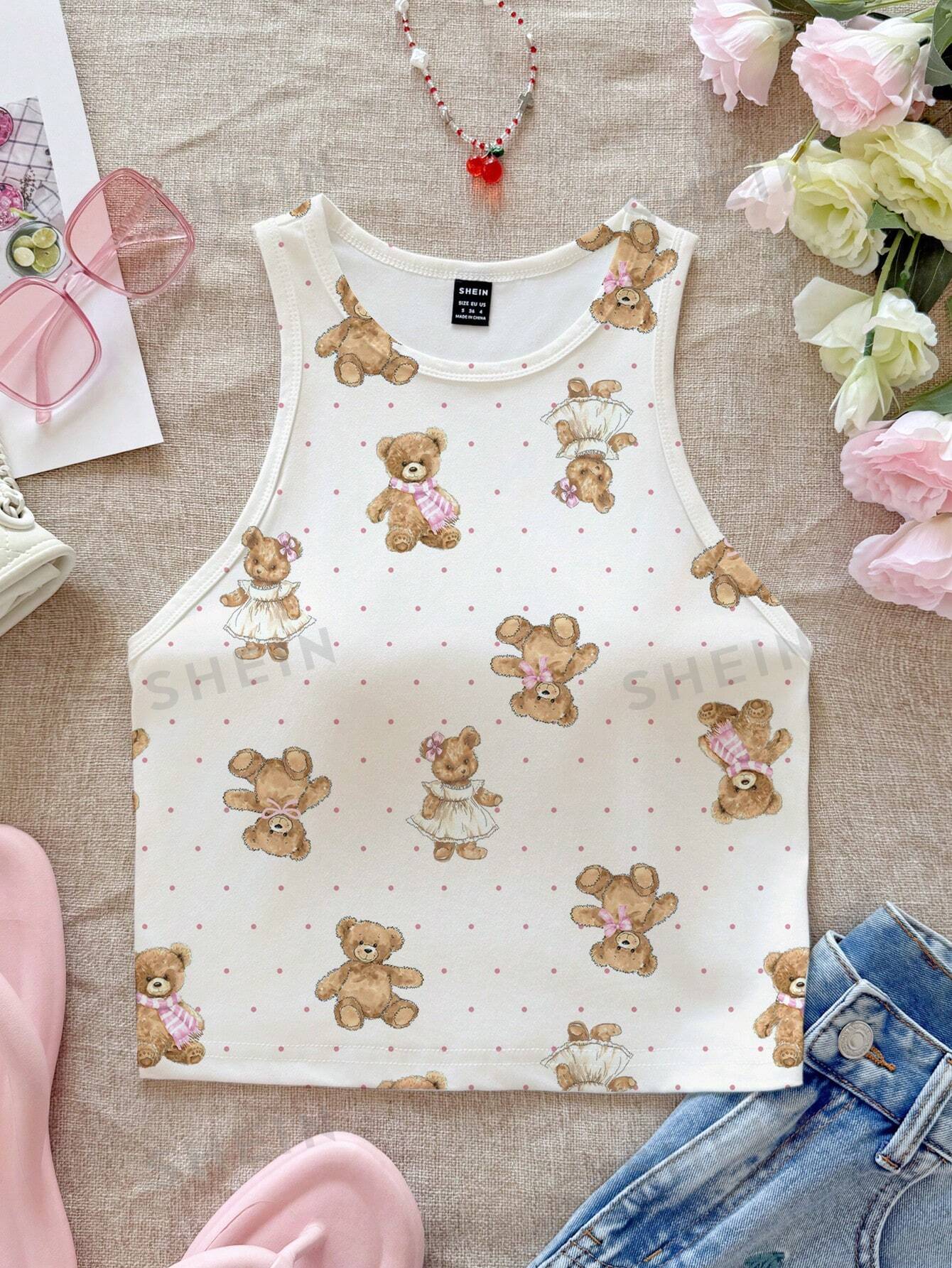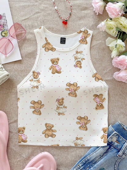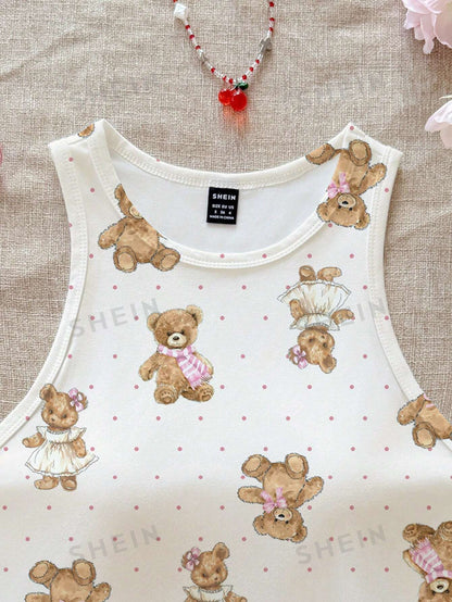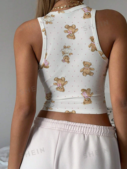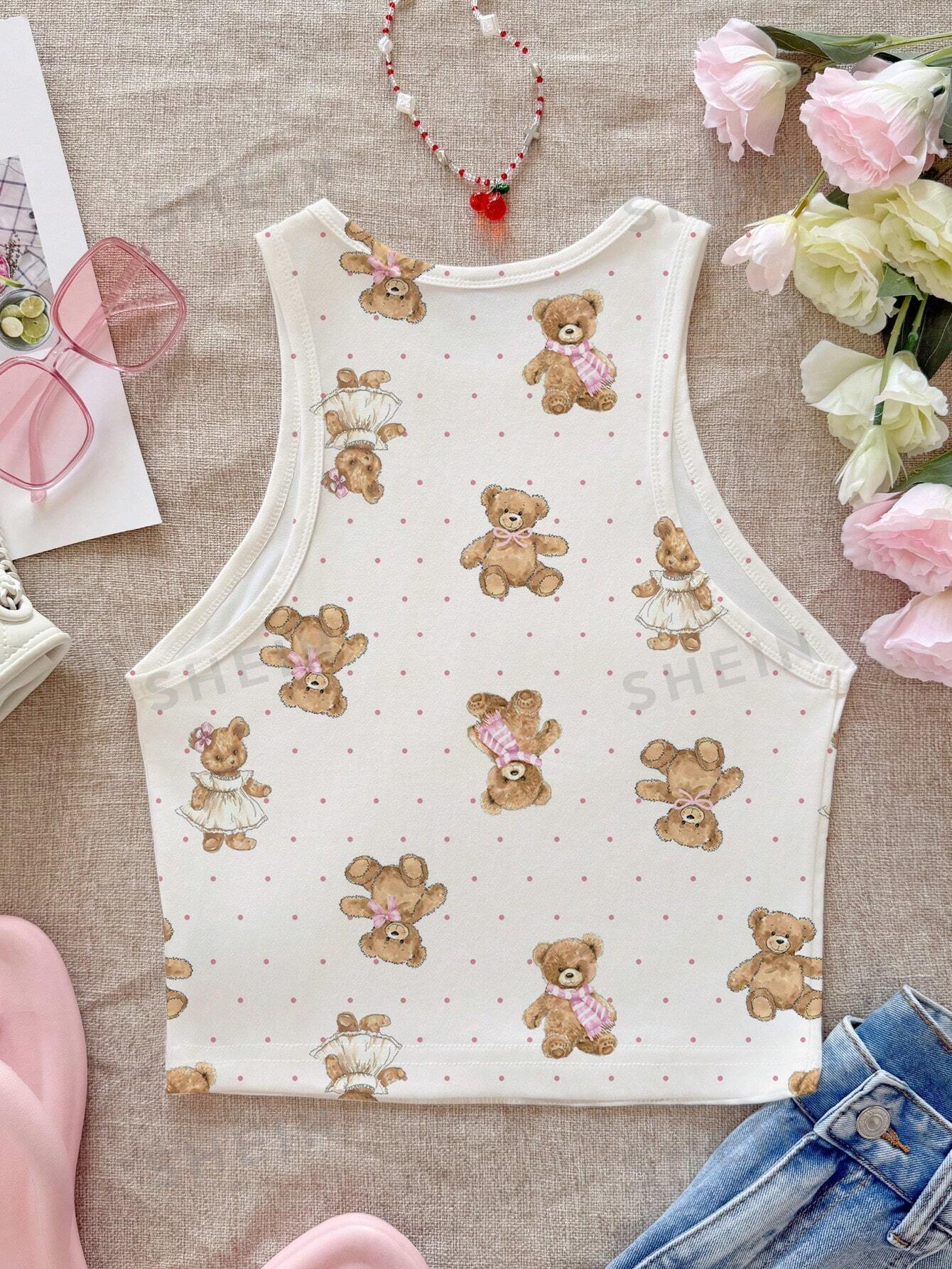 CovetEZ Casual Simple Cartoon Polka Dot Bear Print Round Neck Slim Fit Women Camisole
