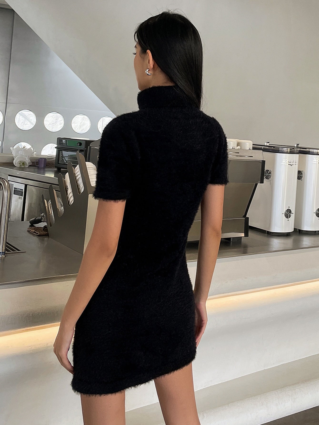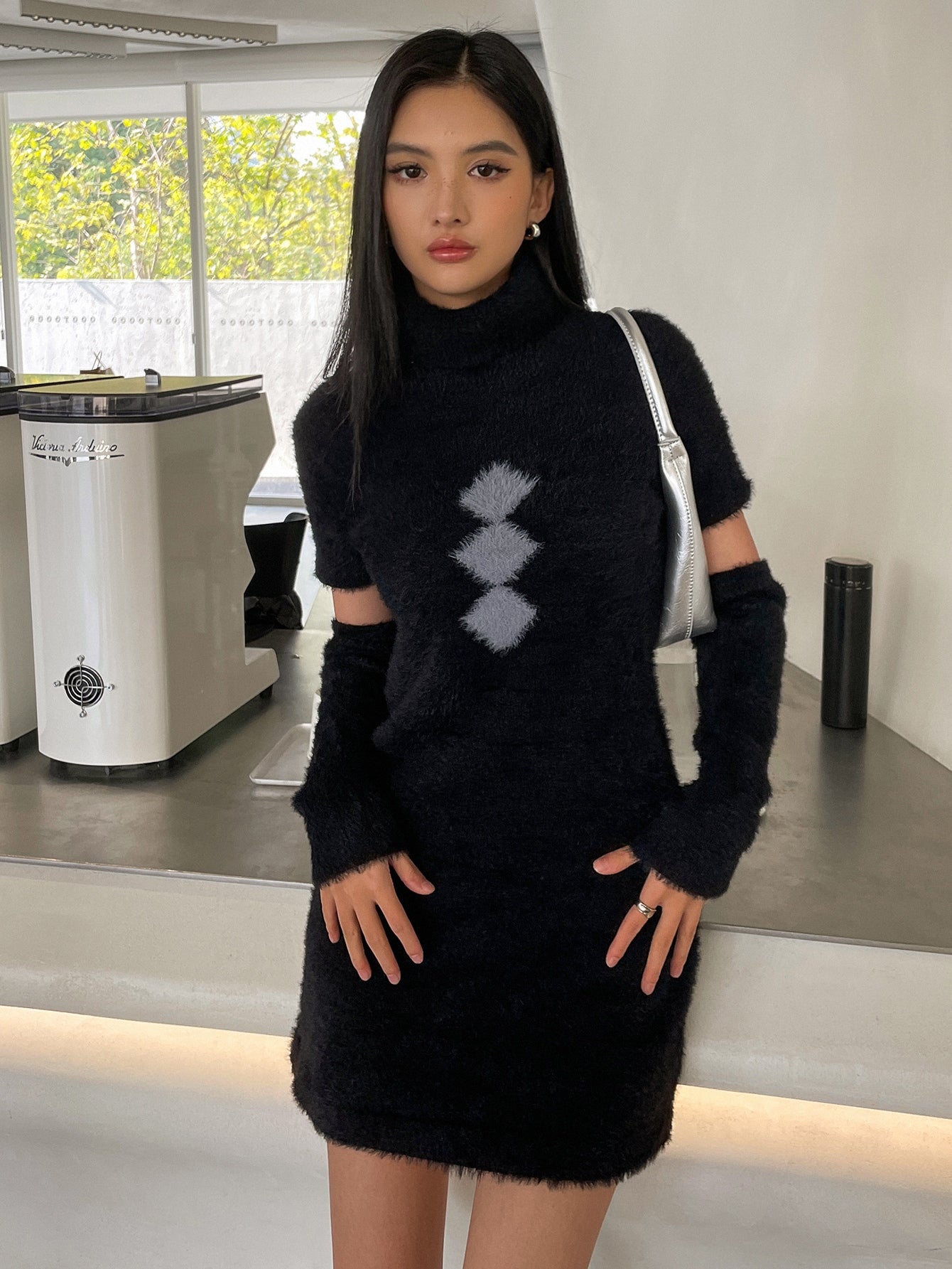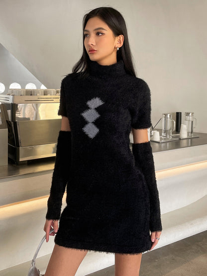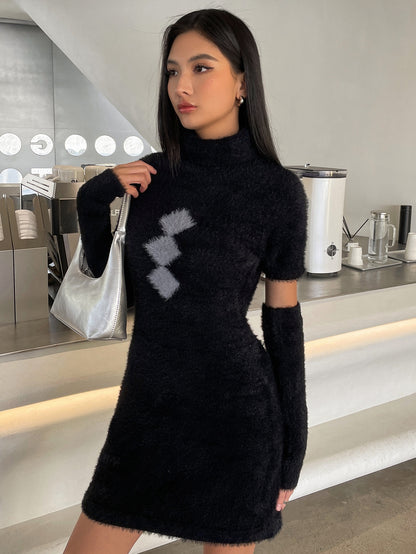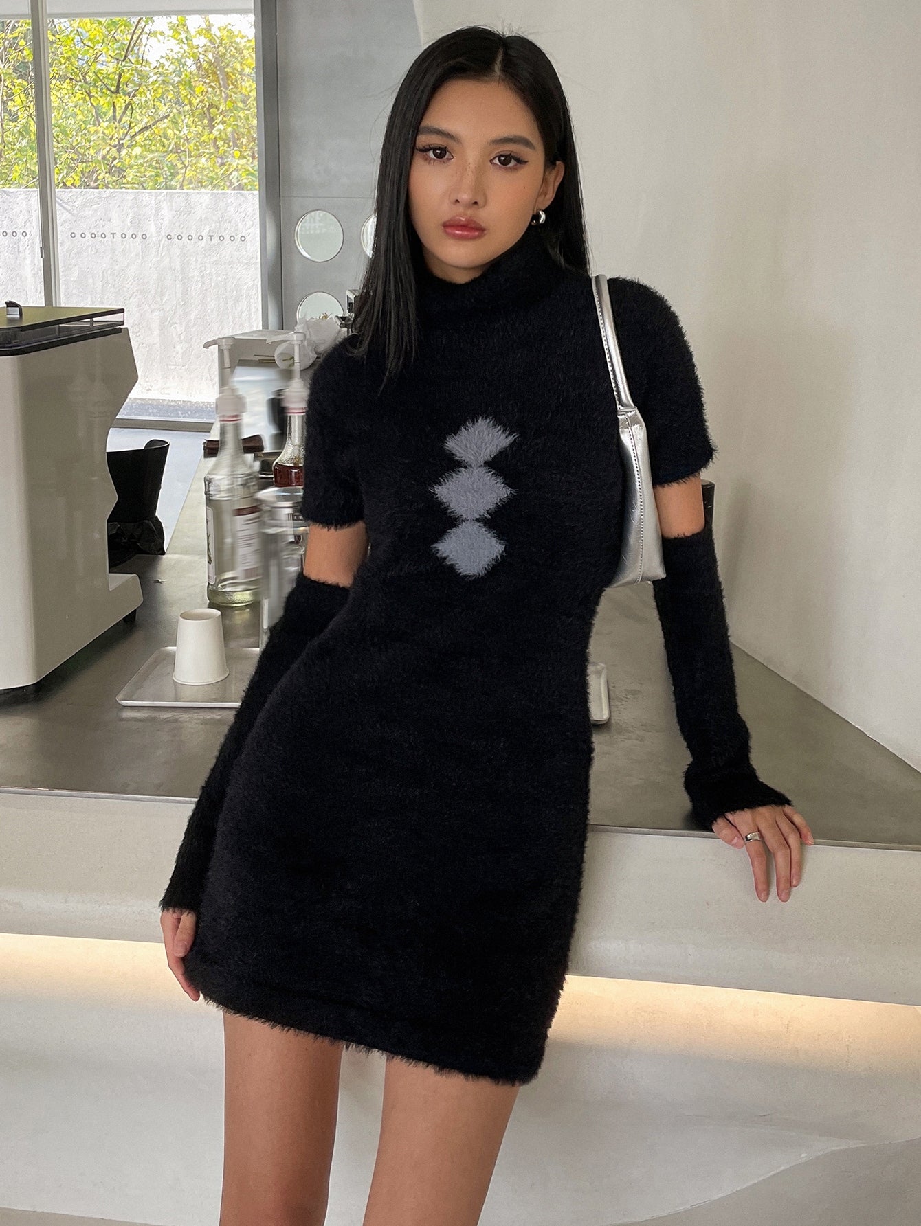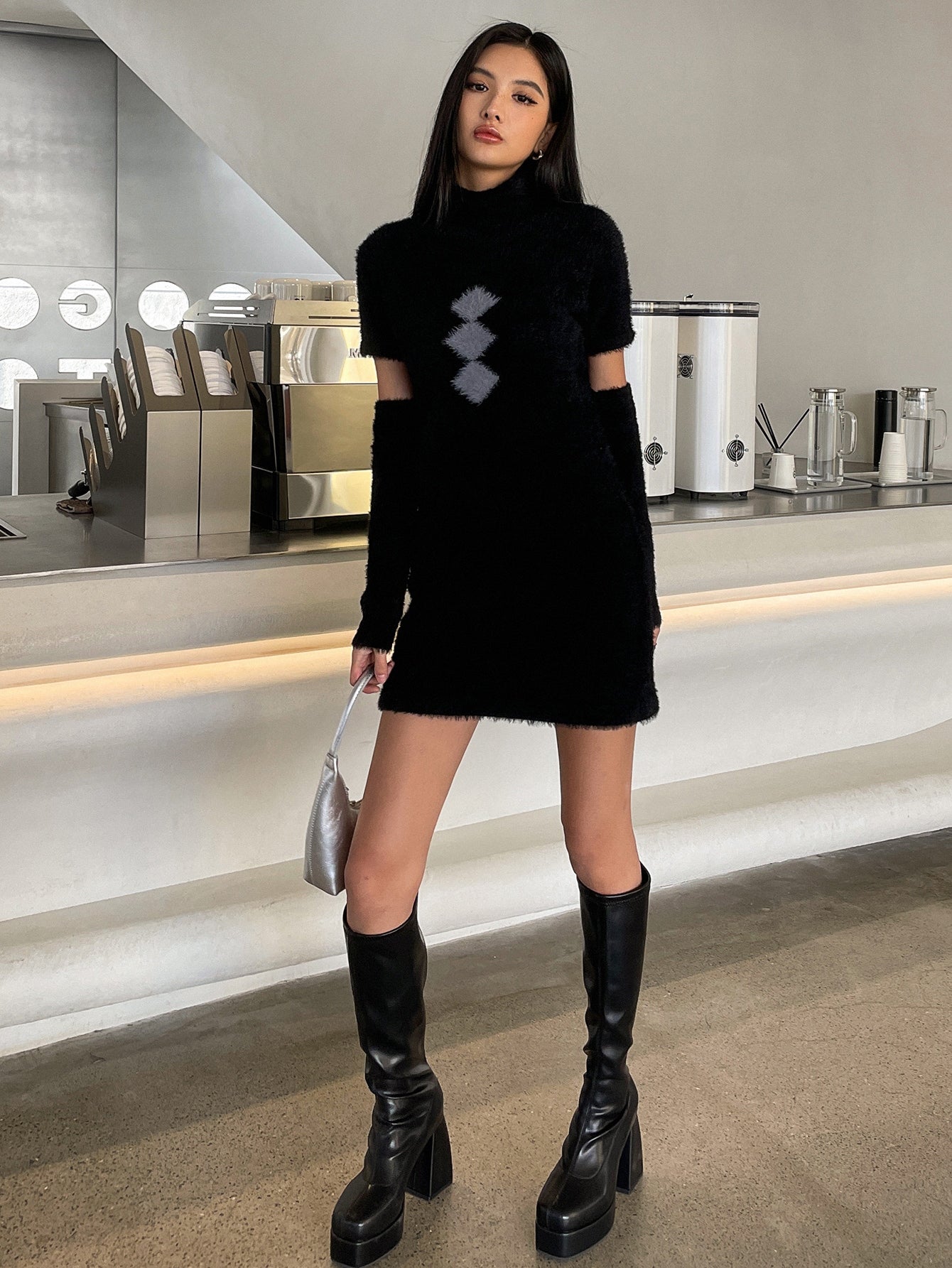 DAZY Argyle Pattern Turtleneck Fuzzy Knit Dress With Arm Sleeves