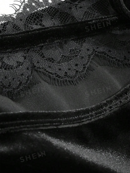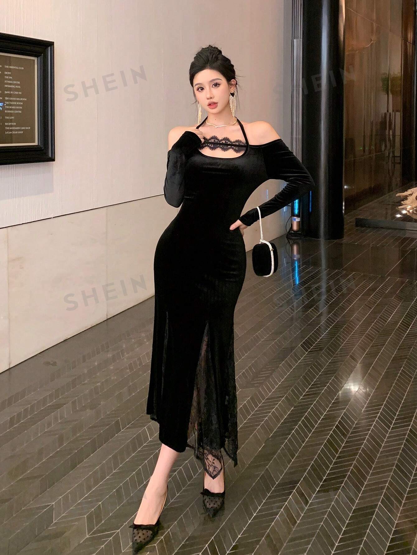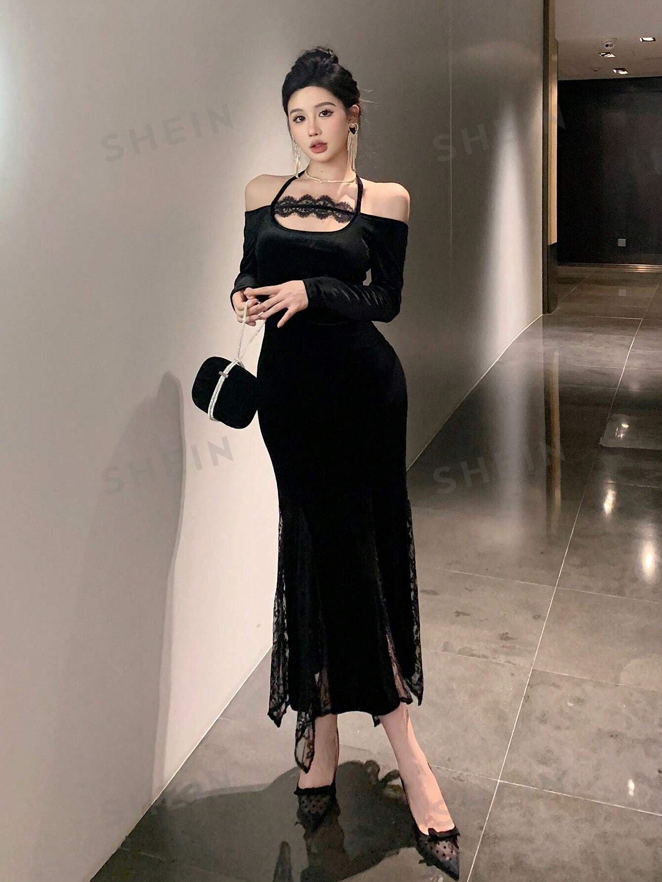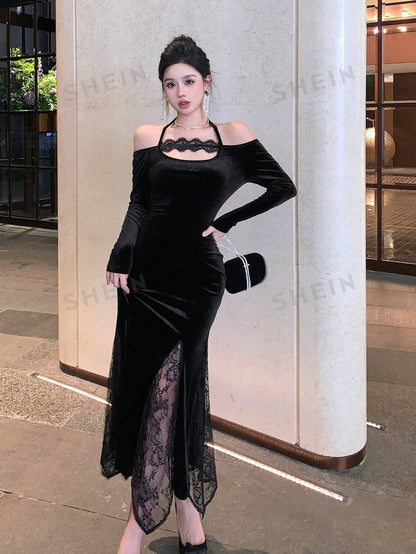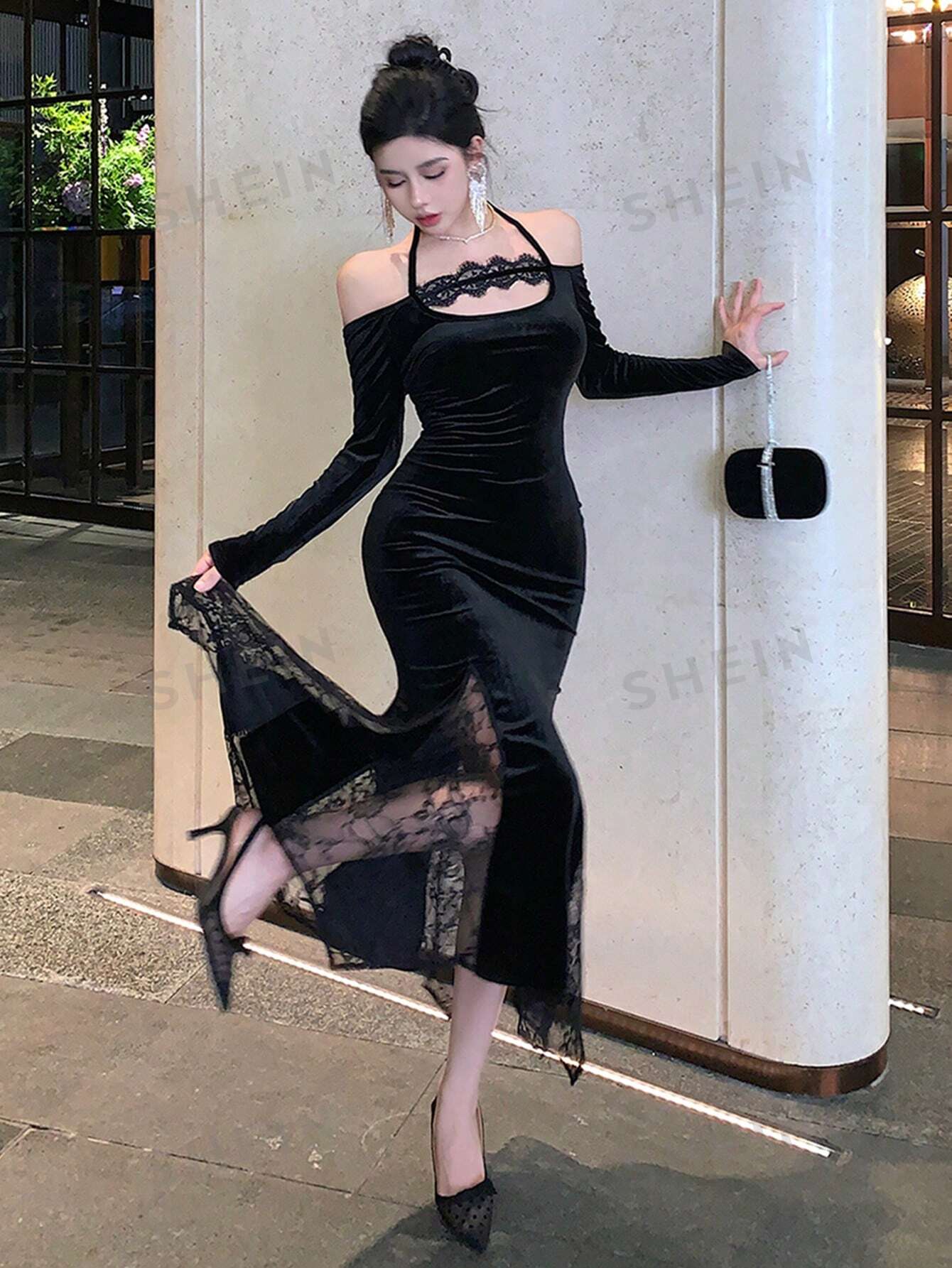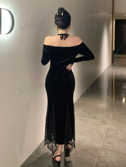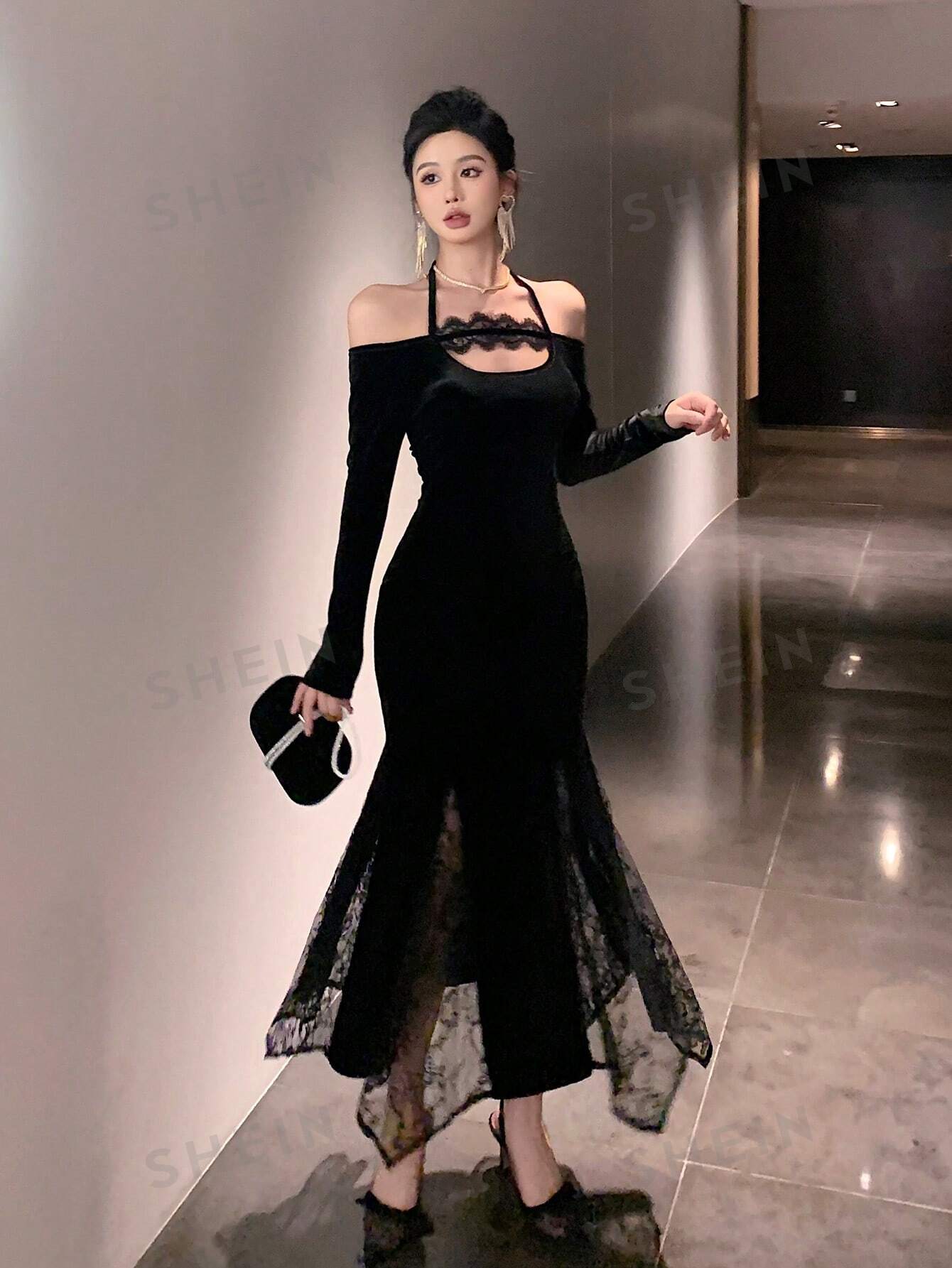 DAZY Women Lace Splice Halter Tied Fishtail Midi Dress