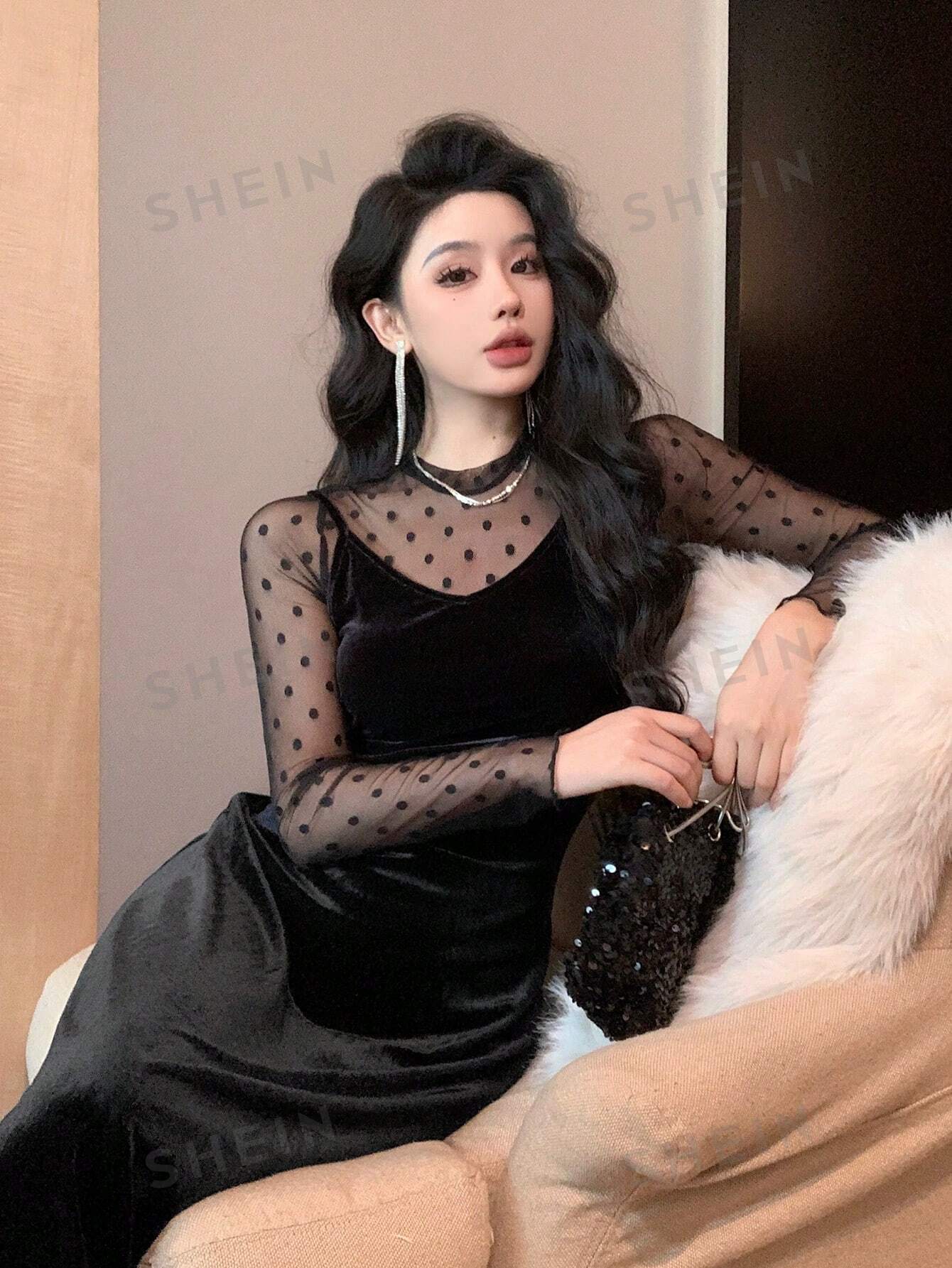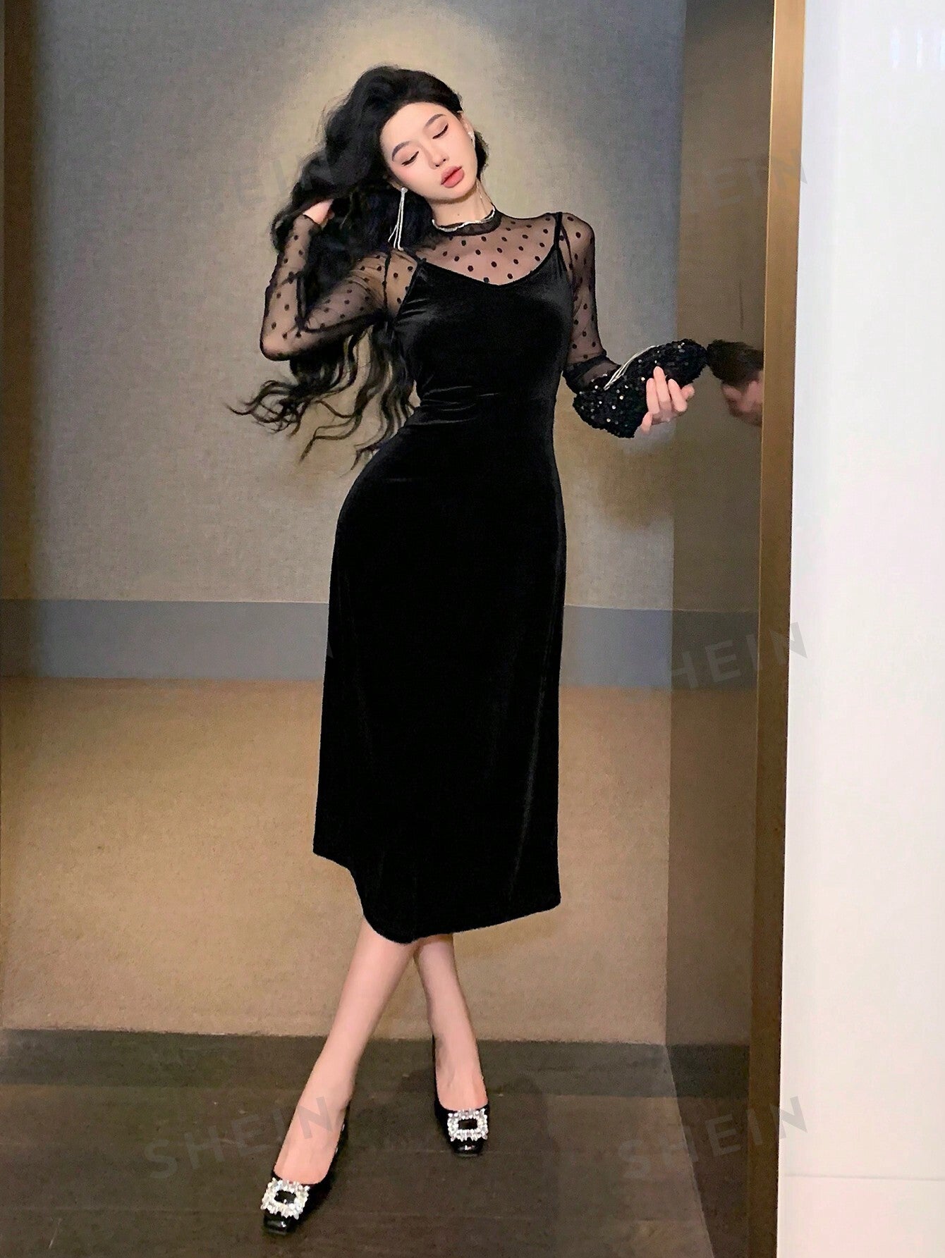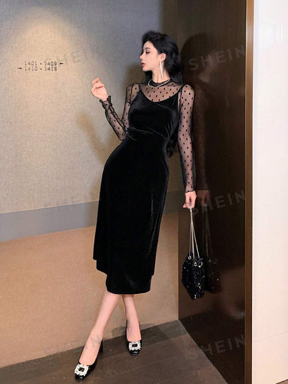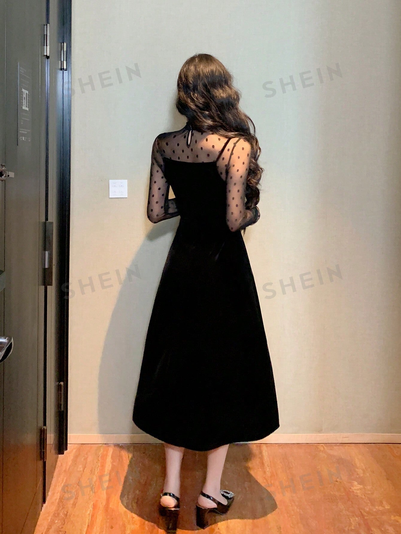 DAZY Women's Velvet Party Ball Gown Patchwork Polka Dot Mesh Spliced Long Sleeve Black Dress