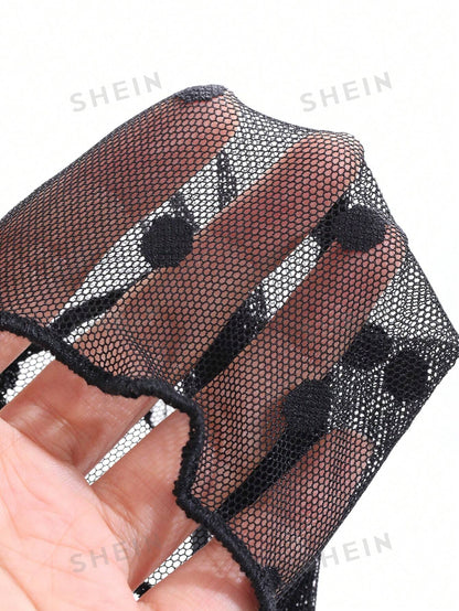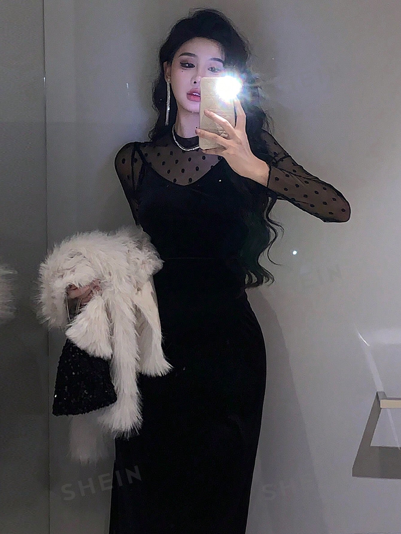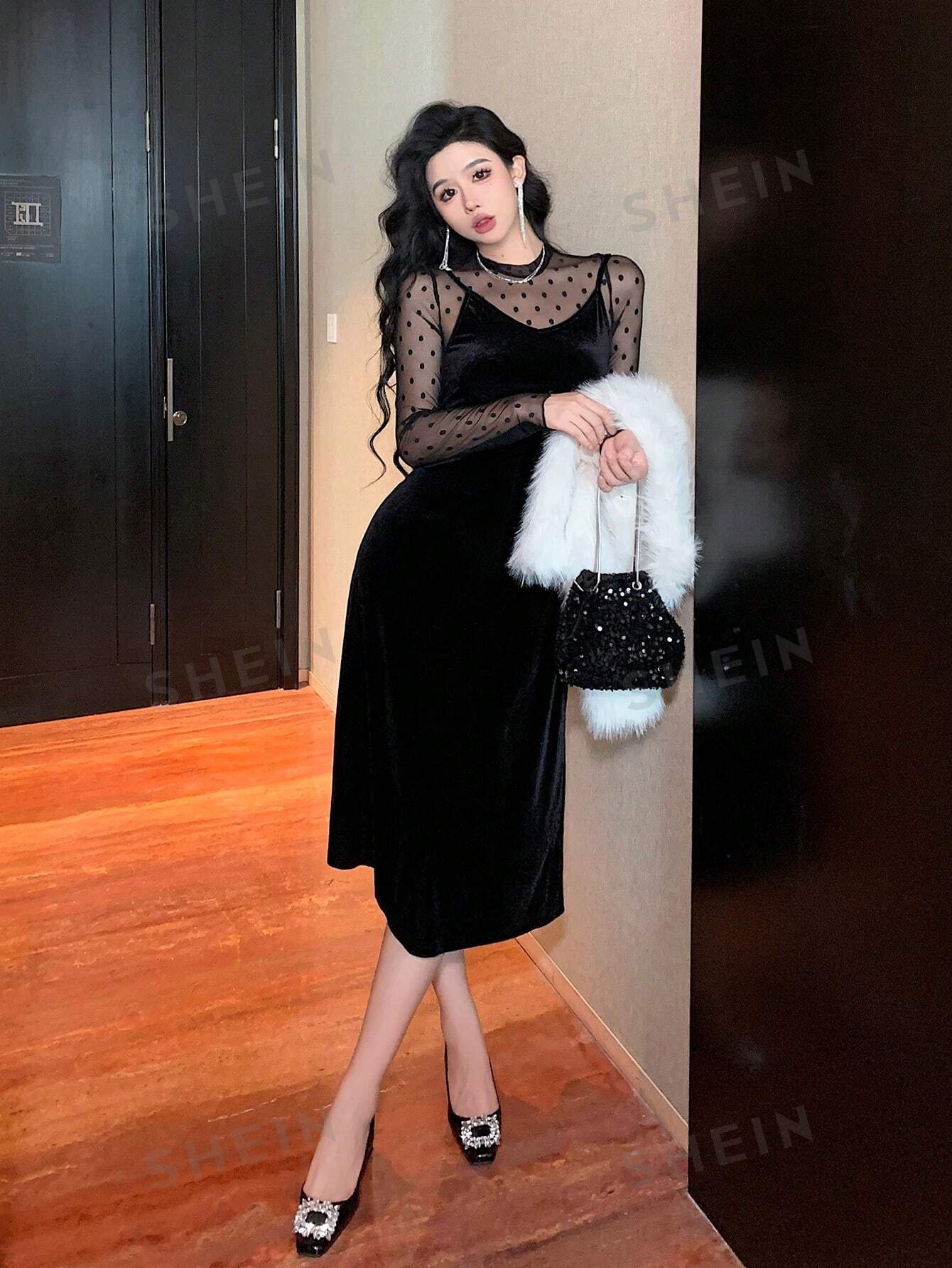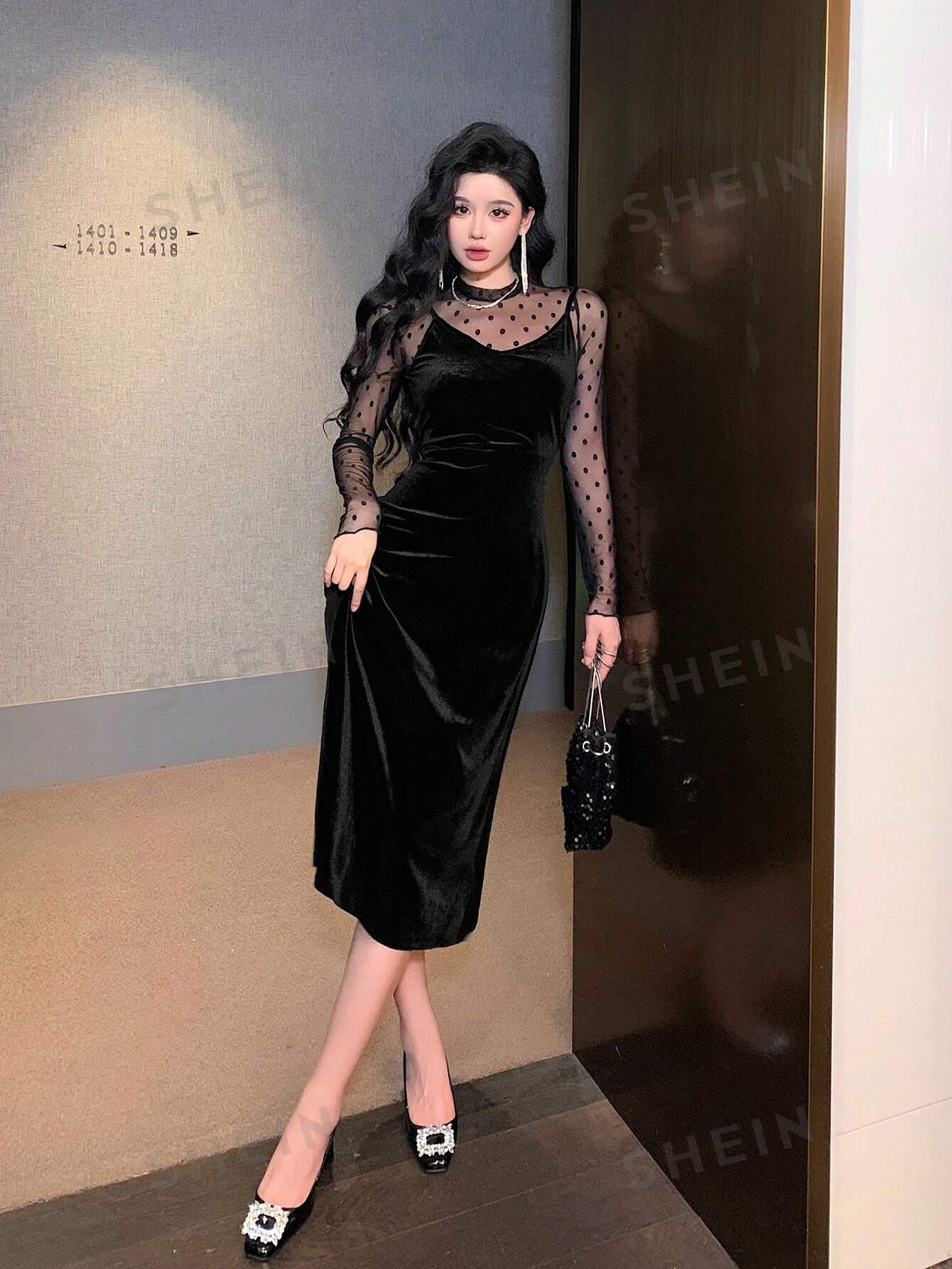 DAZY Women's Velvet Party Ball Gown Patchwork Polka Dot Mesh Spliced Long Sleeve Black Dress