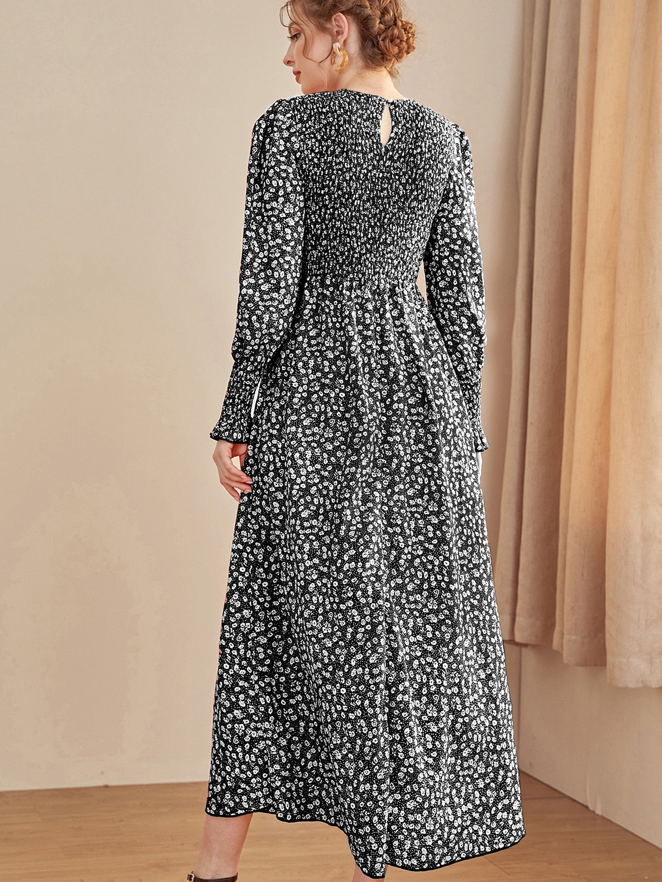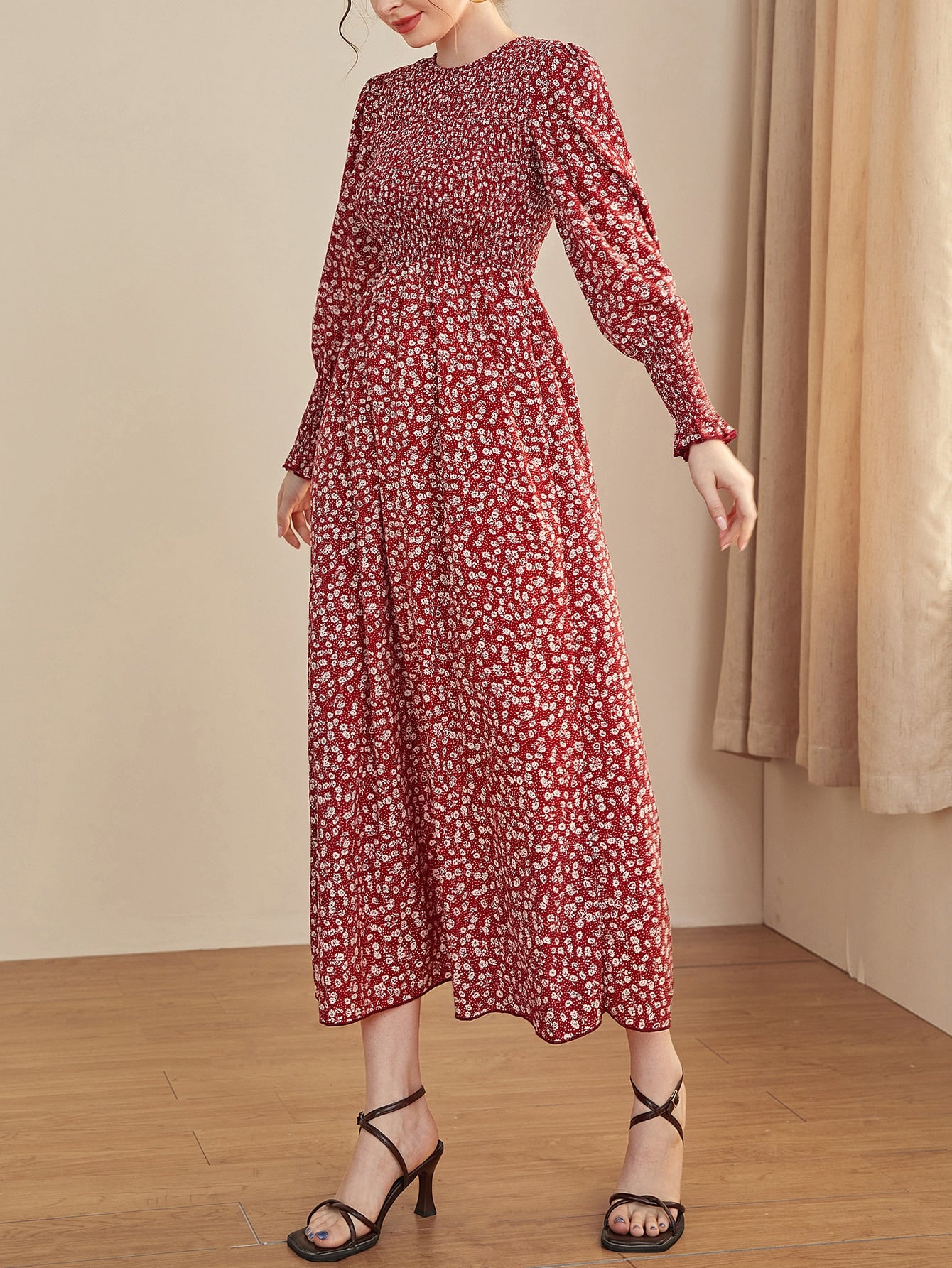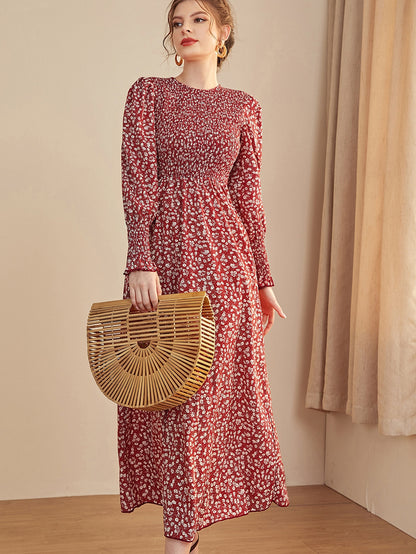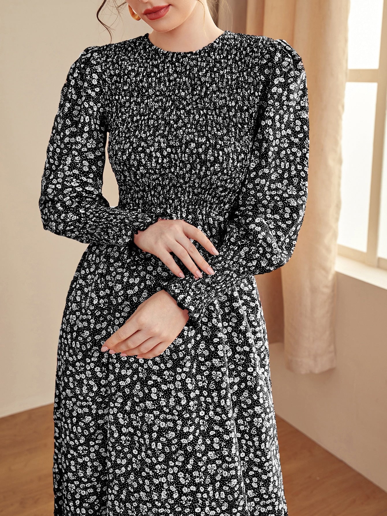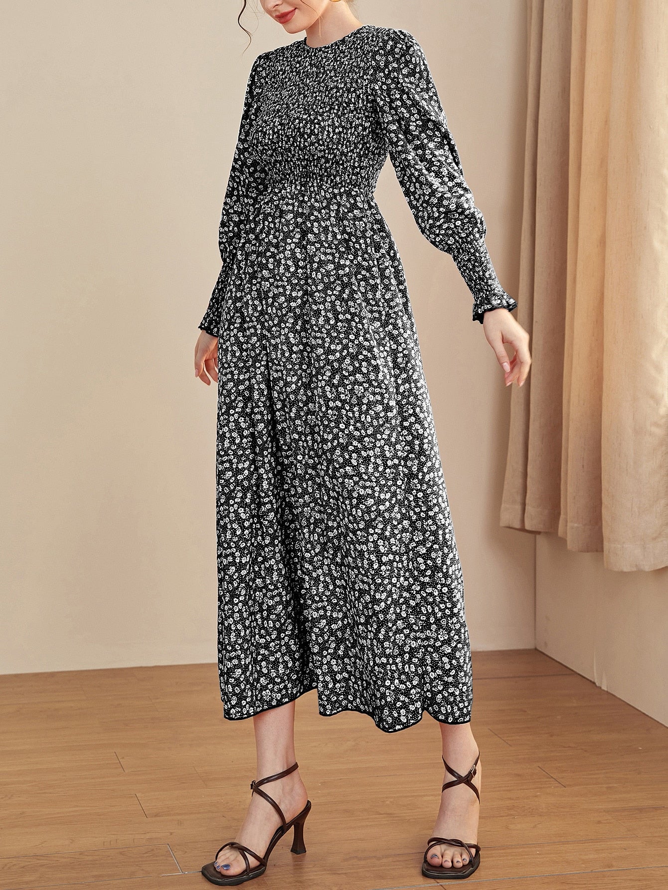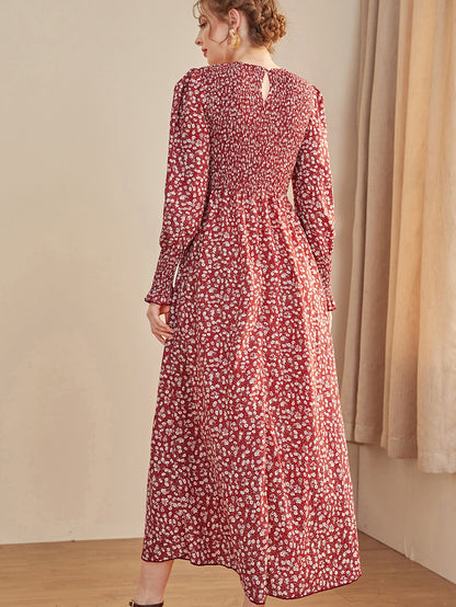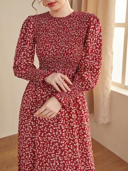 Ditsy Floral Puff Sleeve Shirred A-line Dress
