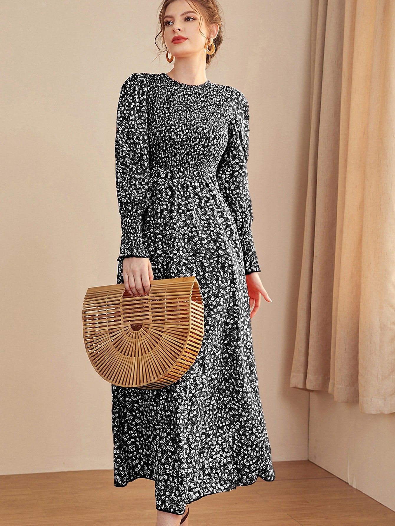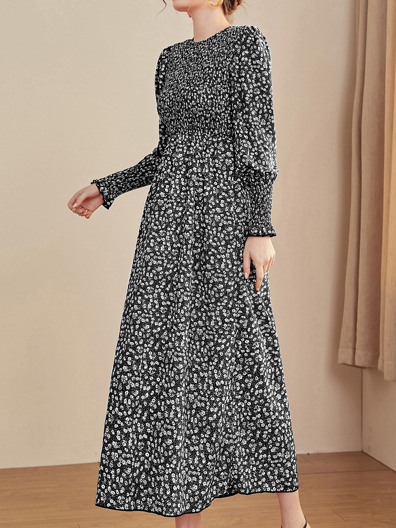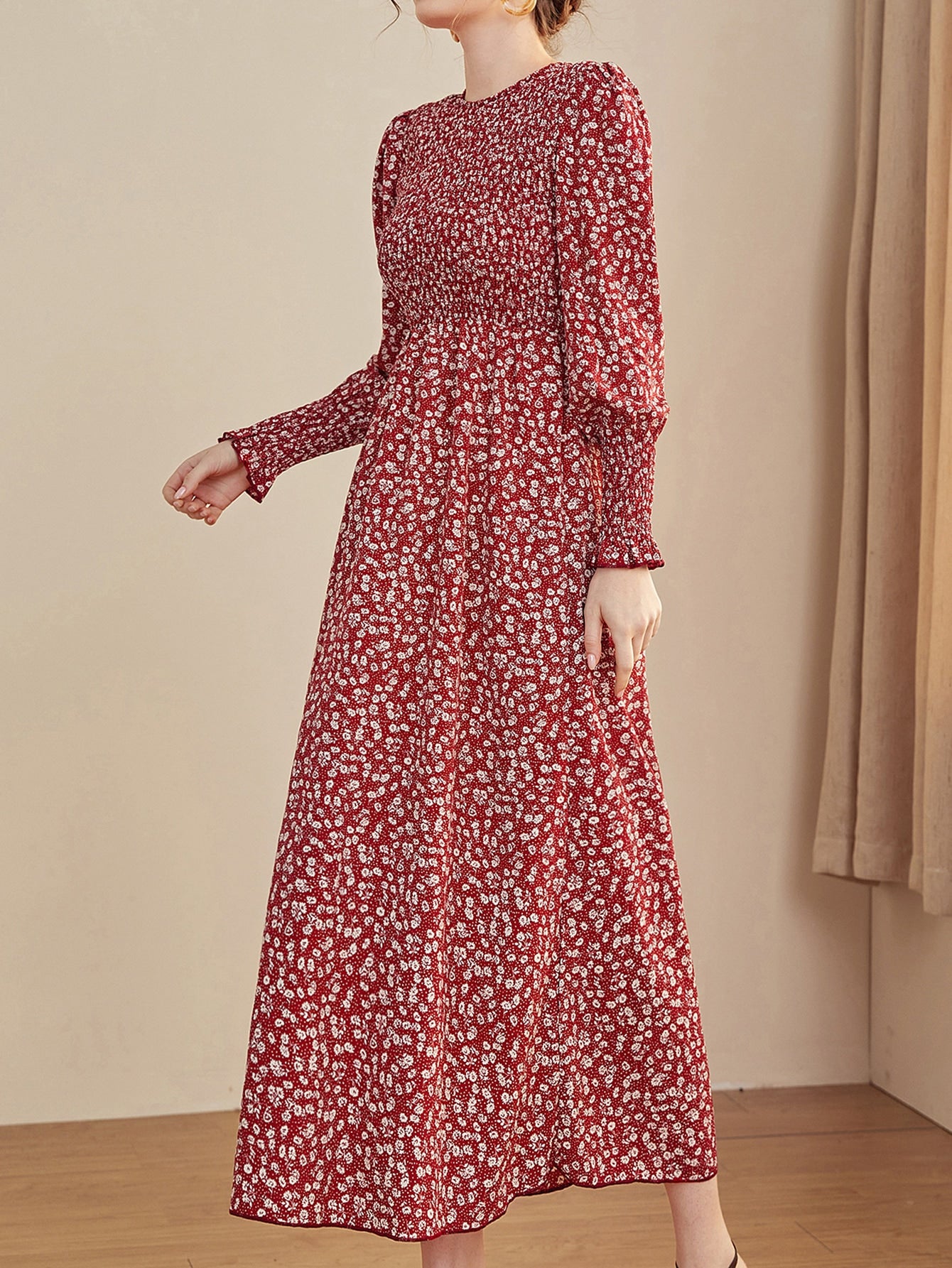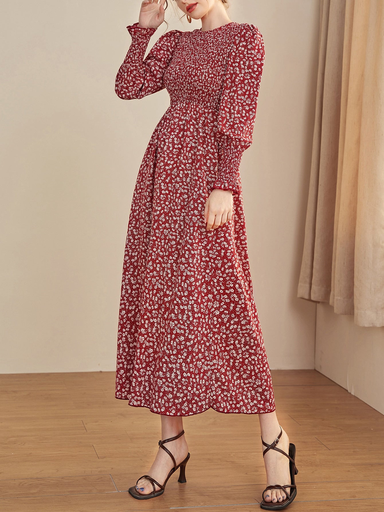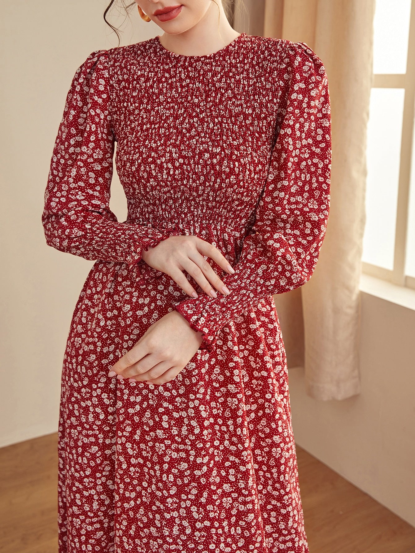 Ditsy Floral Puff Sleeve Shirred A-line Dress