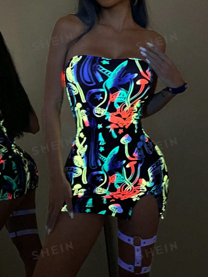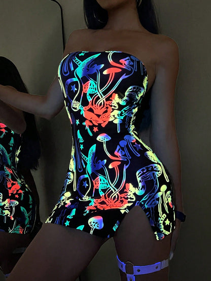 DivaQ Sexy Night Glowing Mushroom Pattern Split Floral Print Bandeau Mini Dress
