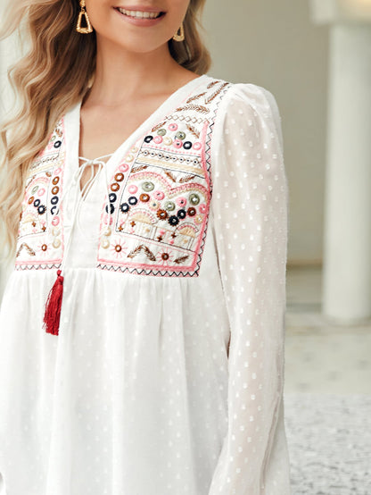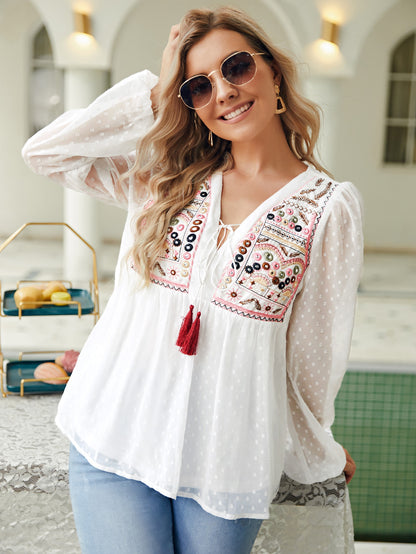 Embroidery Fringe Detail Peplum Blouse