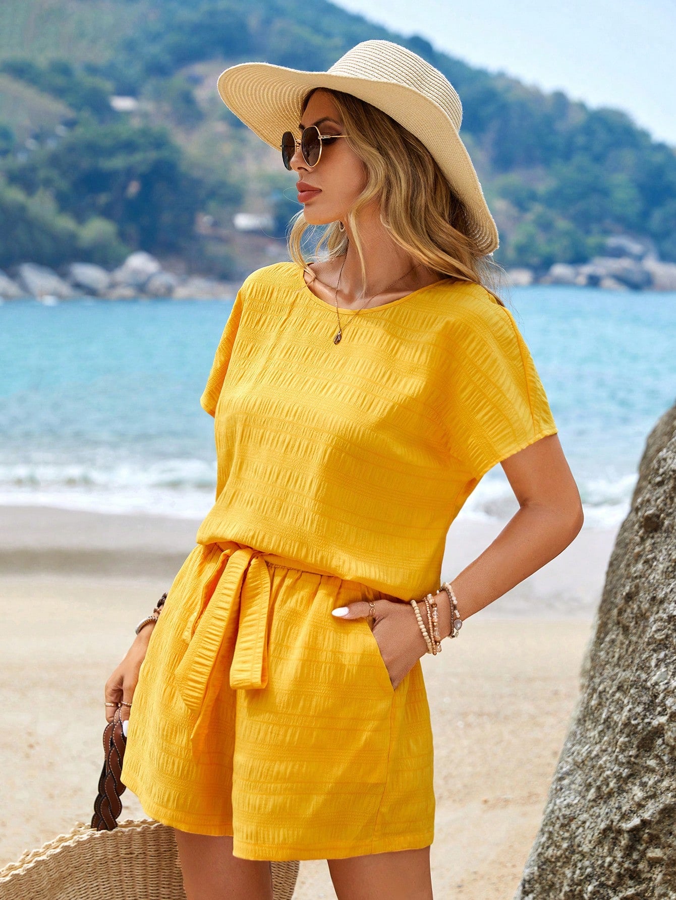 EMERY ROSE Batwing Sleeve Blouse & Slant Pocket Belted Shorts