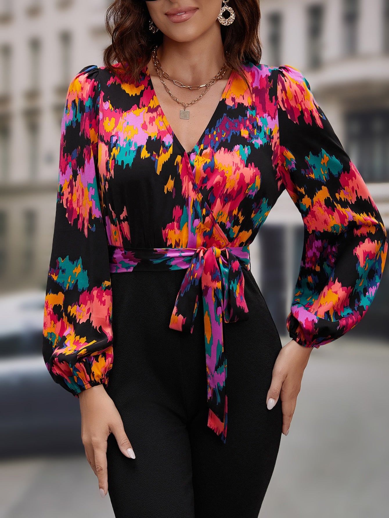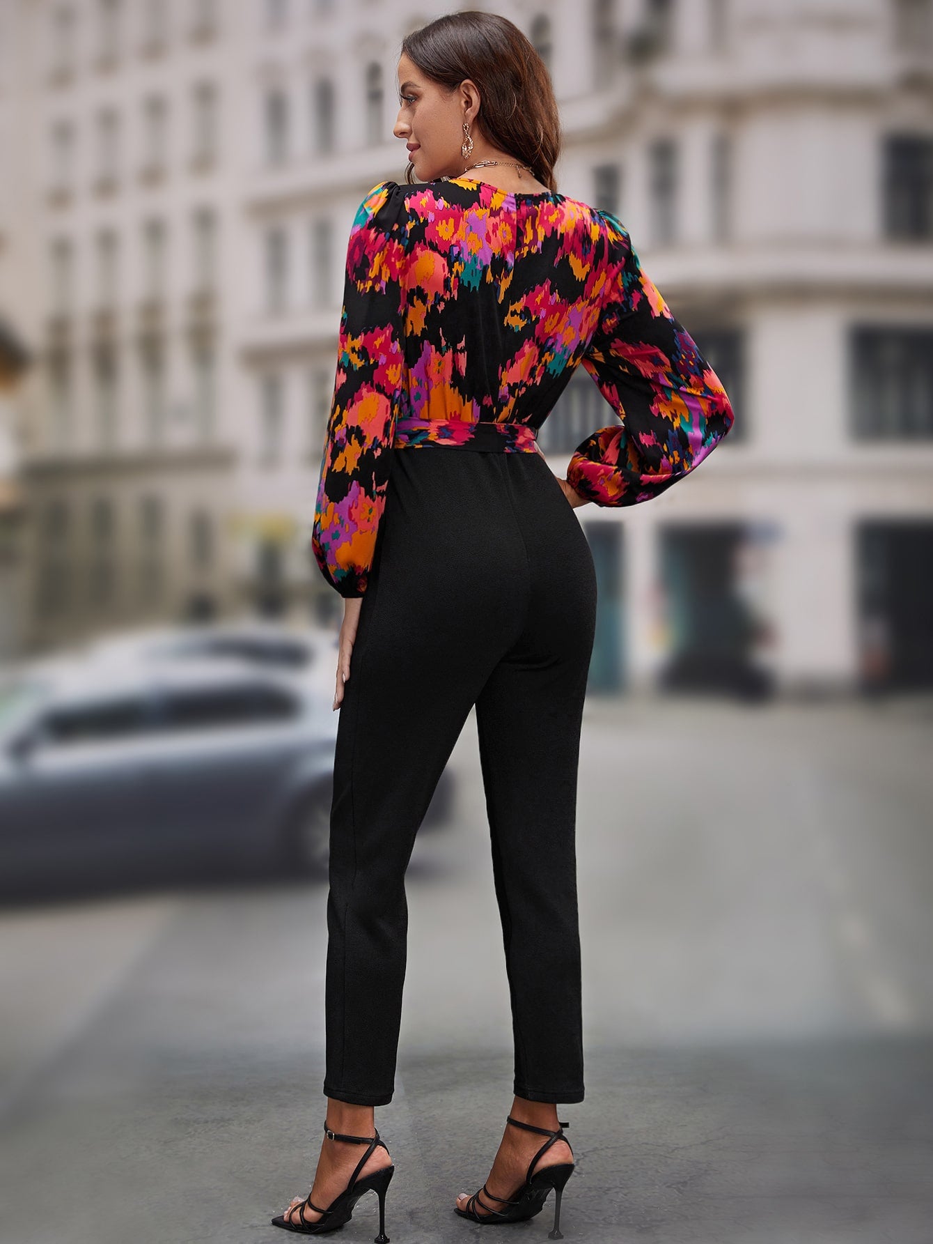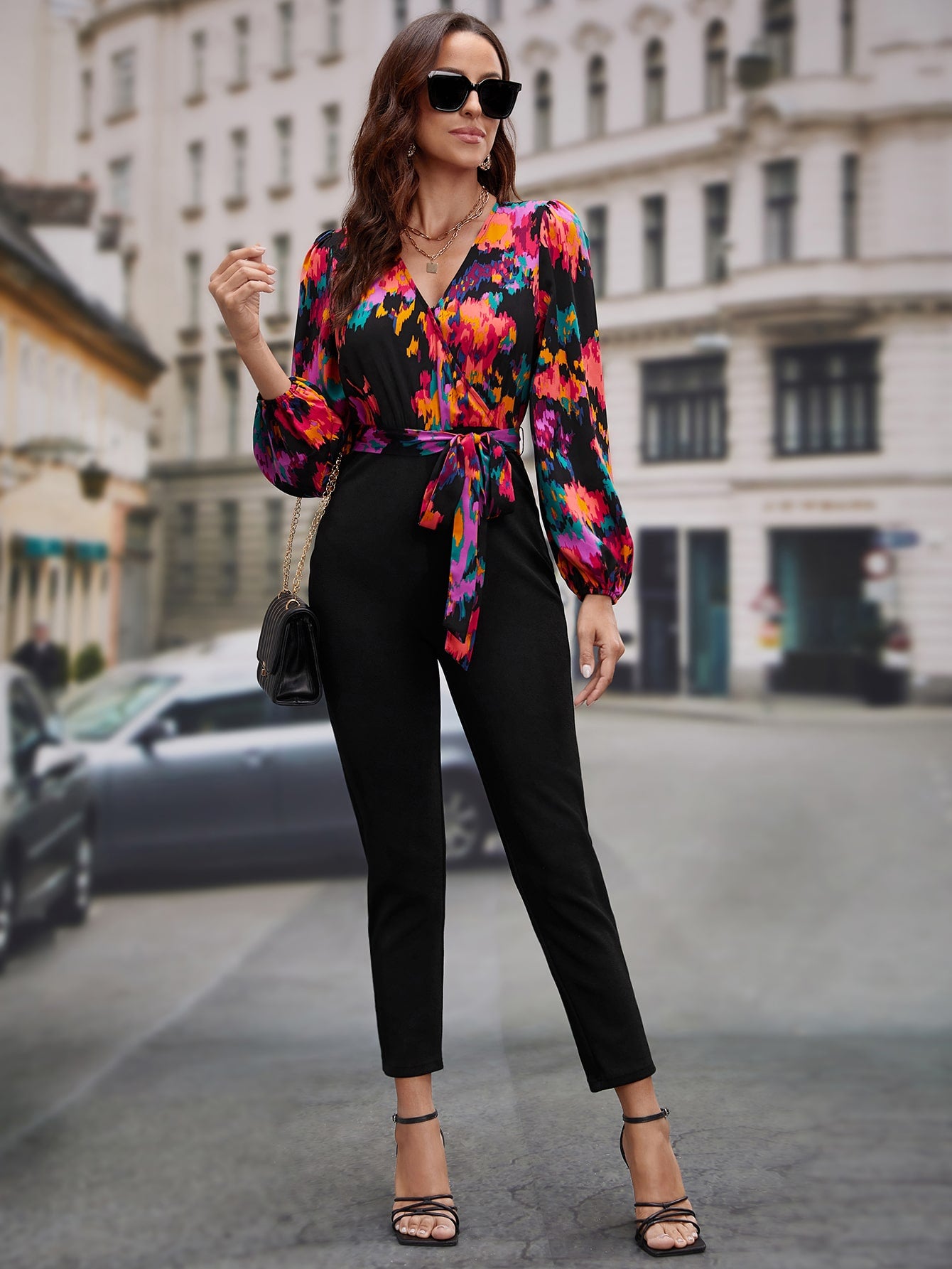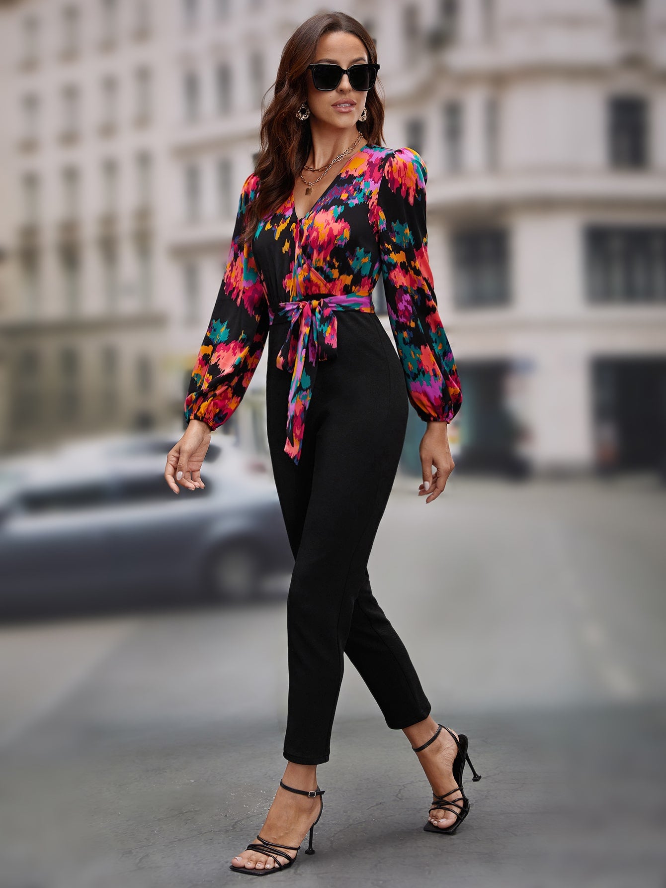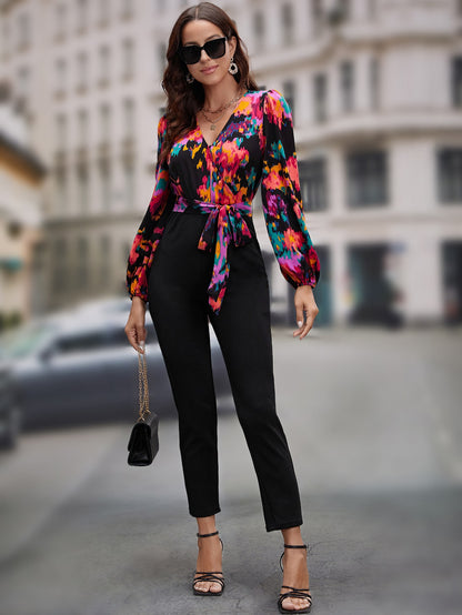 EMERY ROSE Graphic Print Surplice Neck Belted Jumpsuit