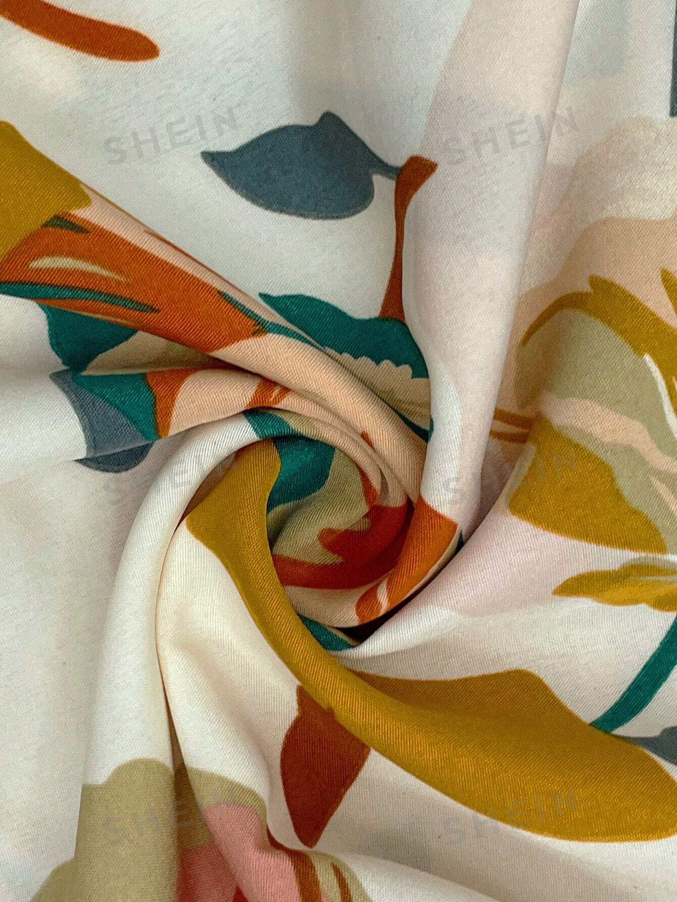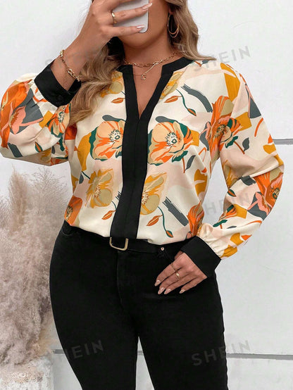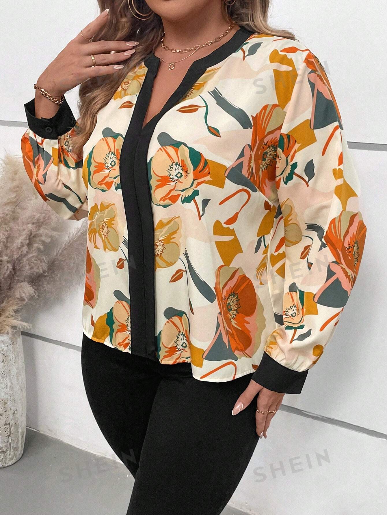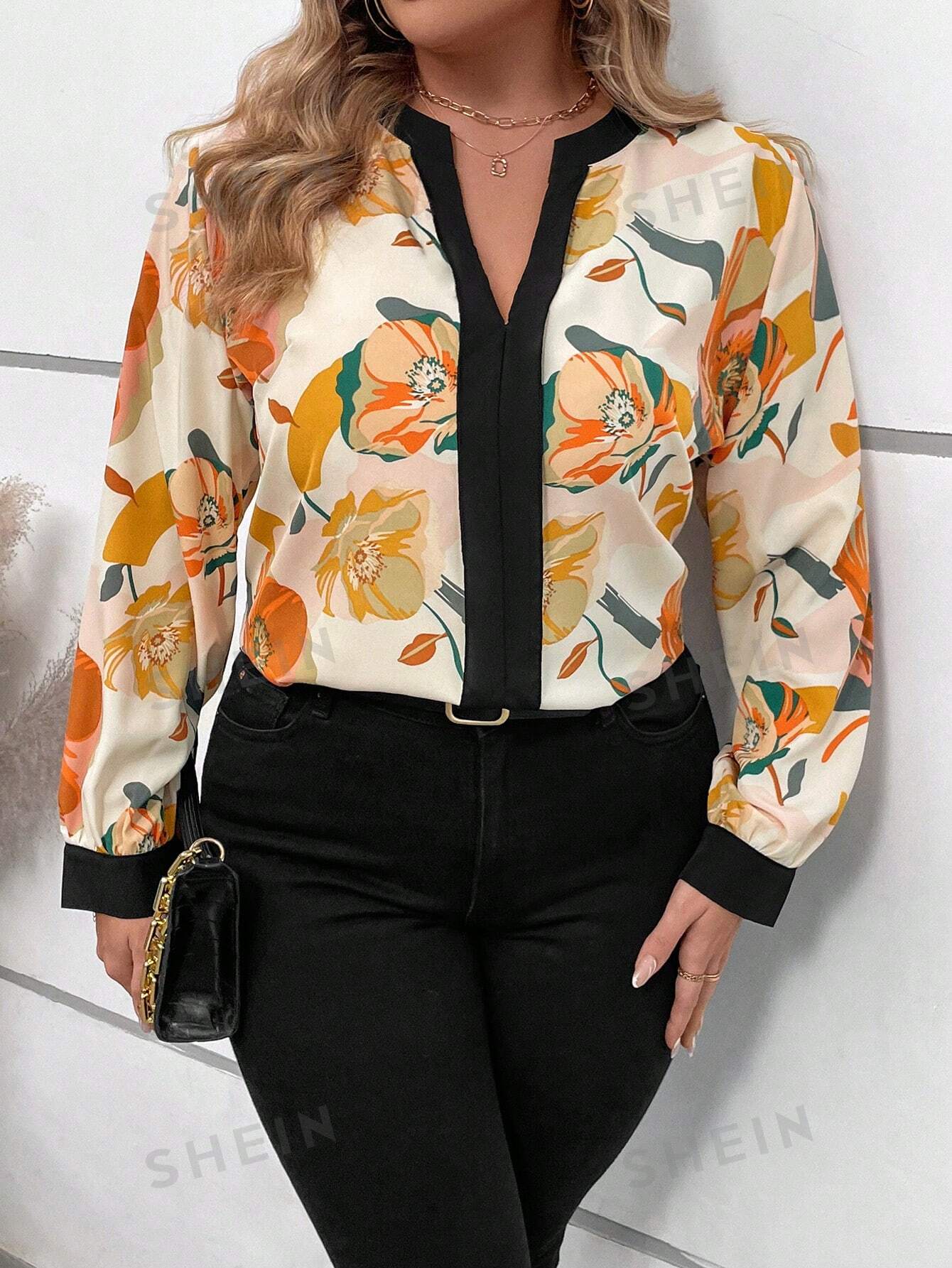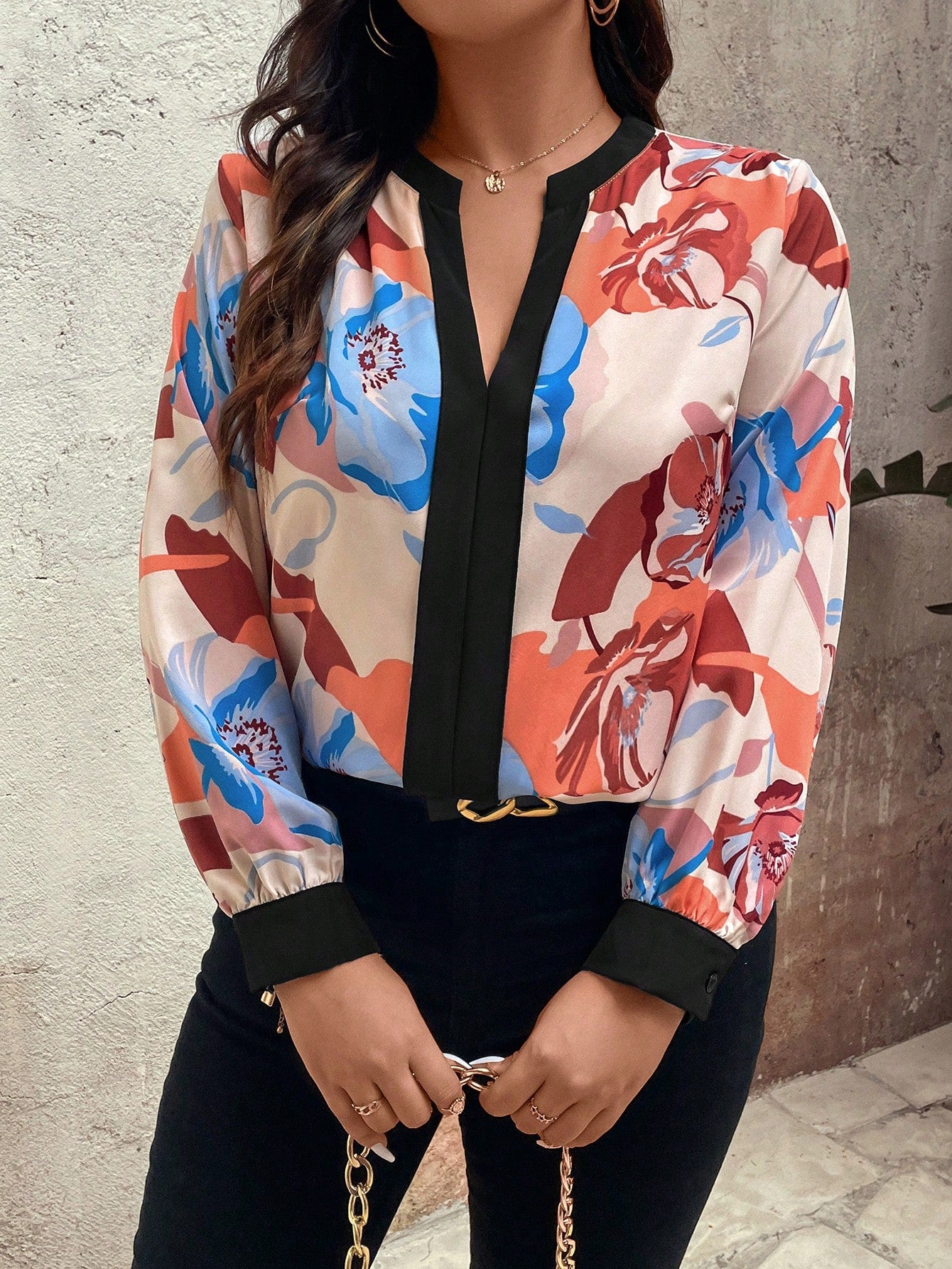 EMERY ROSE Plus Floral Print Notched Neckline Blouse