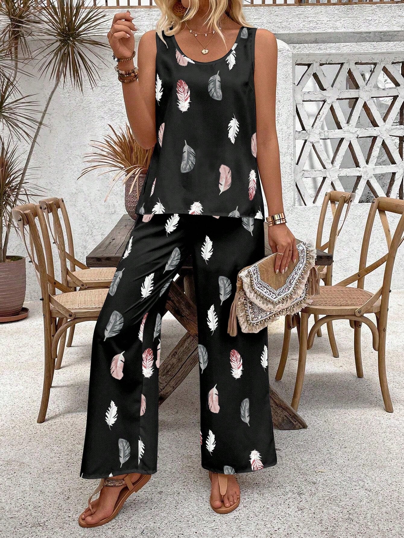 EMERY ROSE Sleeveless Feather Printed Top And Long Pants Set With Wide Round Neckline, Summer Casual Outfit