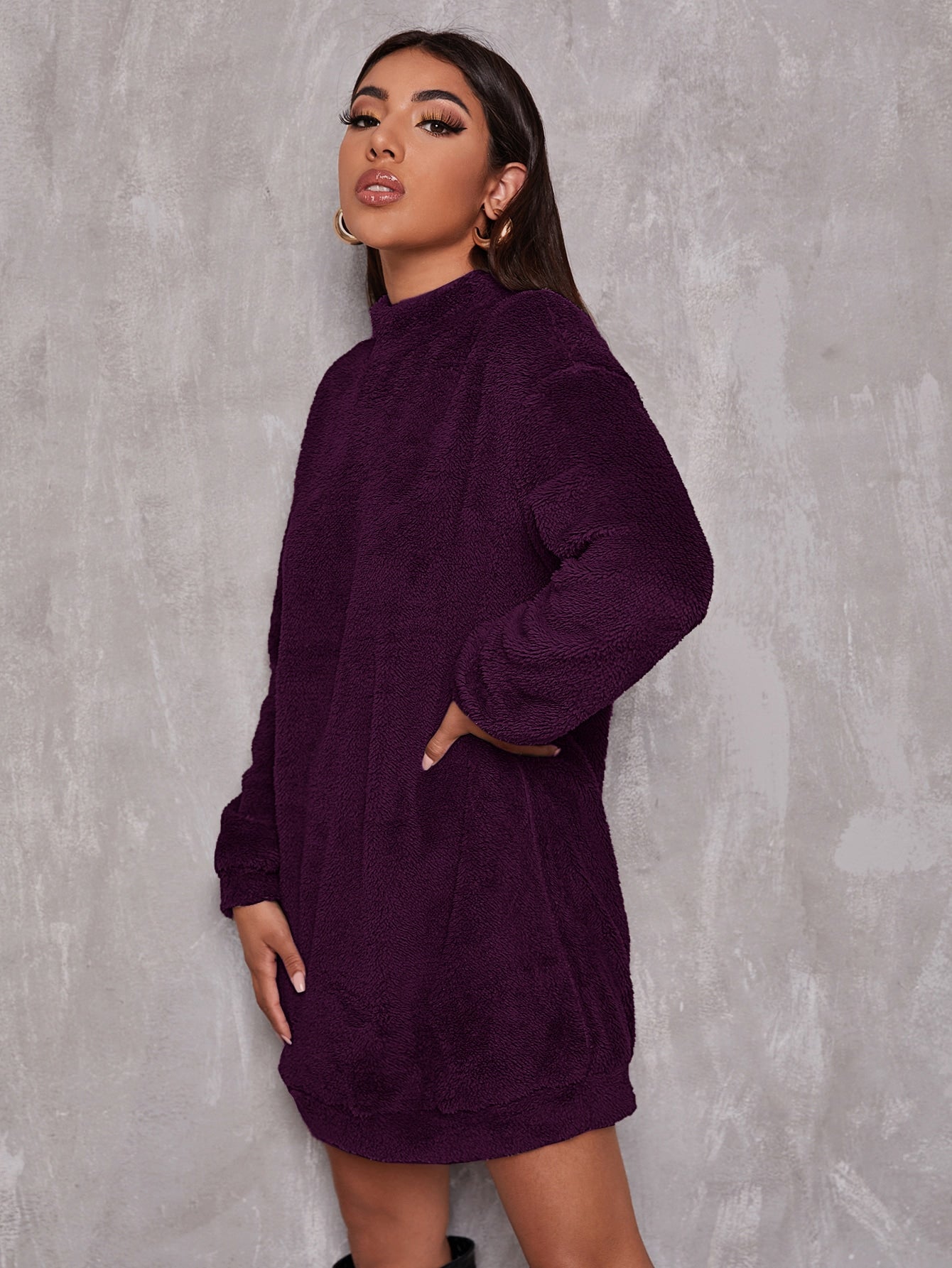 EZwear Mock-neck Drop Shoulder Teddy Sweatshirt Dress