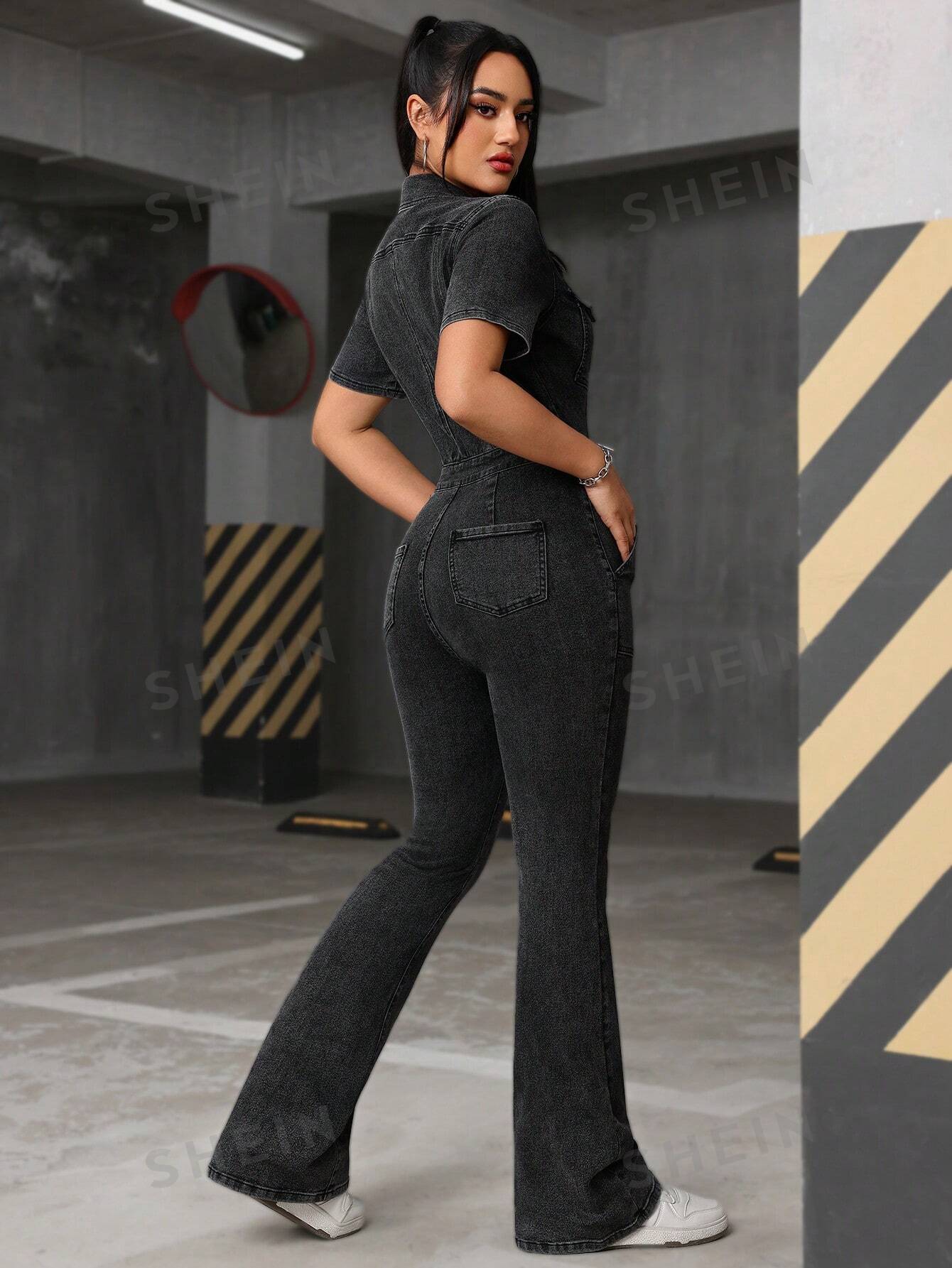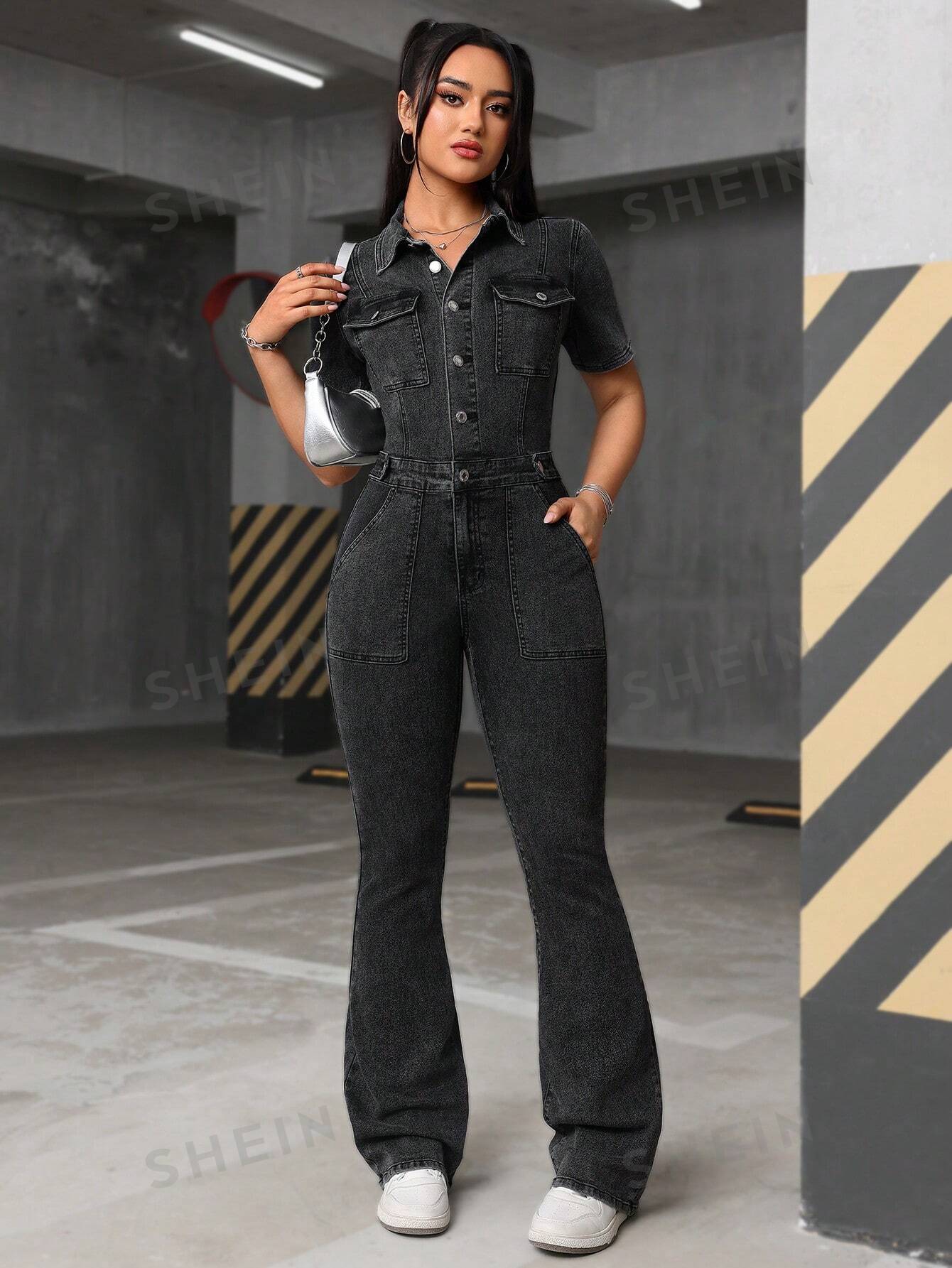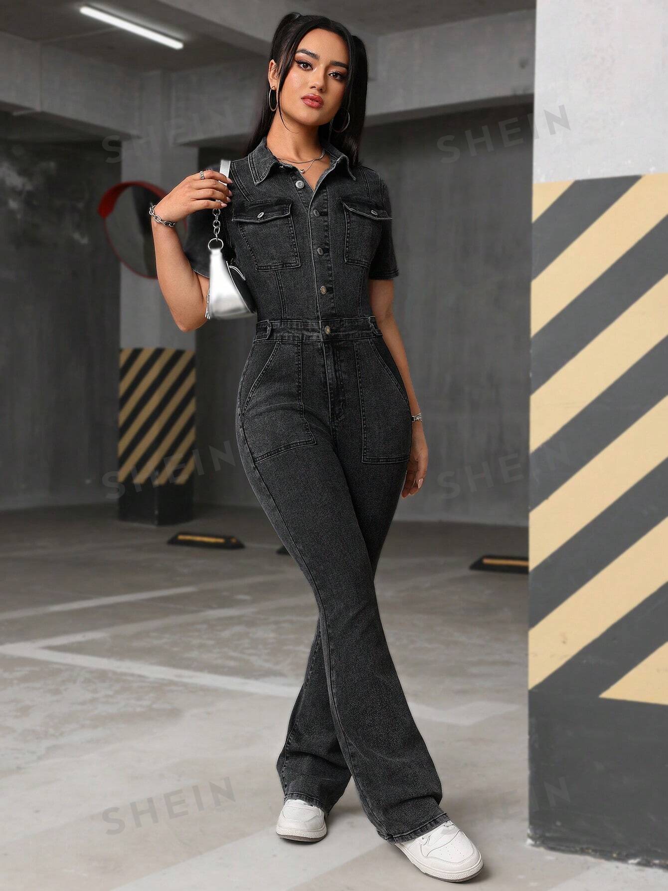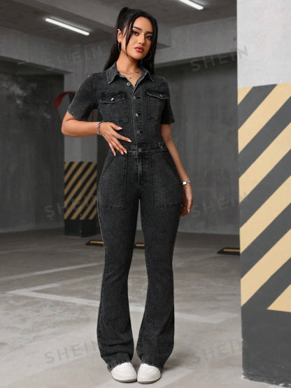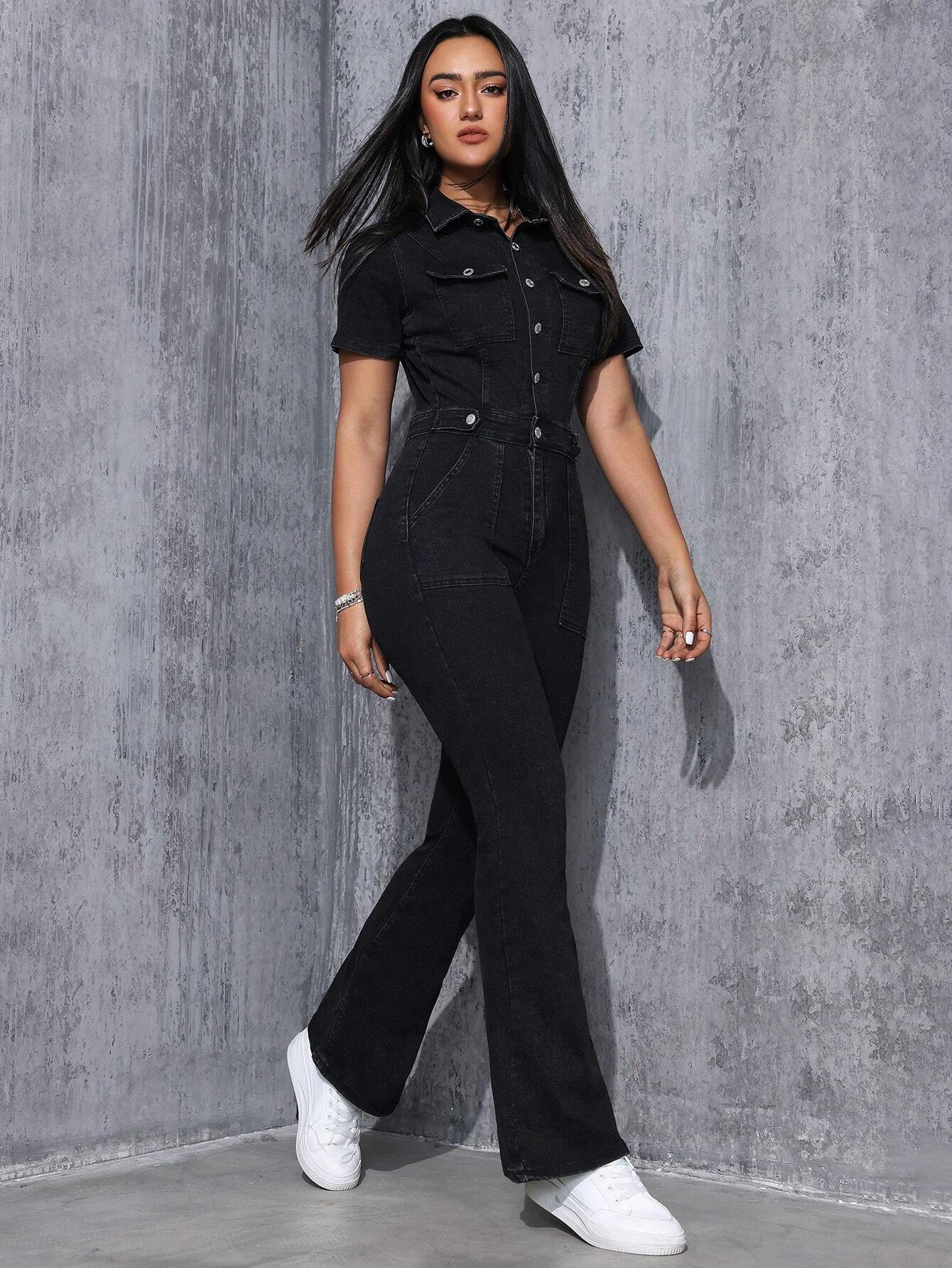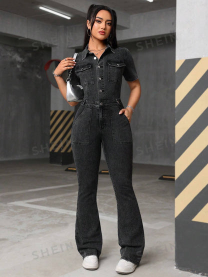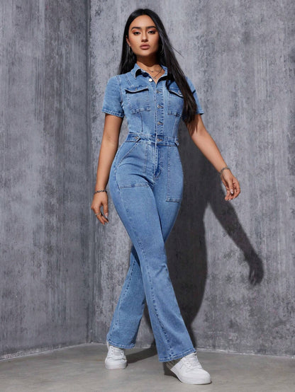 EZwear Short Sleeve Button Front Pocket Simple Casual Denim Jumpsuit