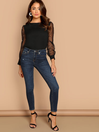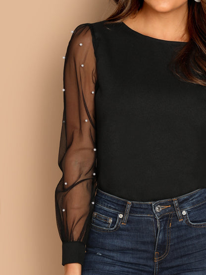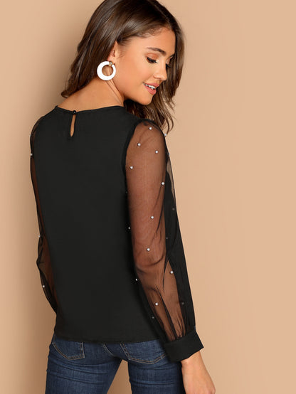Details: Pearls, Contrast Mesh, Beaded, Button