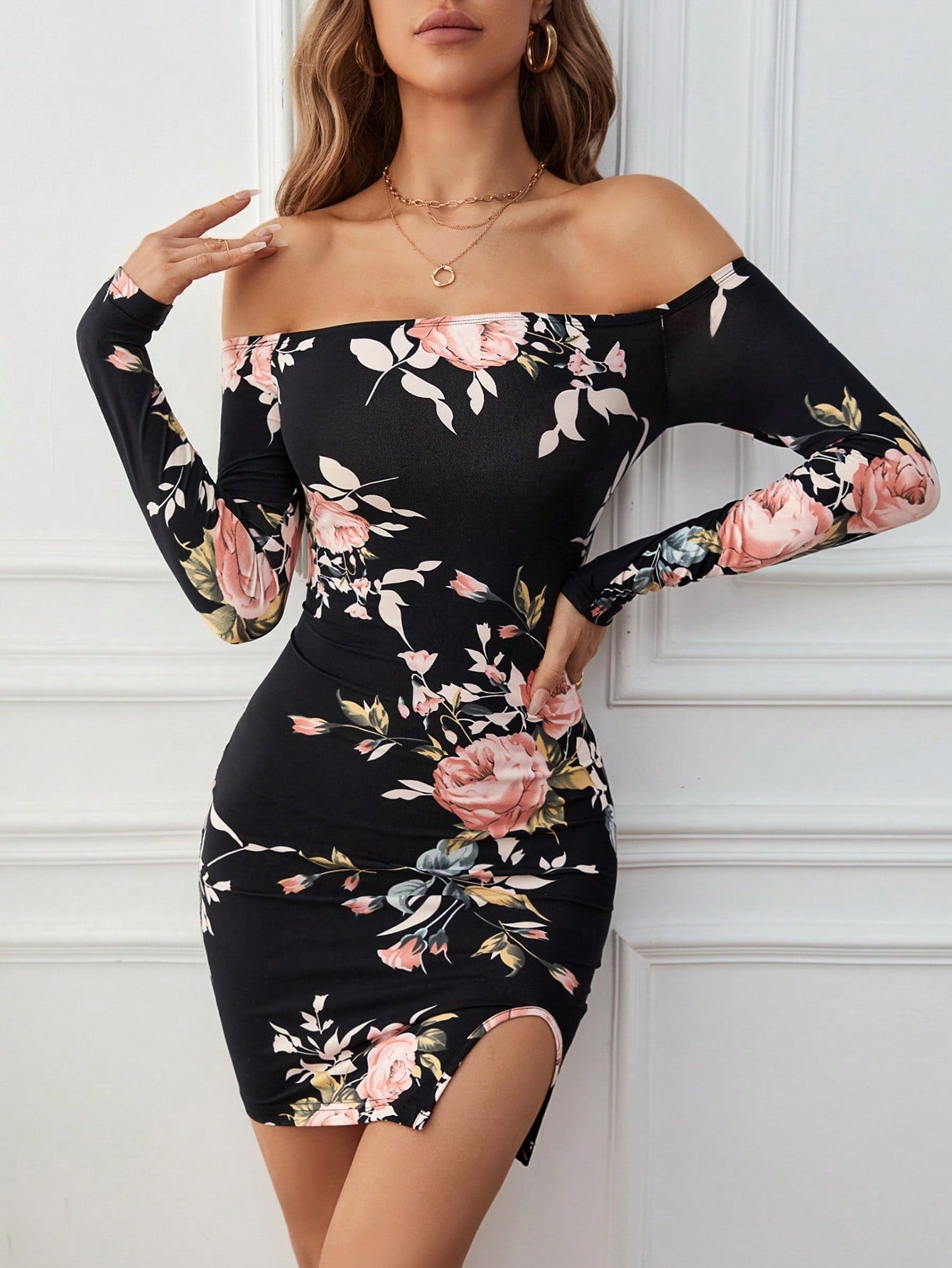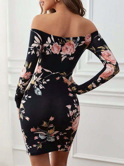 Floral Print Off Shoulder Split Hem Bodycon Dress
