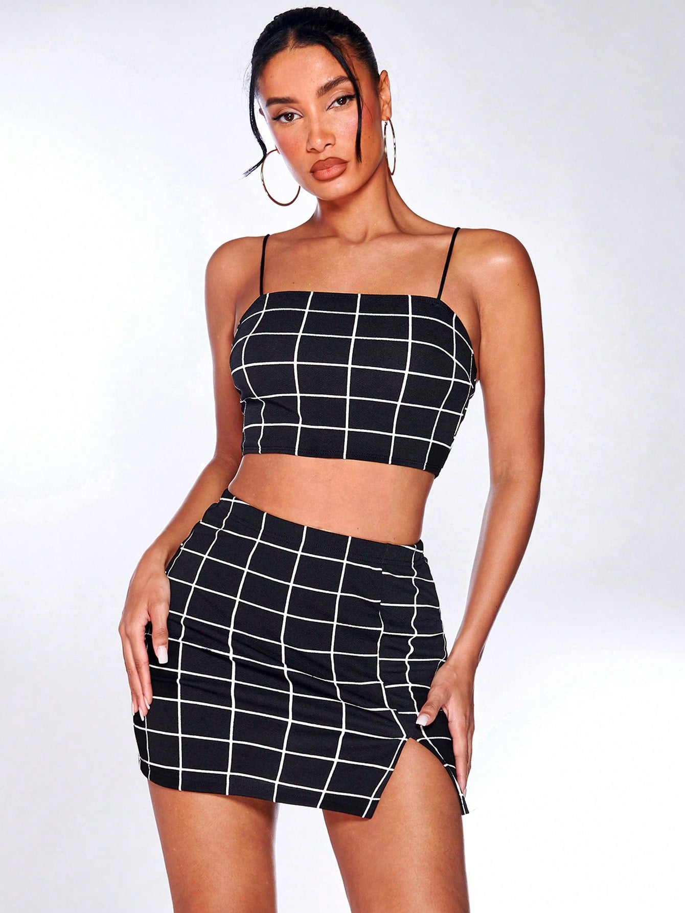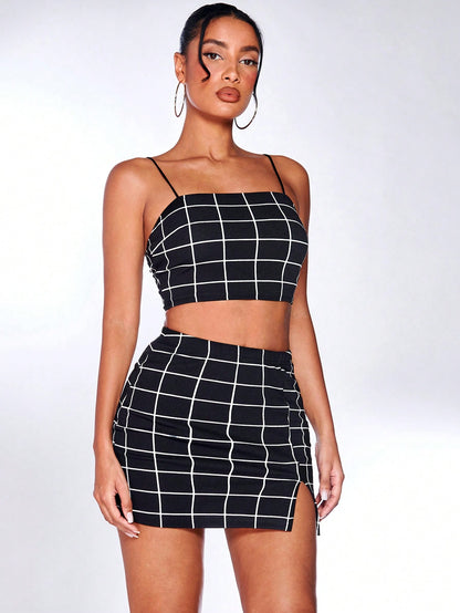 Grid Print Cropped Cami Top & Mini Skirt Set