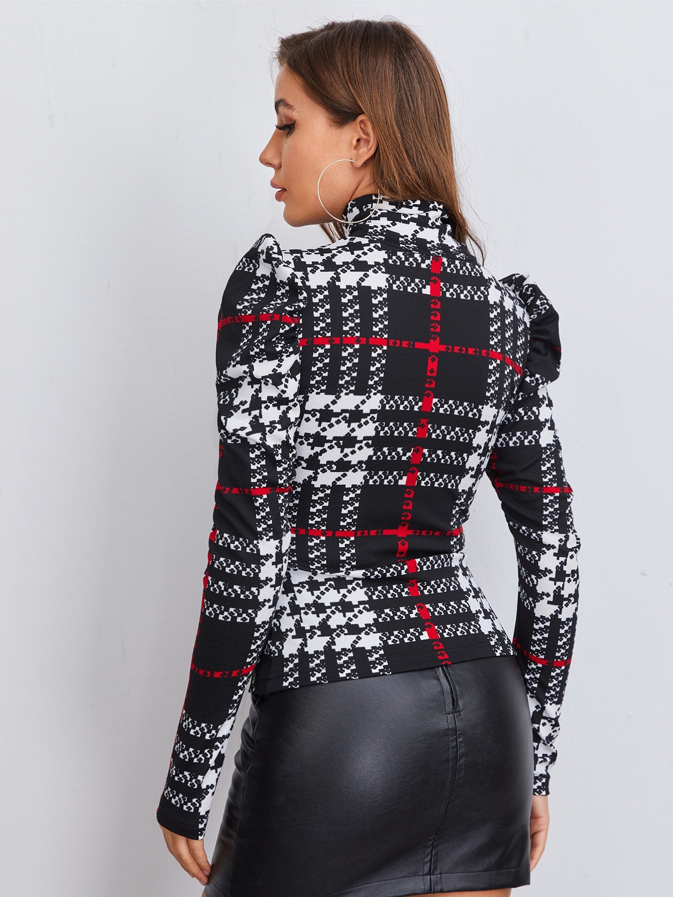 High Neck Gigot Sleeve Plaid Tee
