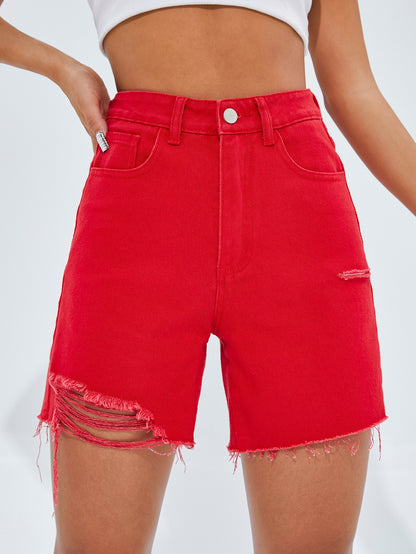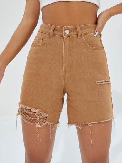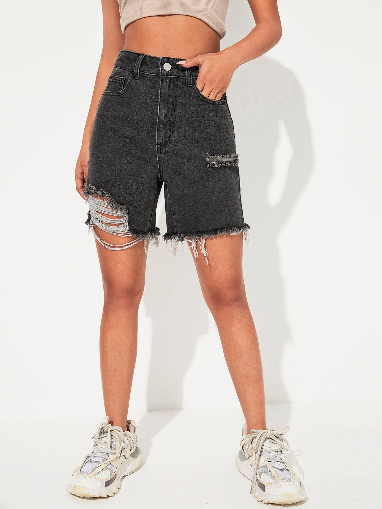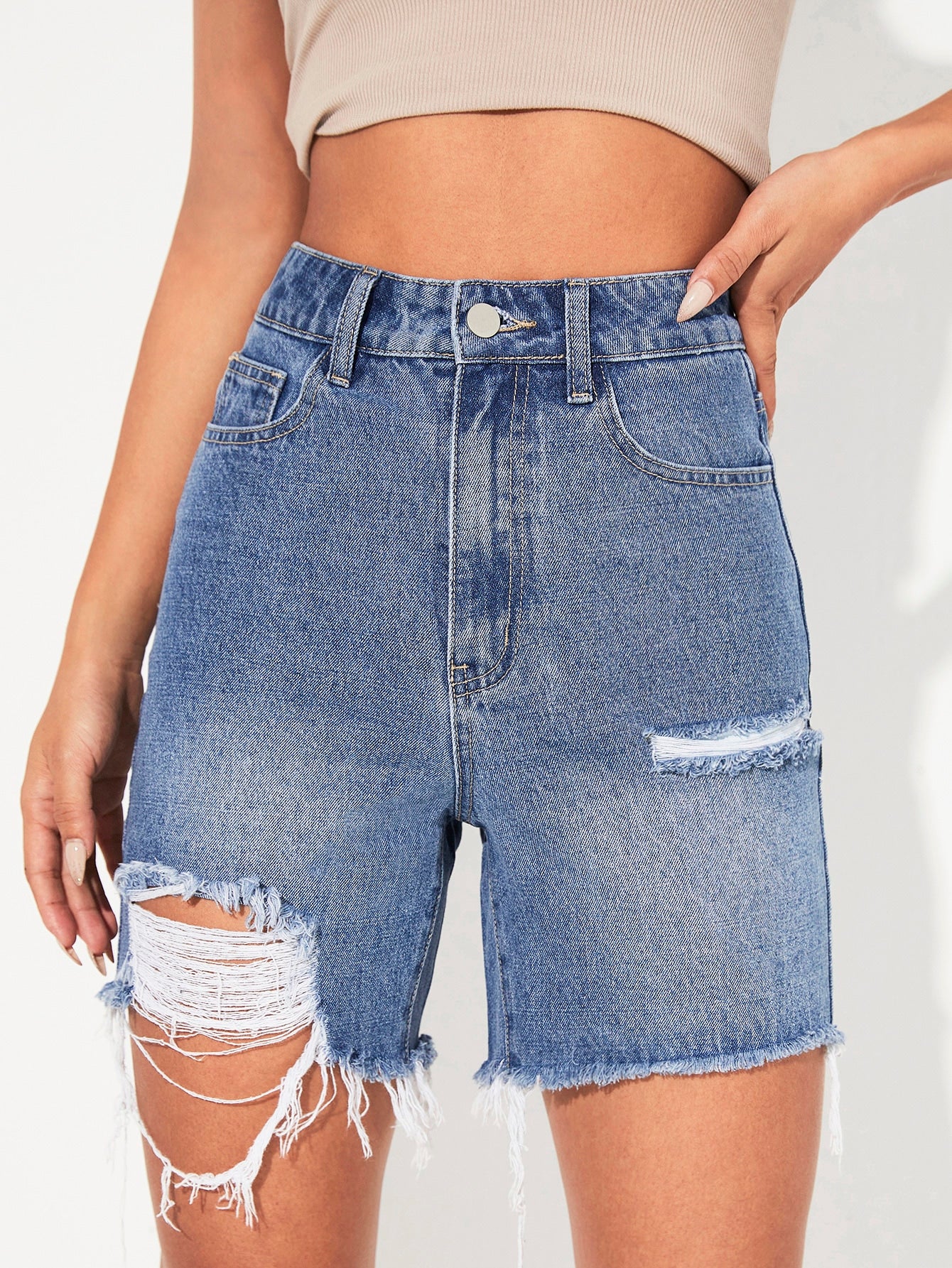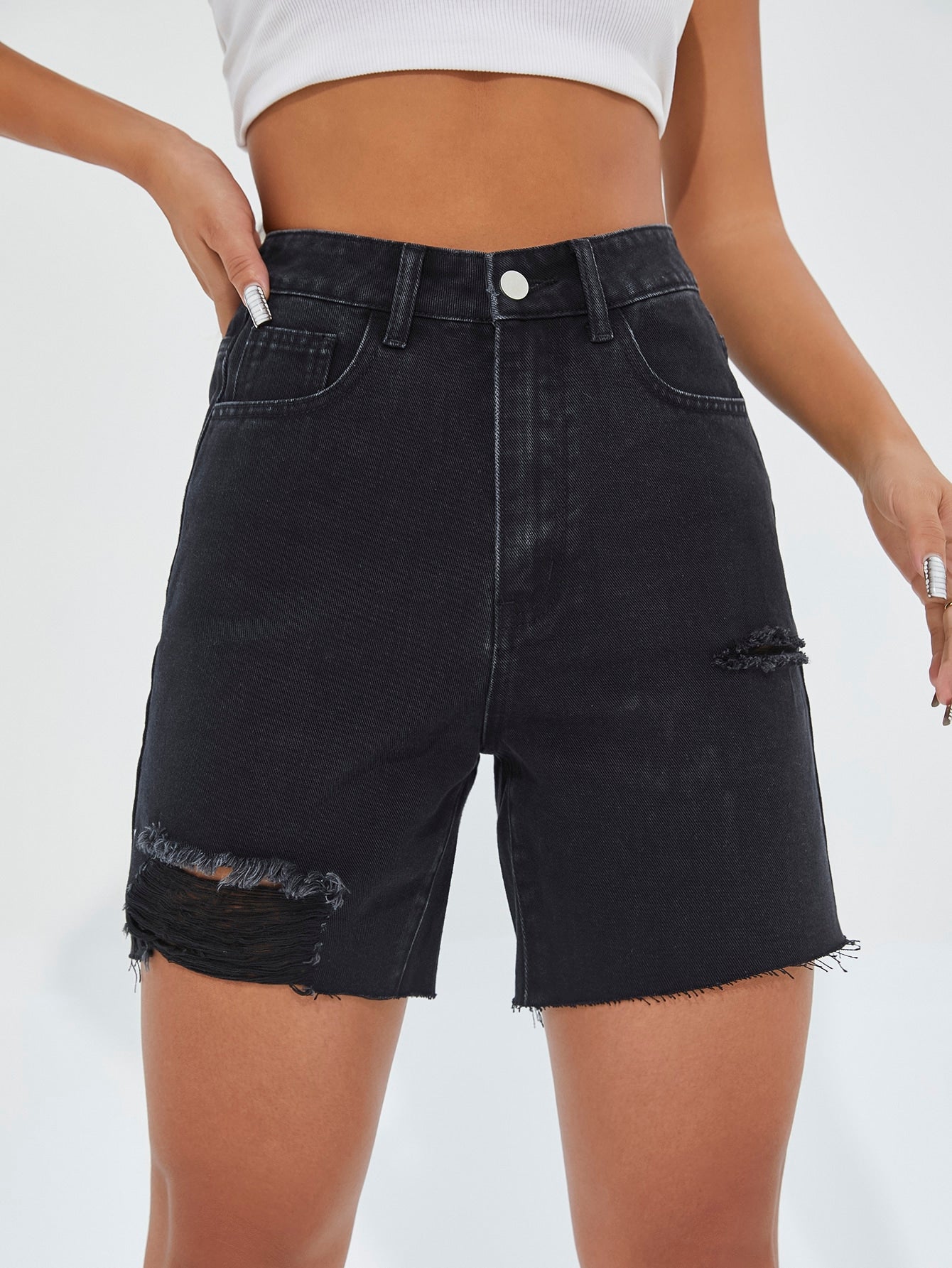 Details: Ripped, Raw Hem, Button, Pocket, Zipper
