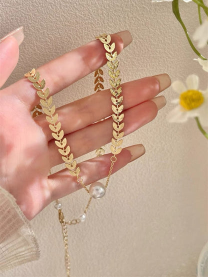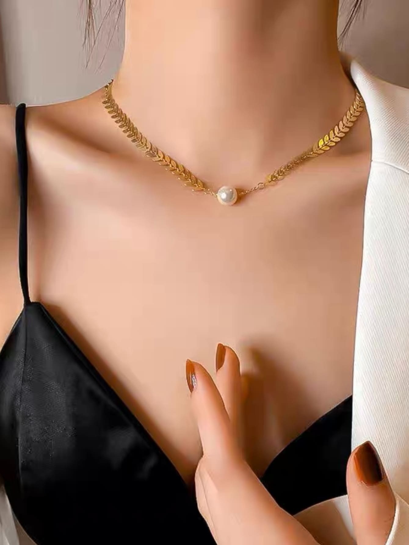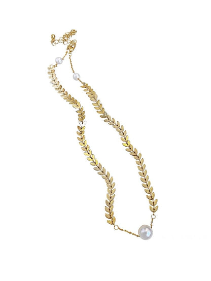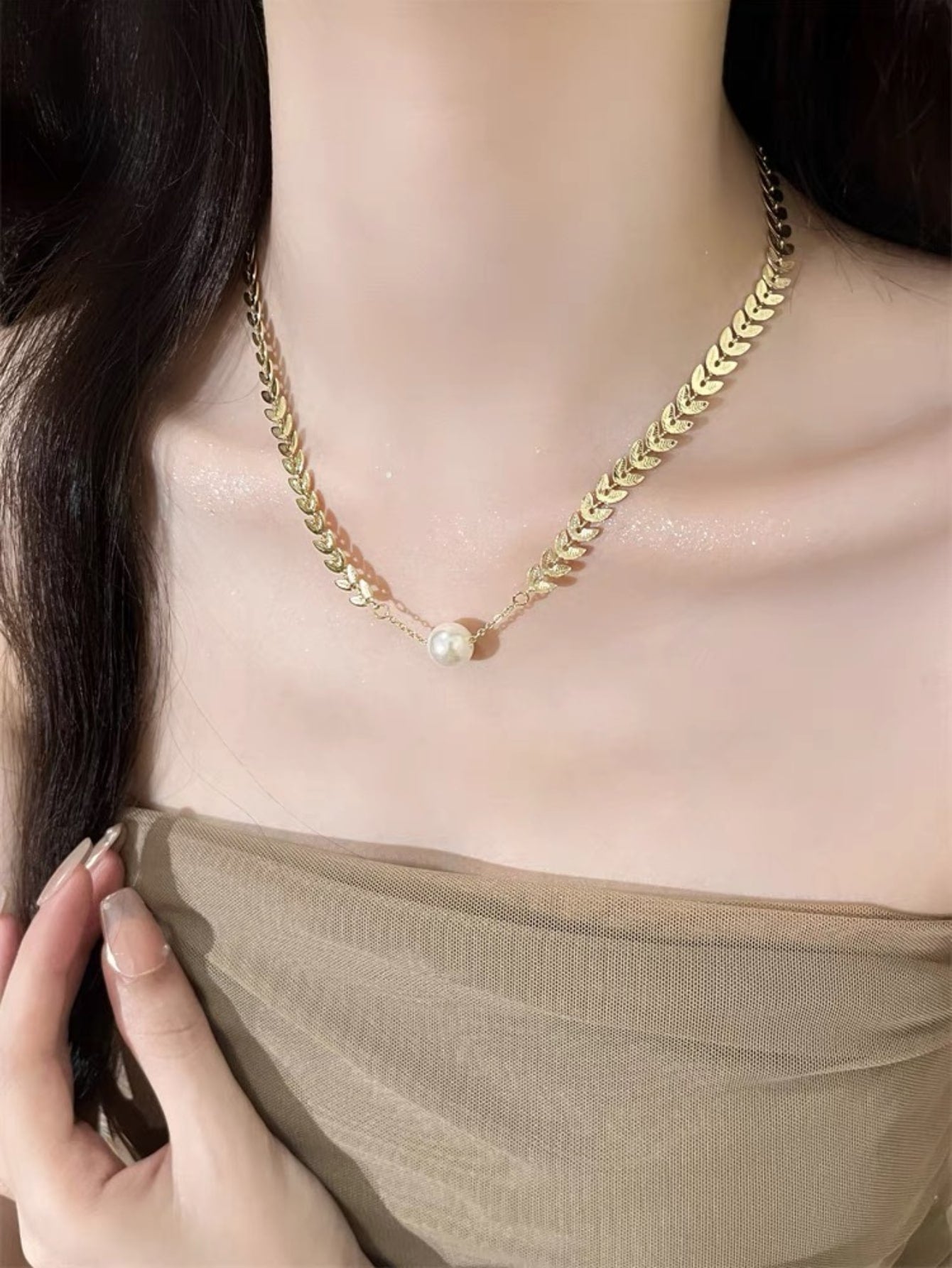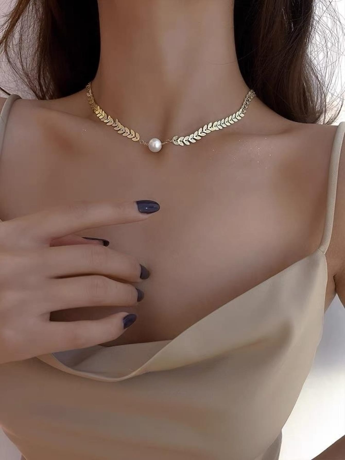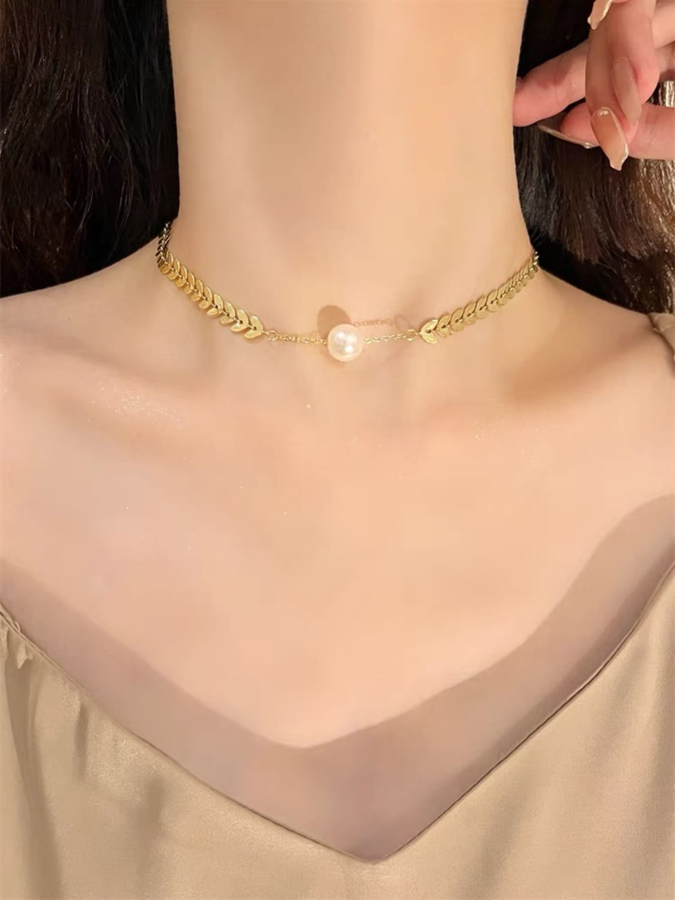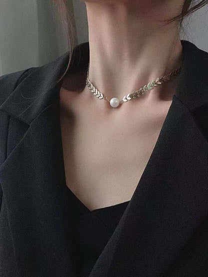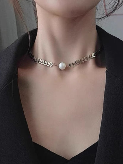 Hip-hop Style Personality Pearl & Leaf Pendant Choker Necklace
