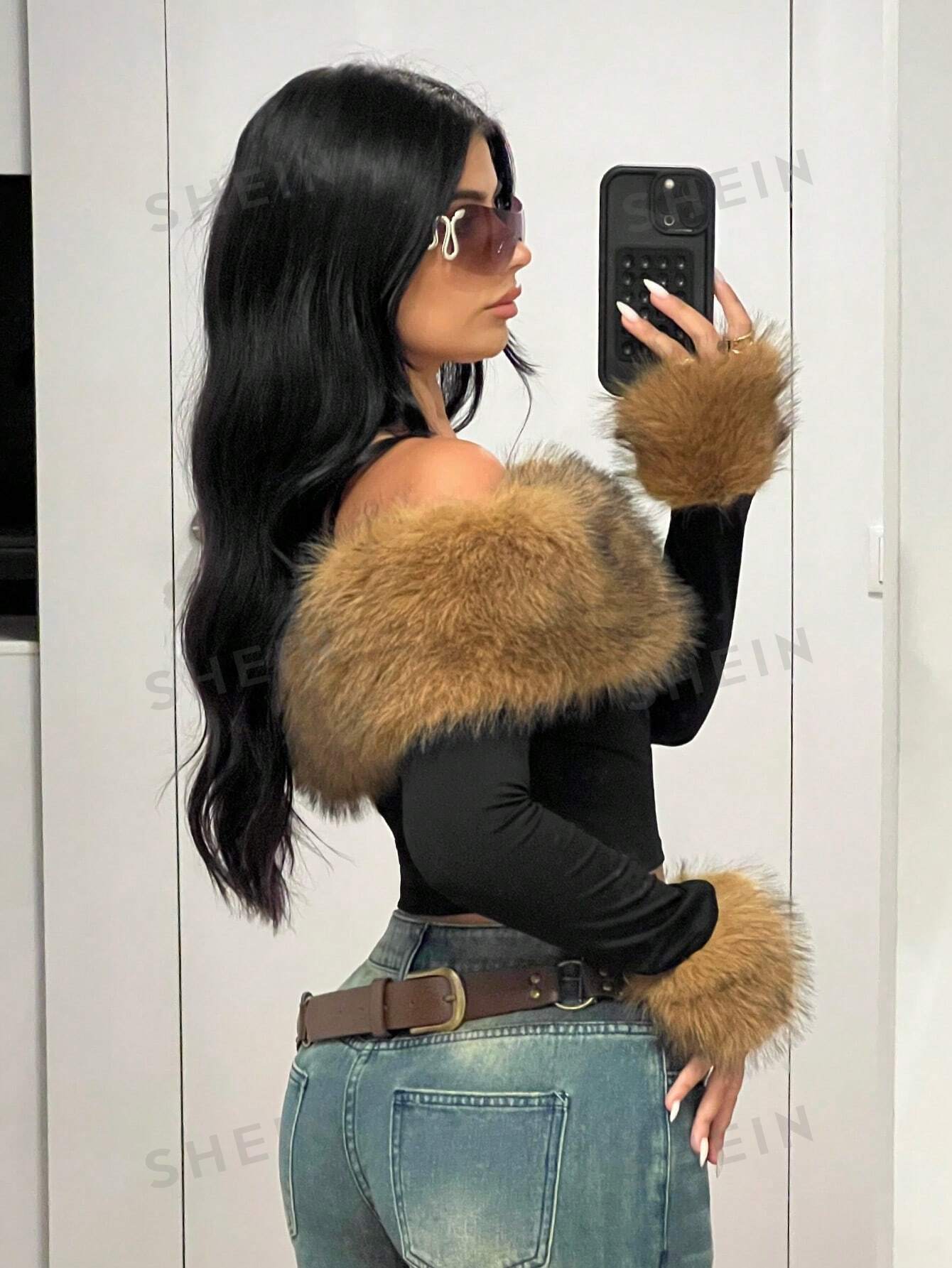ICON 1pc Fluffy Collar Splice Off Shoulder Long Sleeve T-Shirt