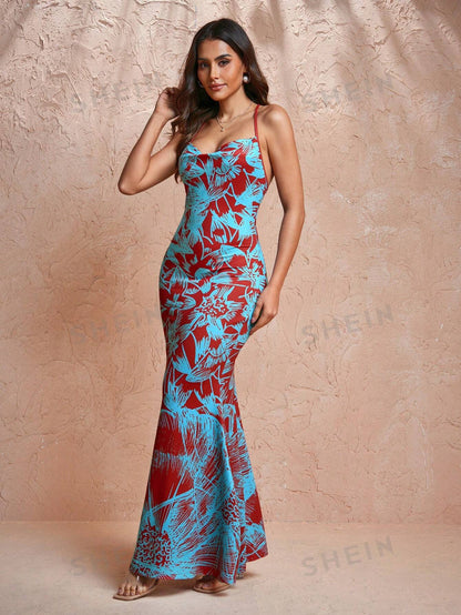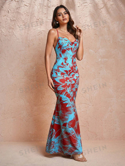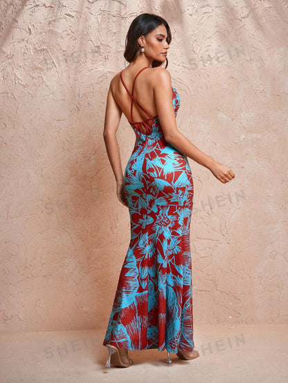 JIAN LASALA Designer Floral Print Cowl Maxi Dress