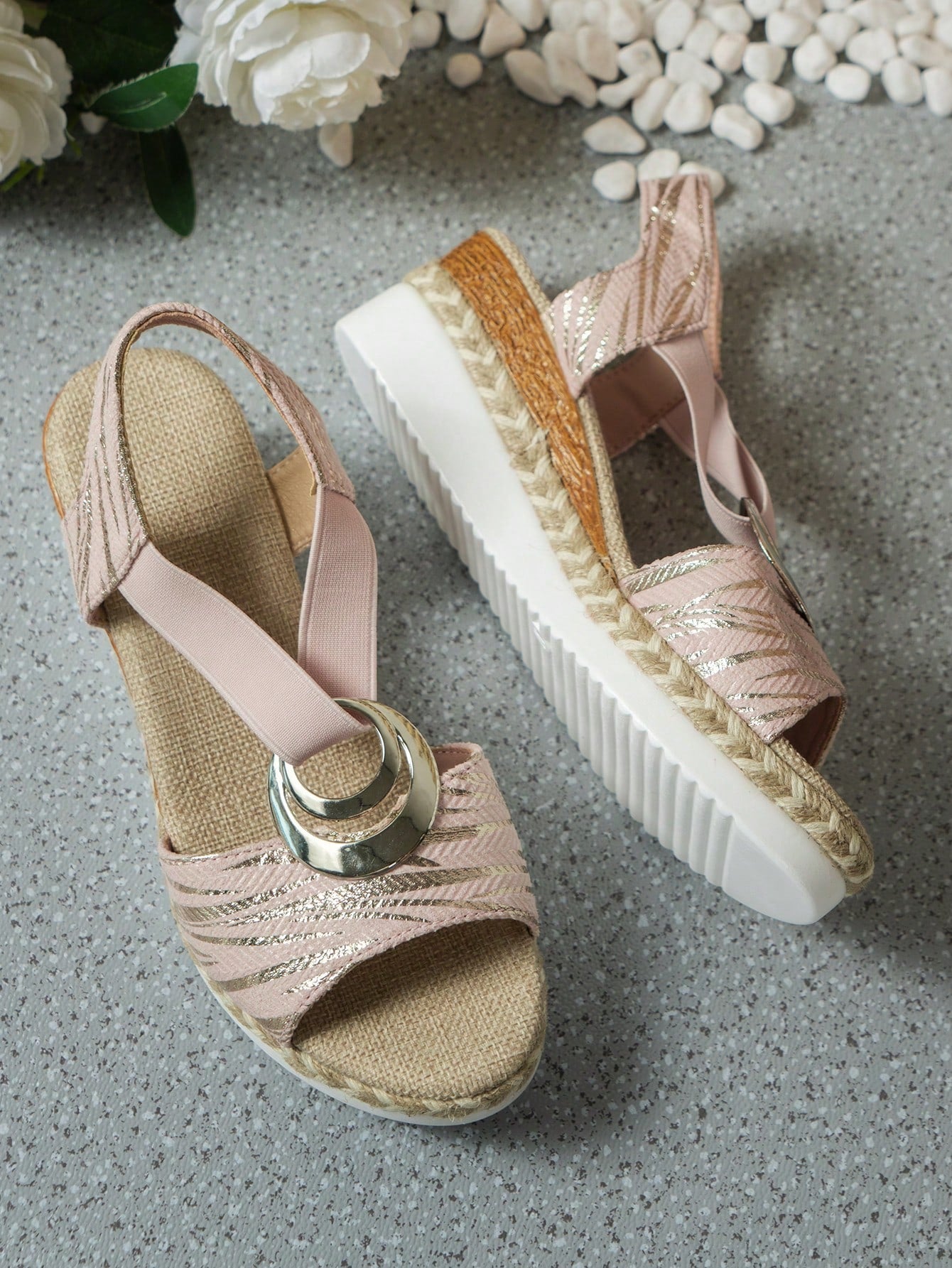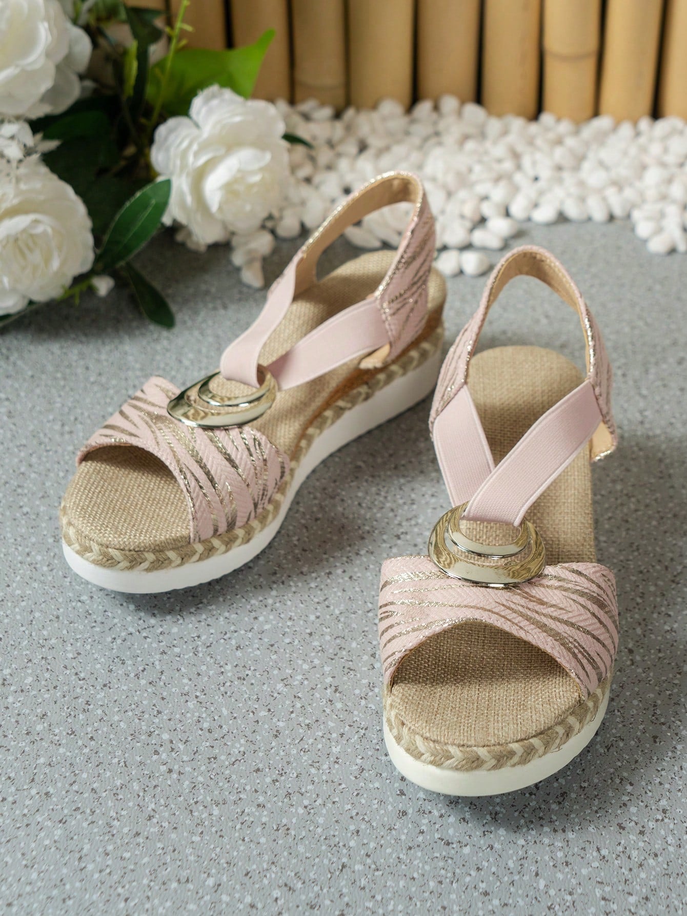 Ladies Big Buckle Wedge Heel Thick Sole Sandals - 2024 New Fashion Gold Stripe Pattern Elastic Band Wedge Heel Thick Sole Sandals