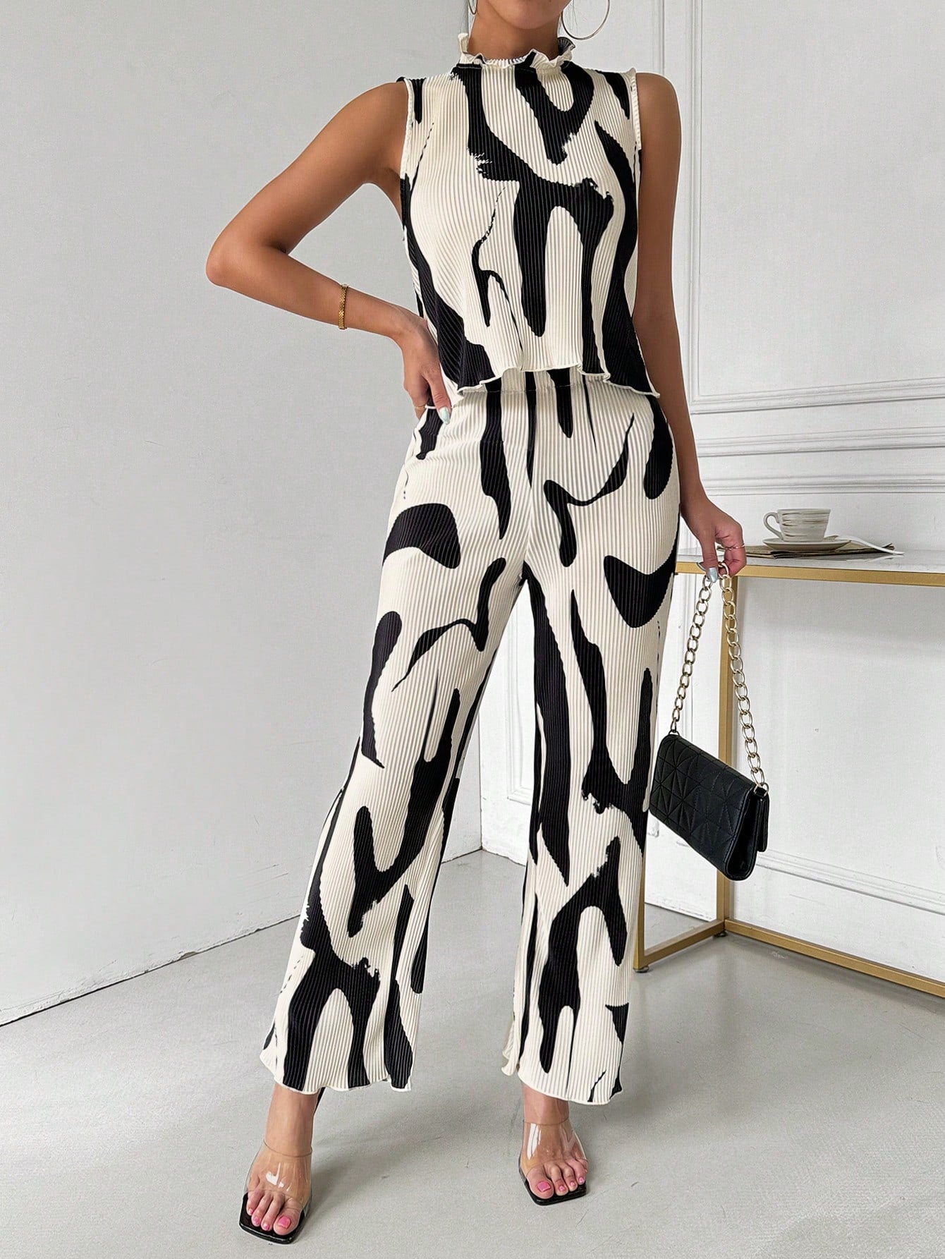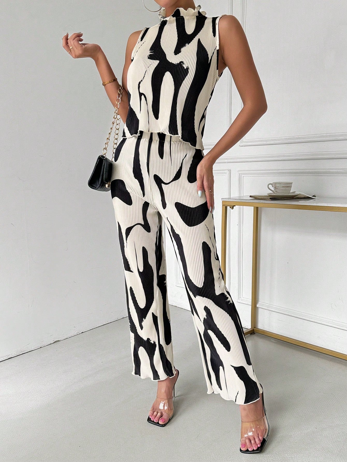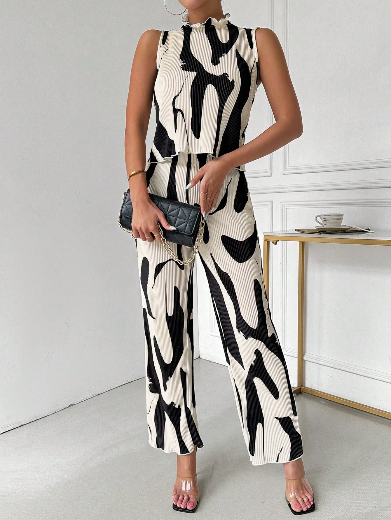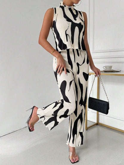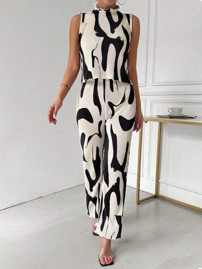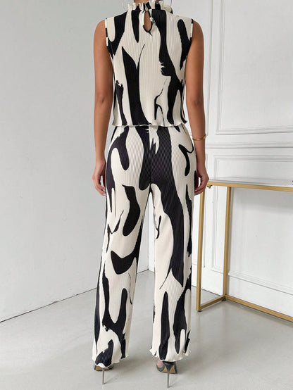 Ladies" Elegant And Sleeveless Vest With Pleated Pants Set, Random Prints