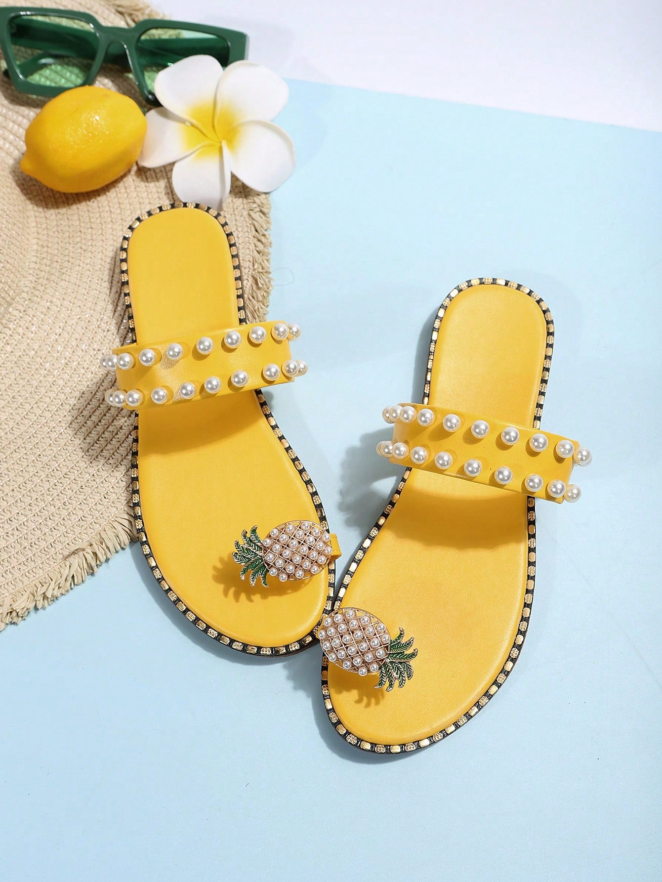 Ladies' Sweet & Fresh Toe-Post Sandals With Pearl & Pineapple Decor, Yellow Flat Sandals