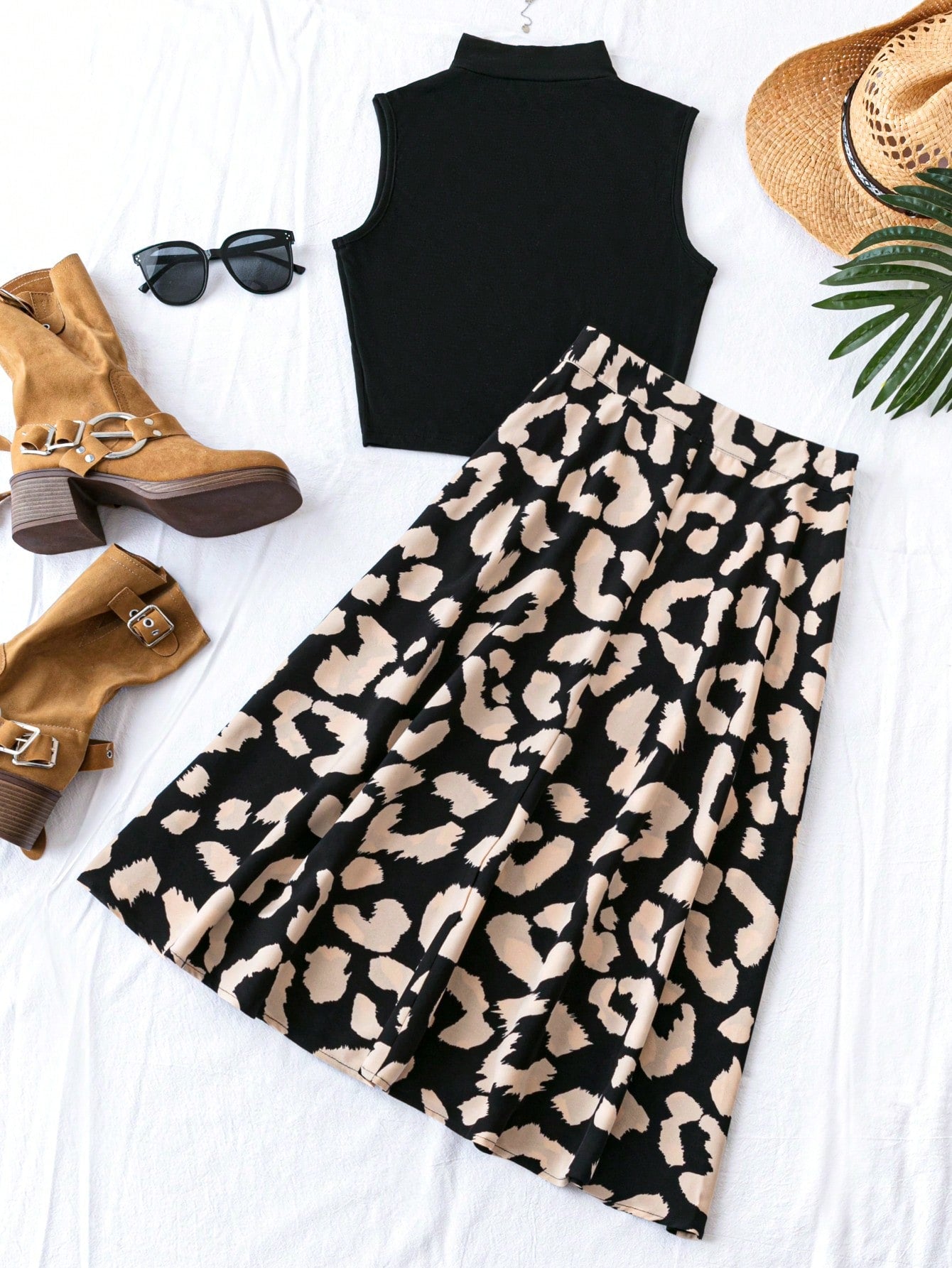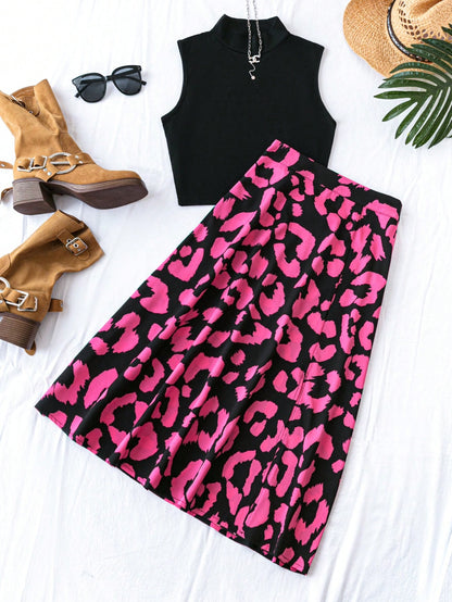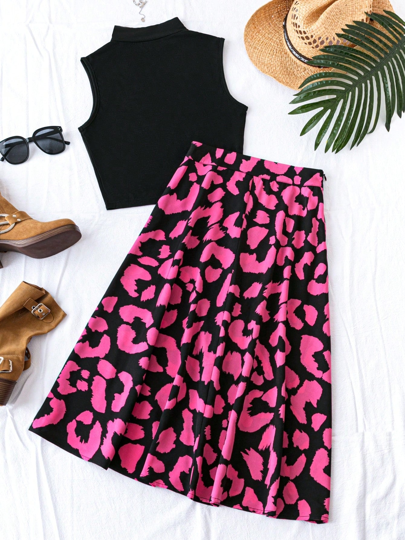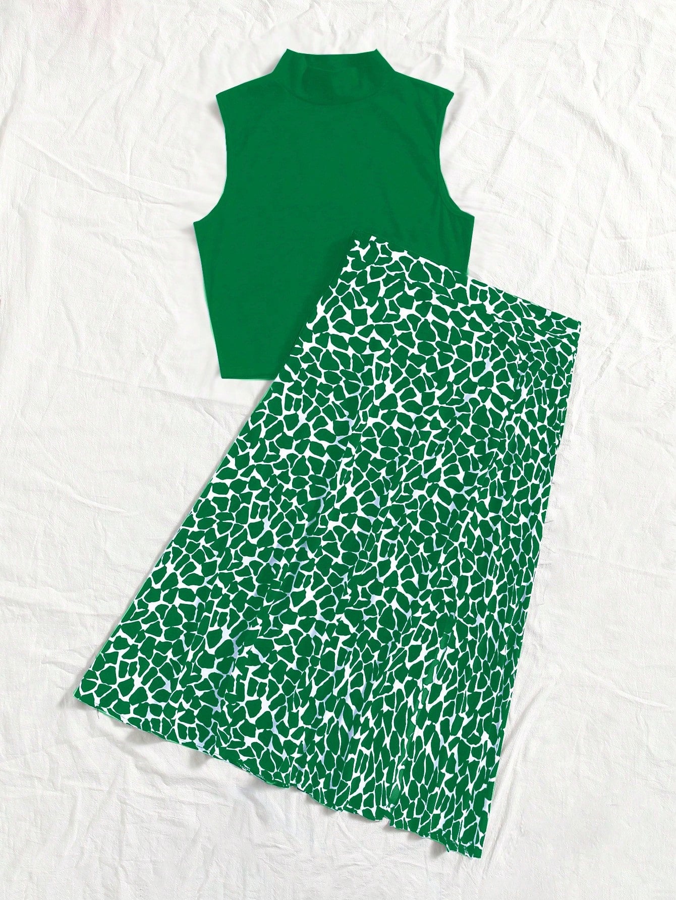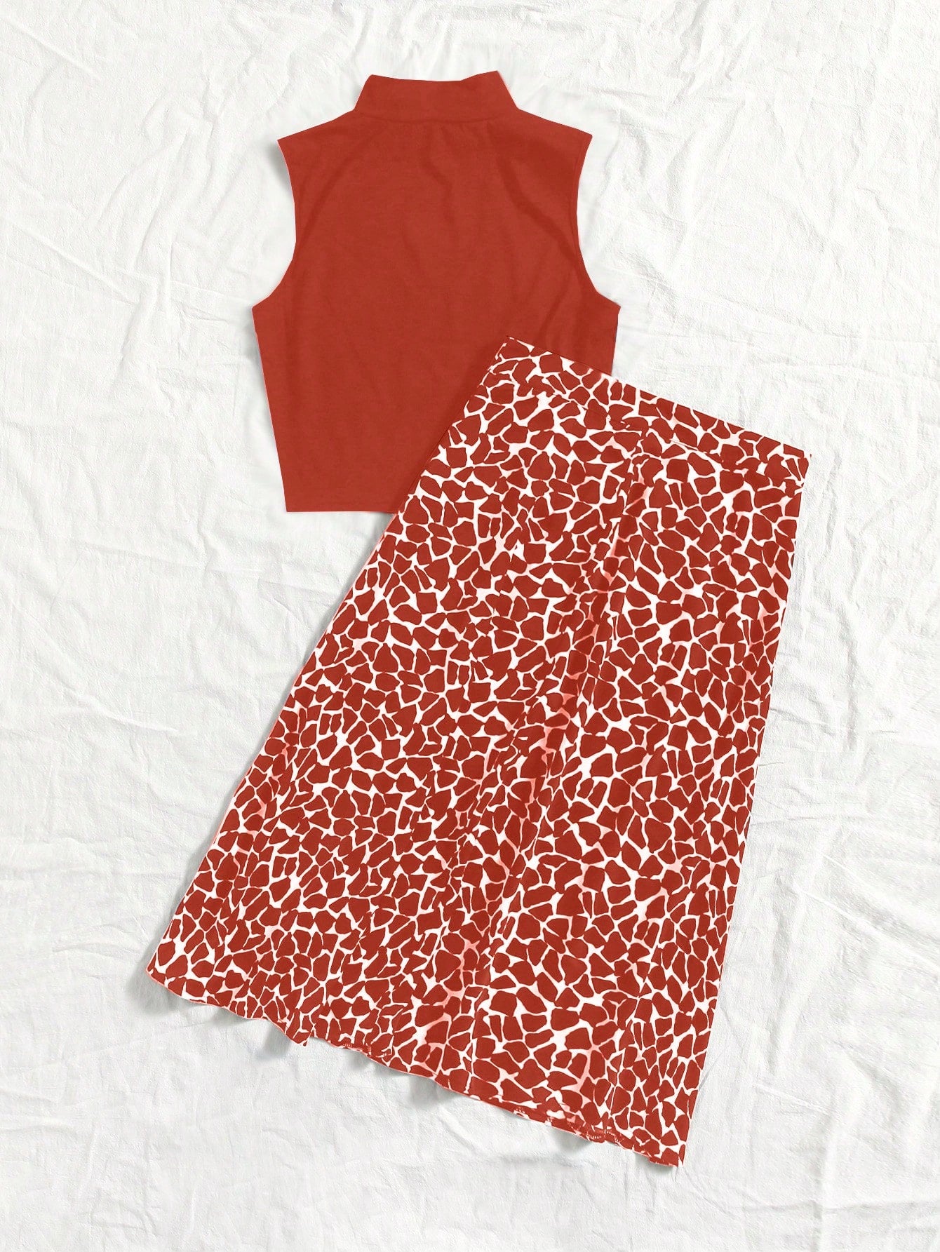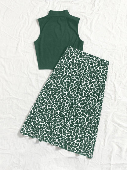 LUNE 2pcs/set Solid Color Vest And Printed Half Skirt