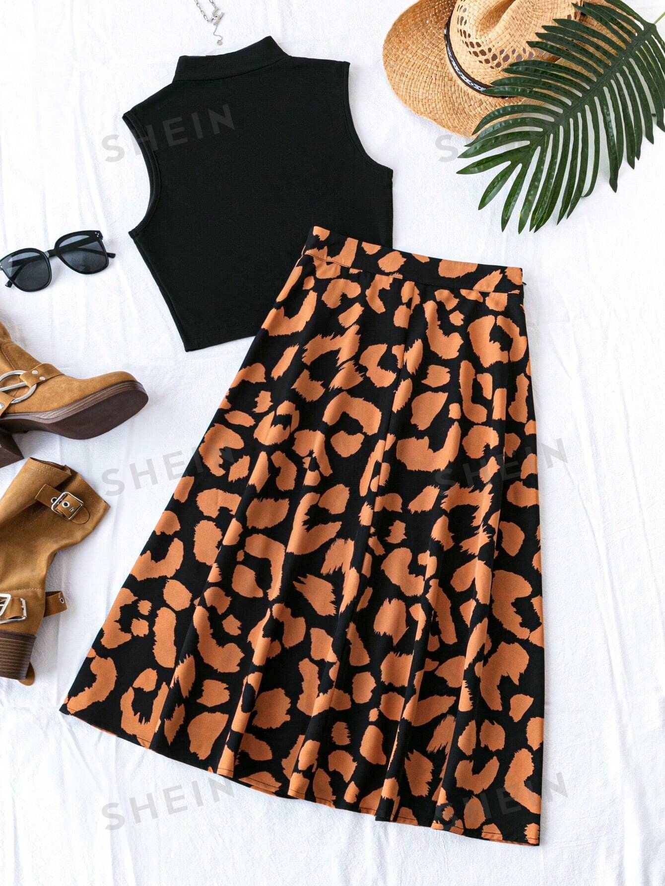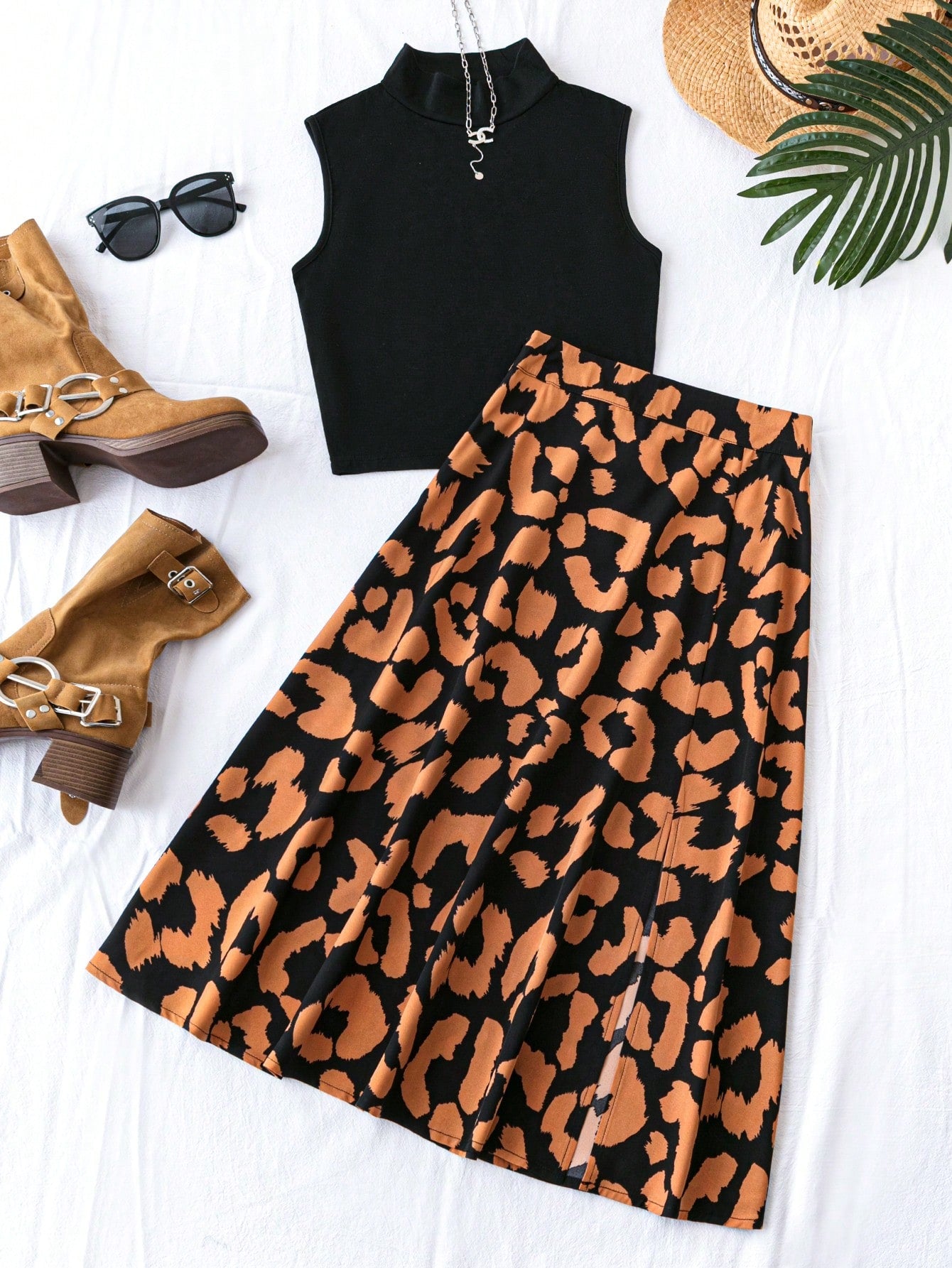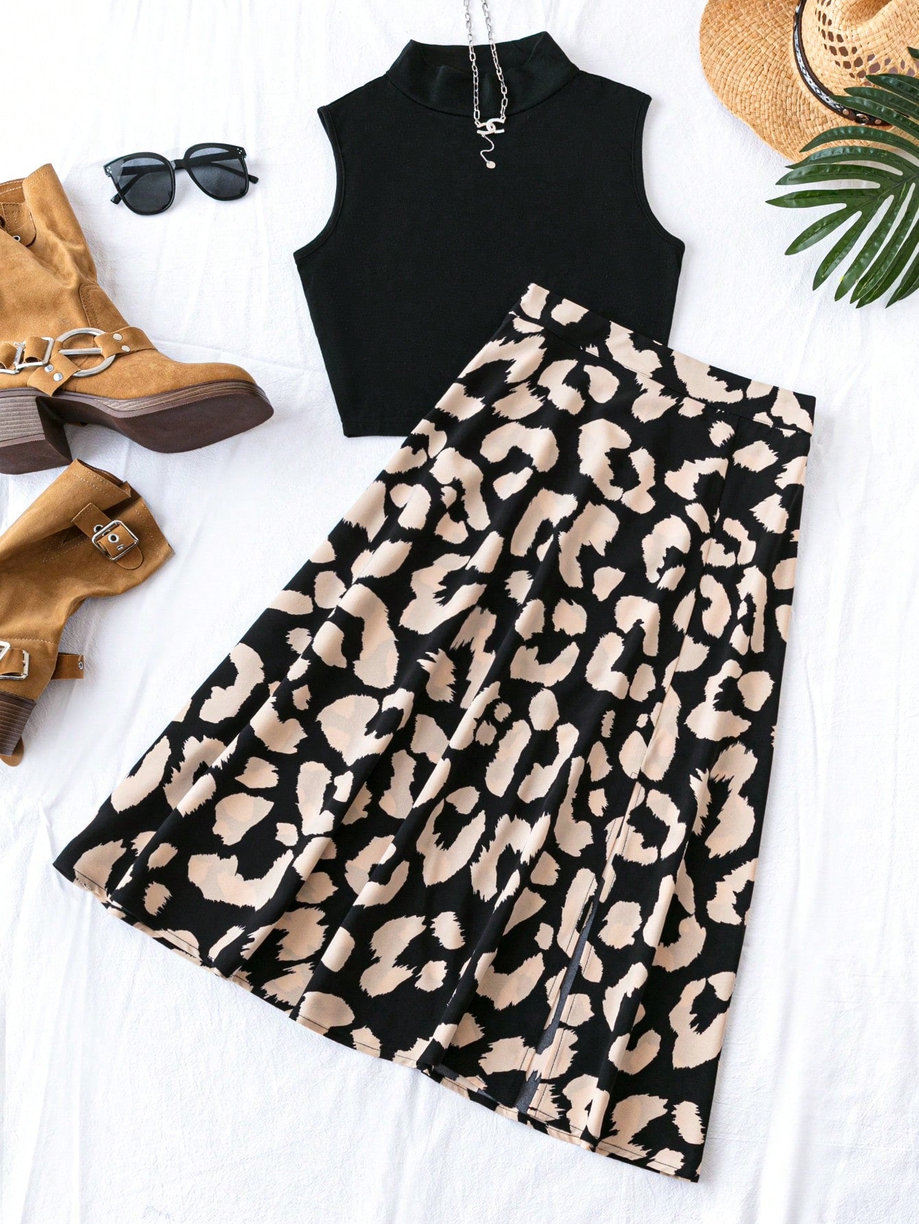 LUNE 2pcs/set Solid Color Vest And Printed Half Skirt