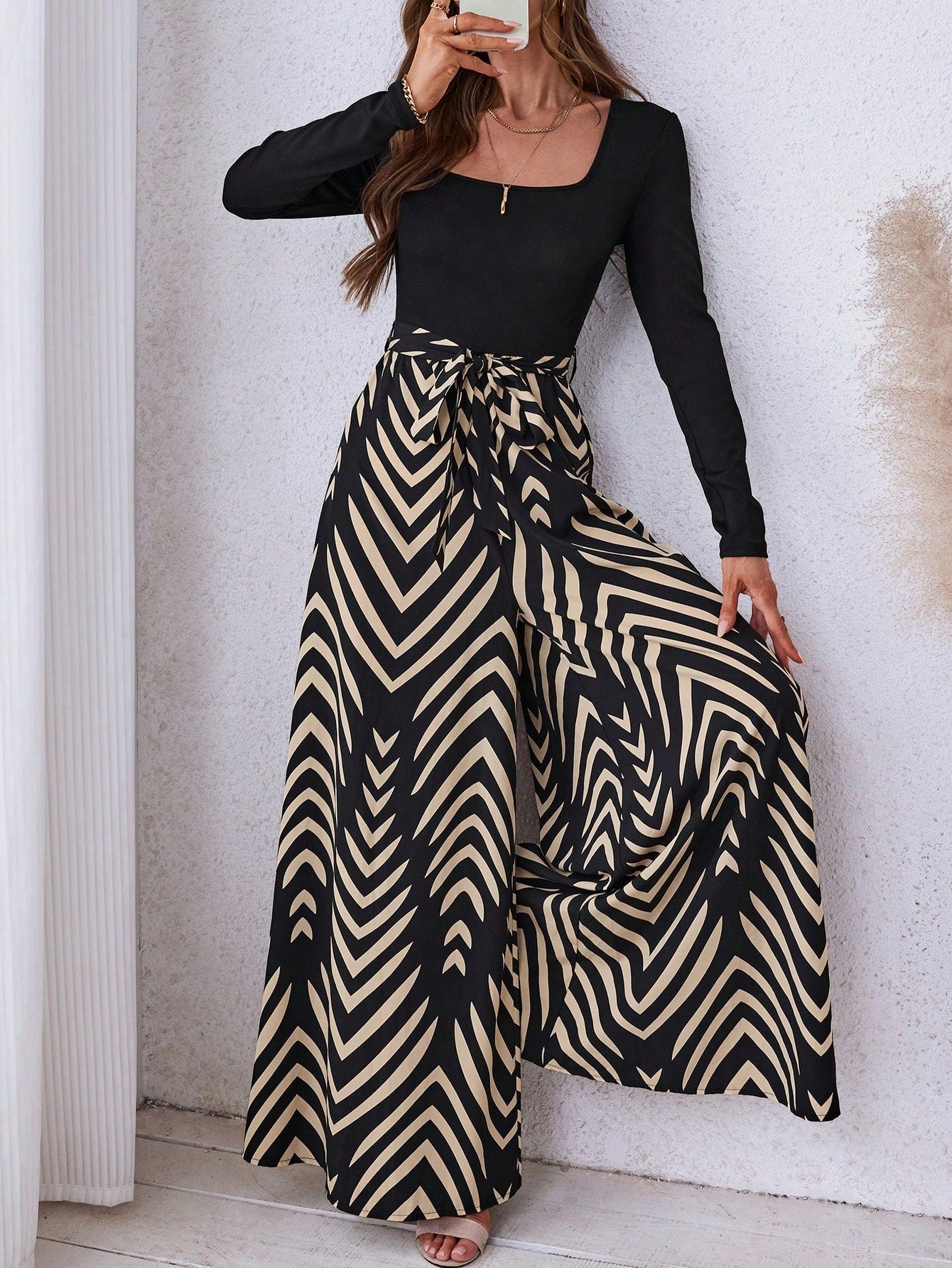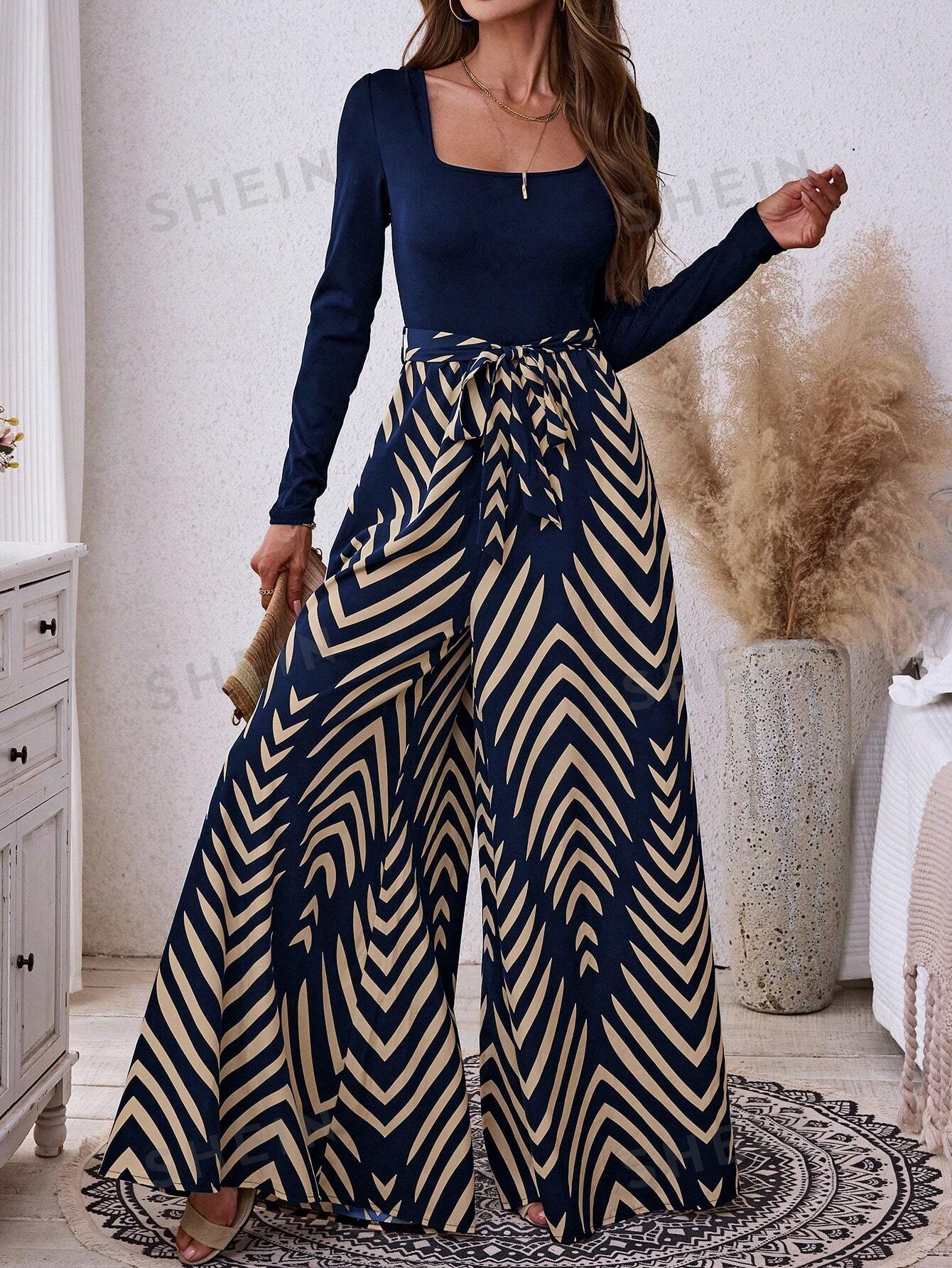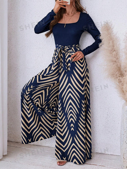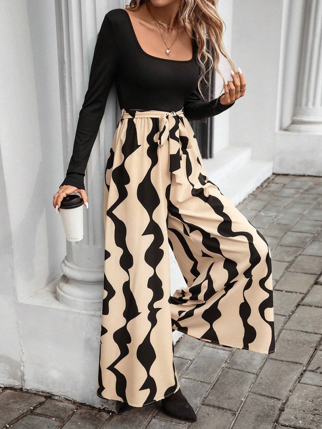 LUNE Women's Autumn/Winter Solid Color Ribbed Patchwork Geometric Print Woven Bohemian Casual Jumpsuit