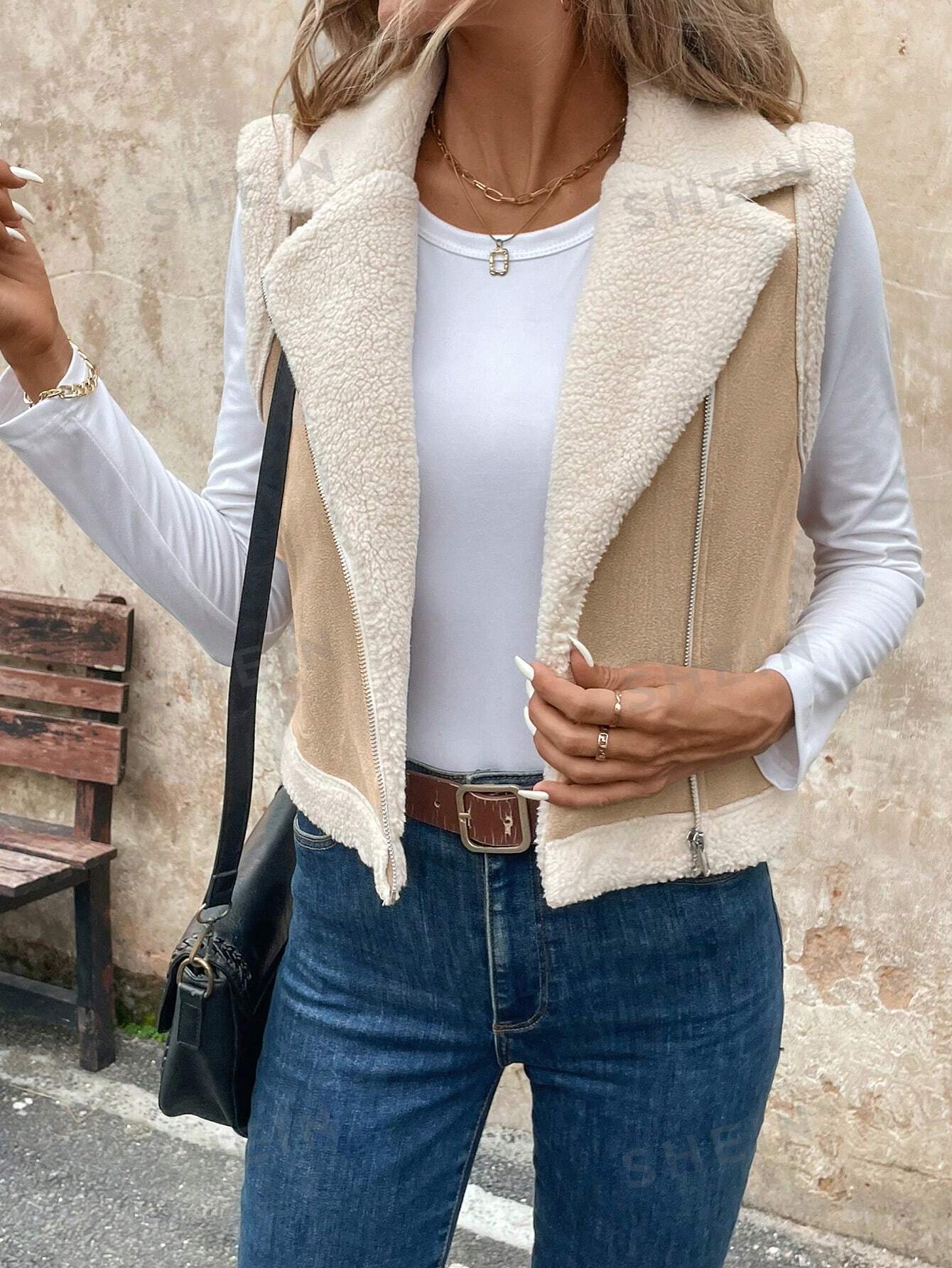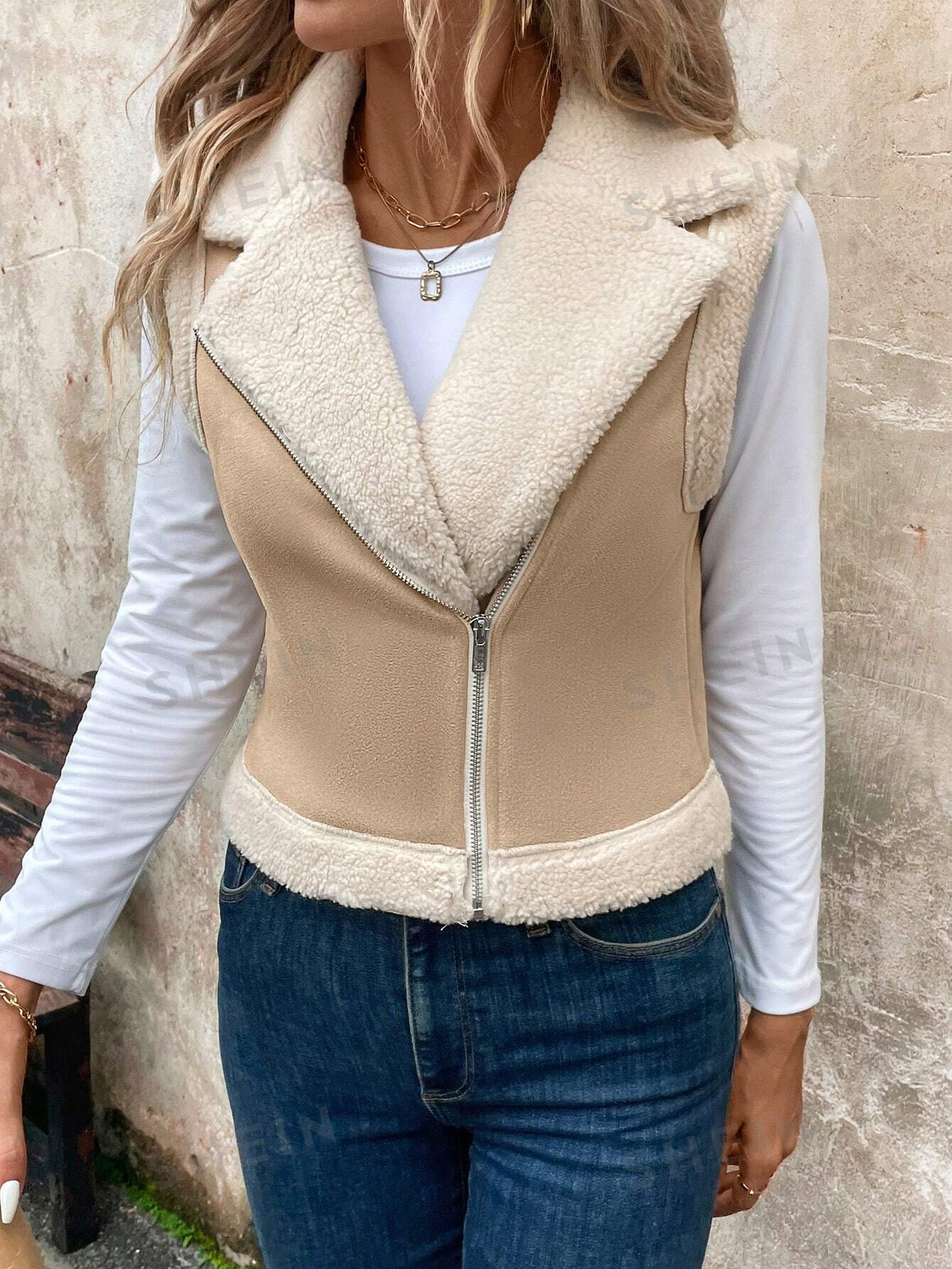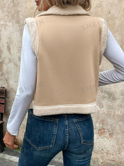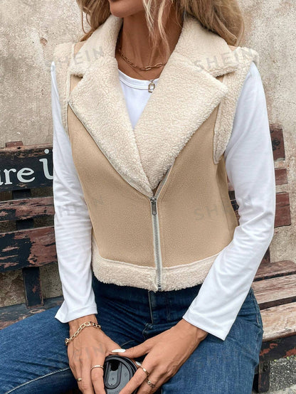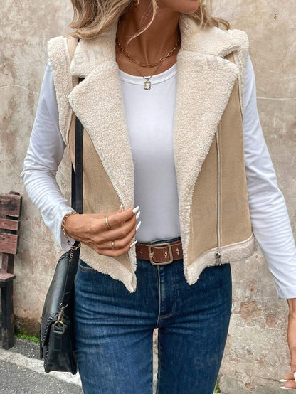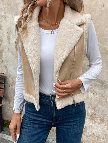 LUNE Women's Foldable Collar Metal Zipper Sleeveless Suede Sherpa Lined Warm Casual Jacket For Fall/Winter