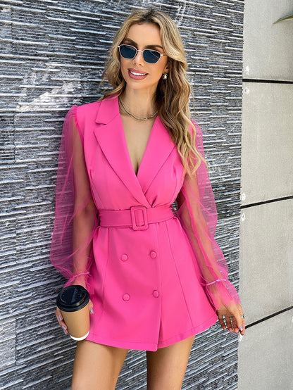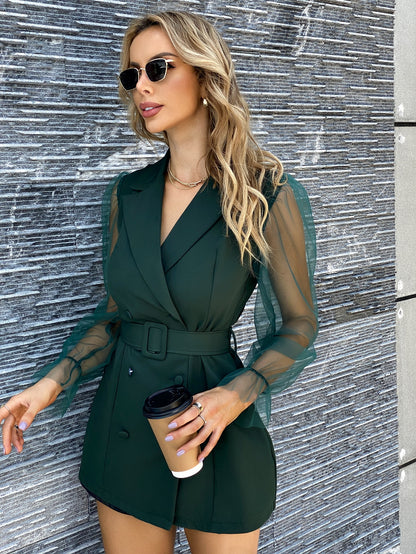Mesh Panel Flounce Sleeve Double Breasted Belted Blazer Dress