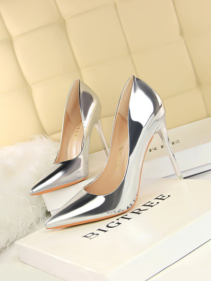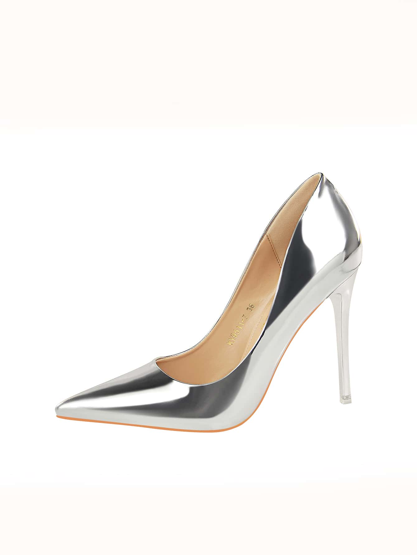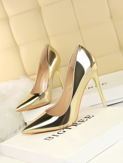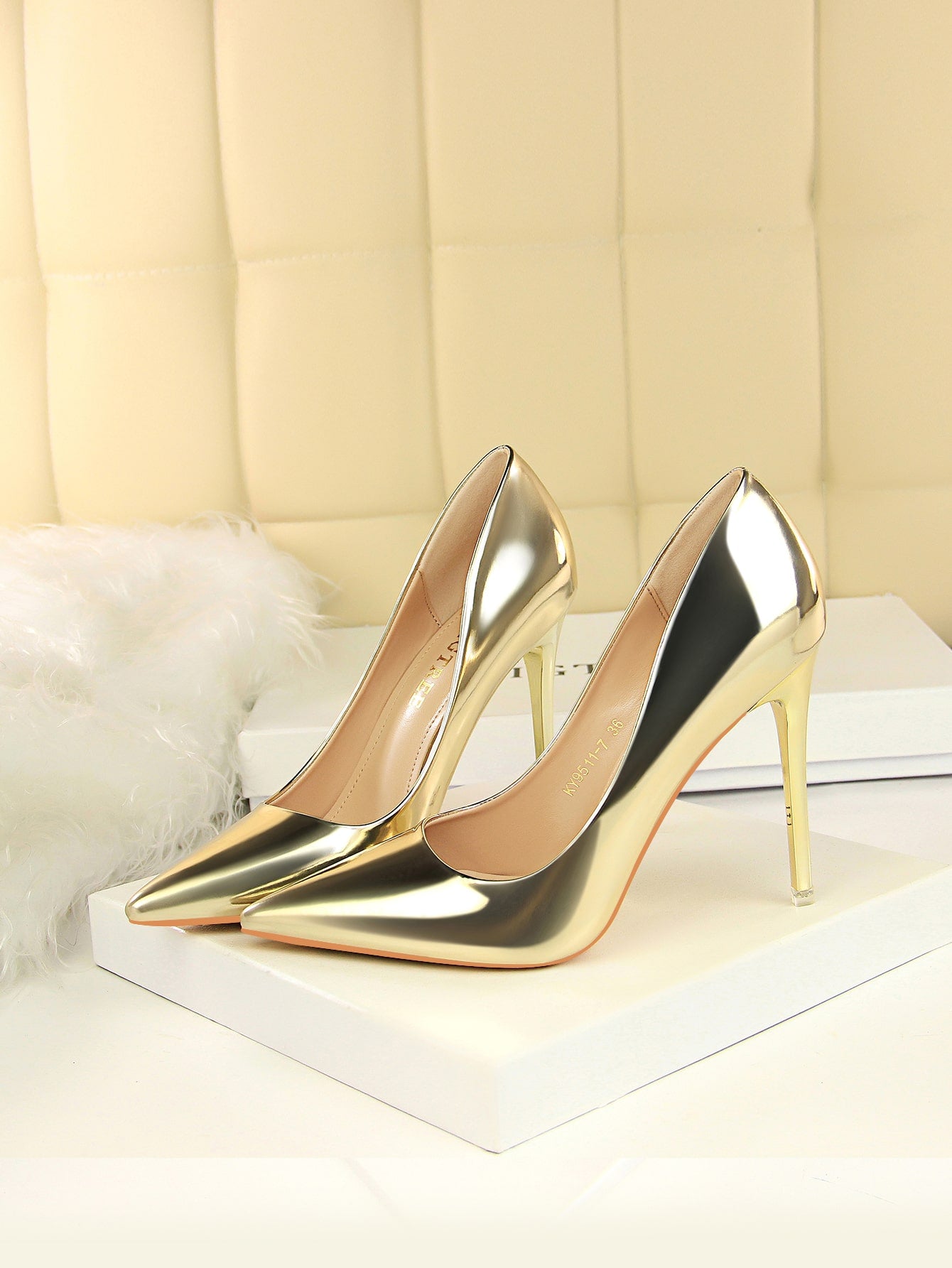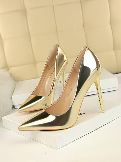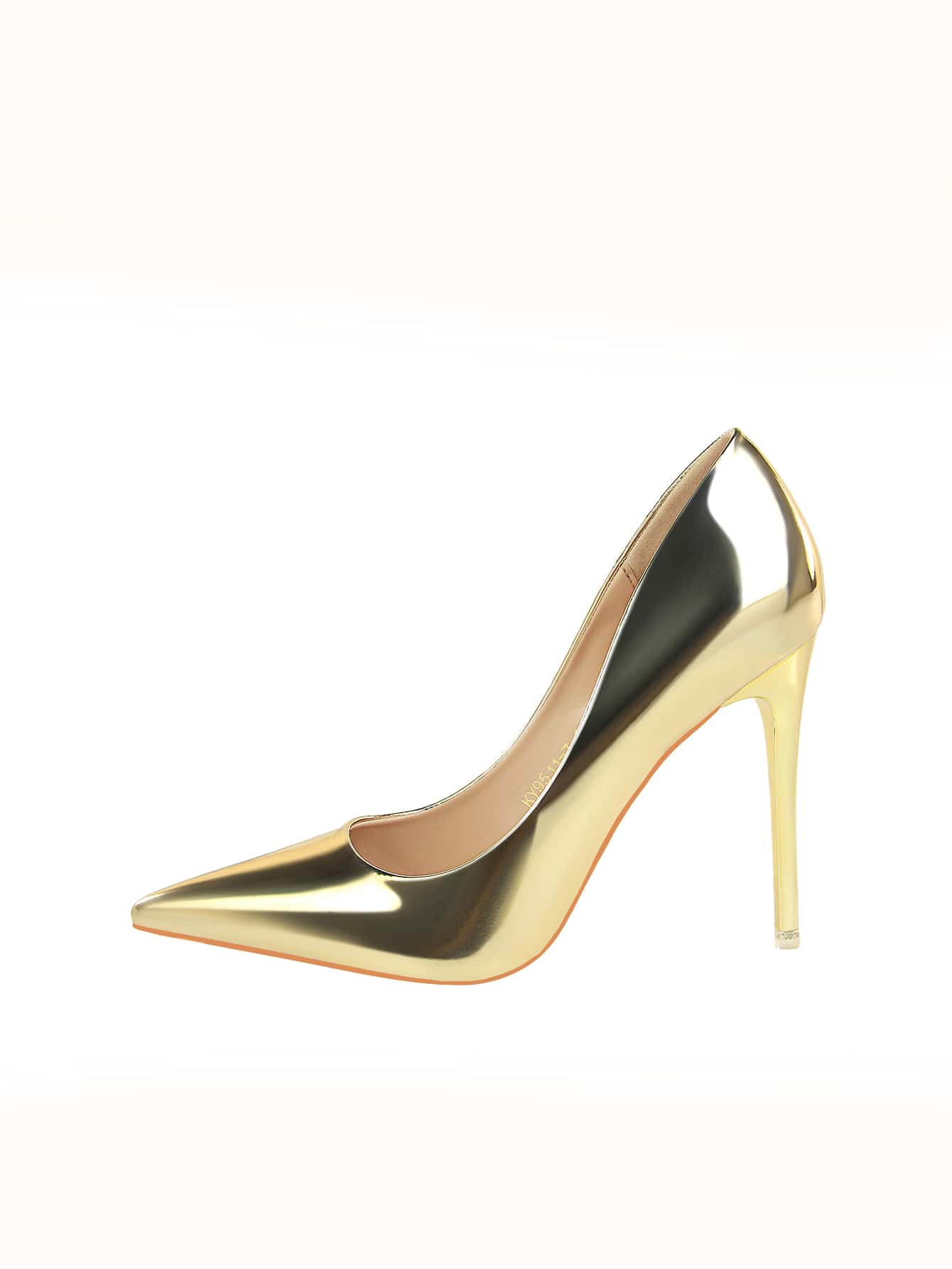 Metallic Point Toe Stiletto Heeled Court Pumps, Gold Party Solid Color High Heel Shoes