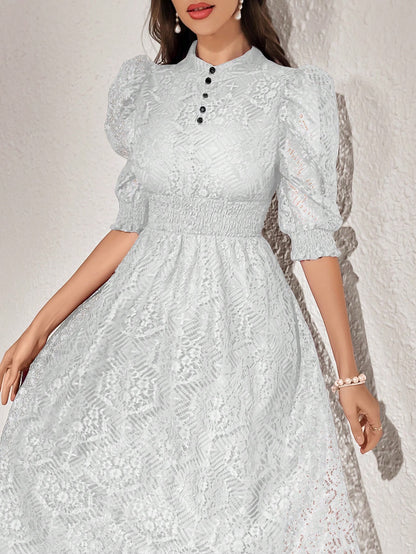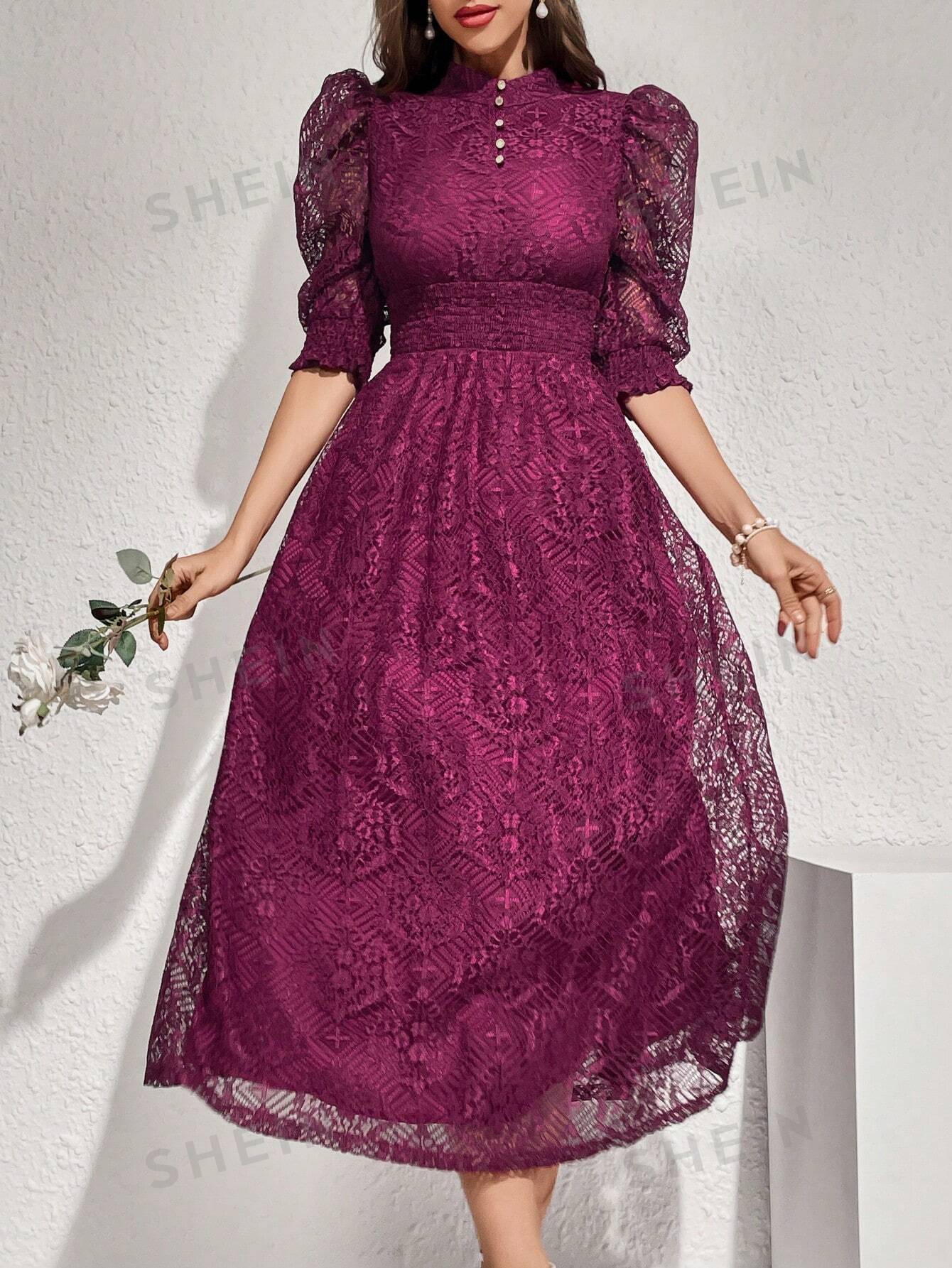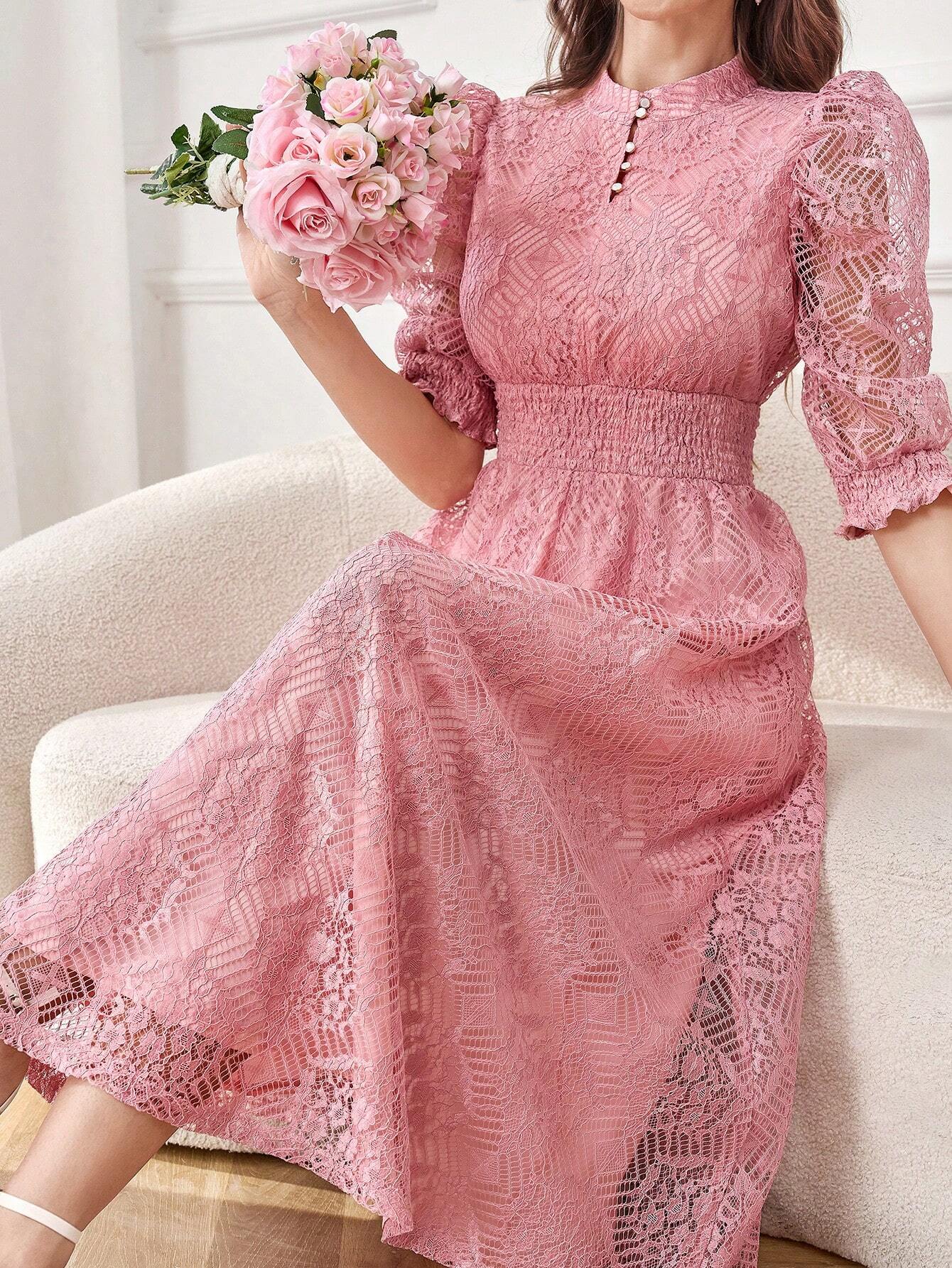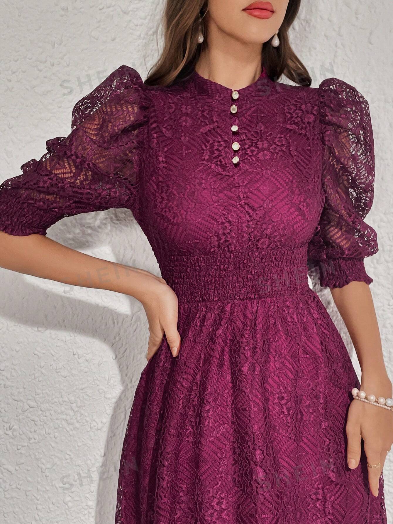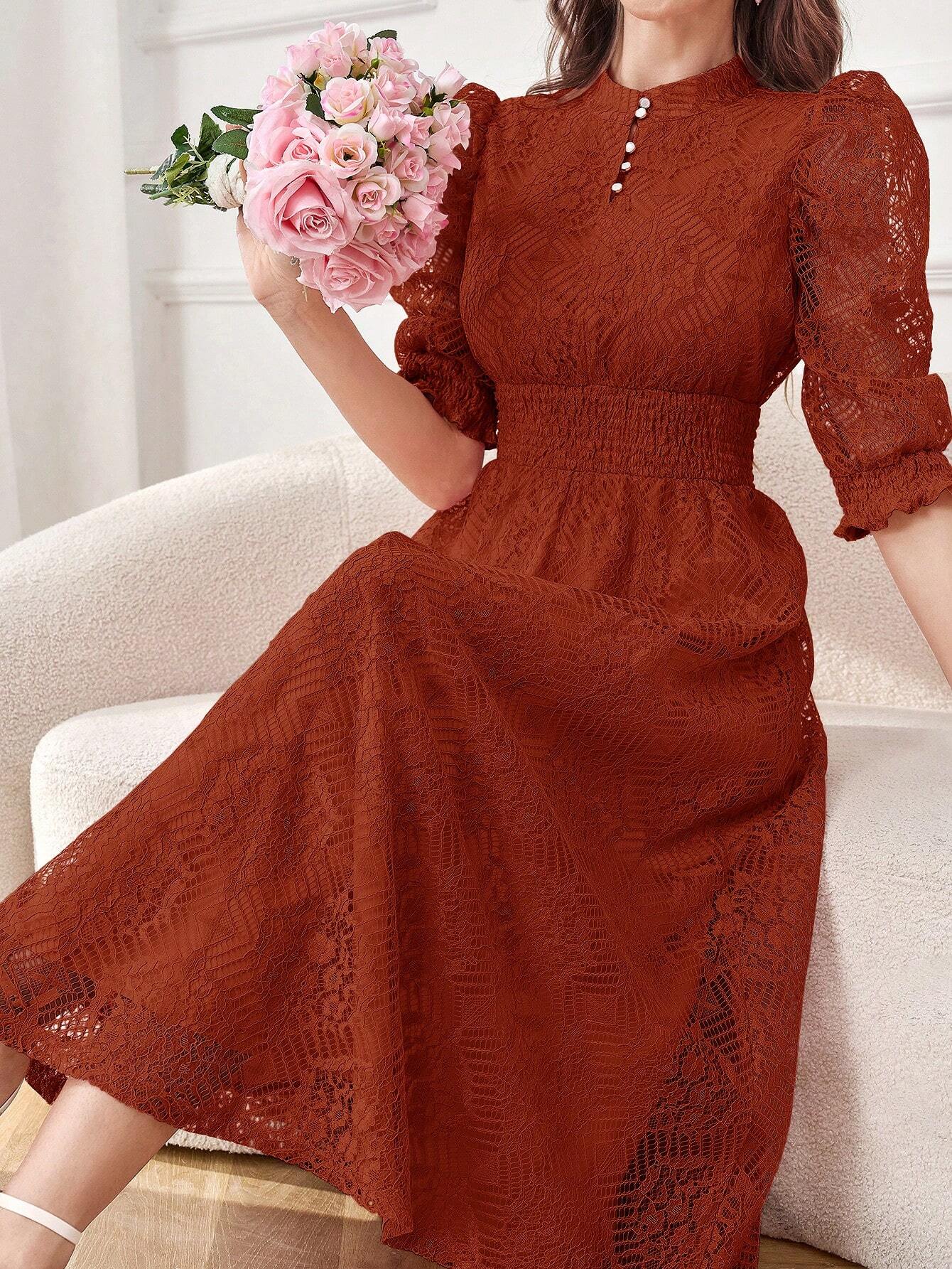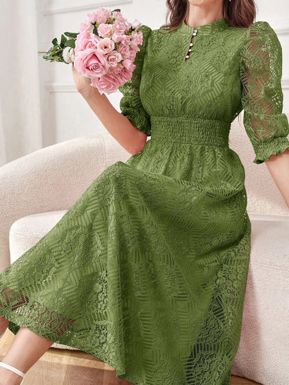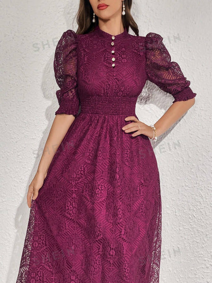 Modely Lace Panel Buttoned Detailing Waist Cinched Dress, Elegant Evening Party Maxi Dress