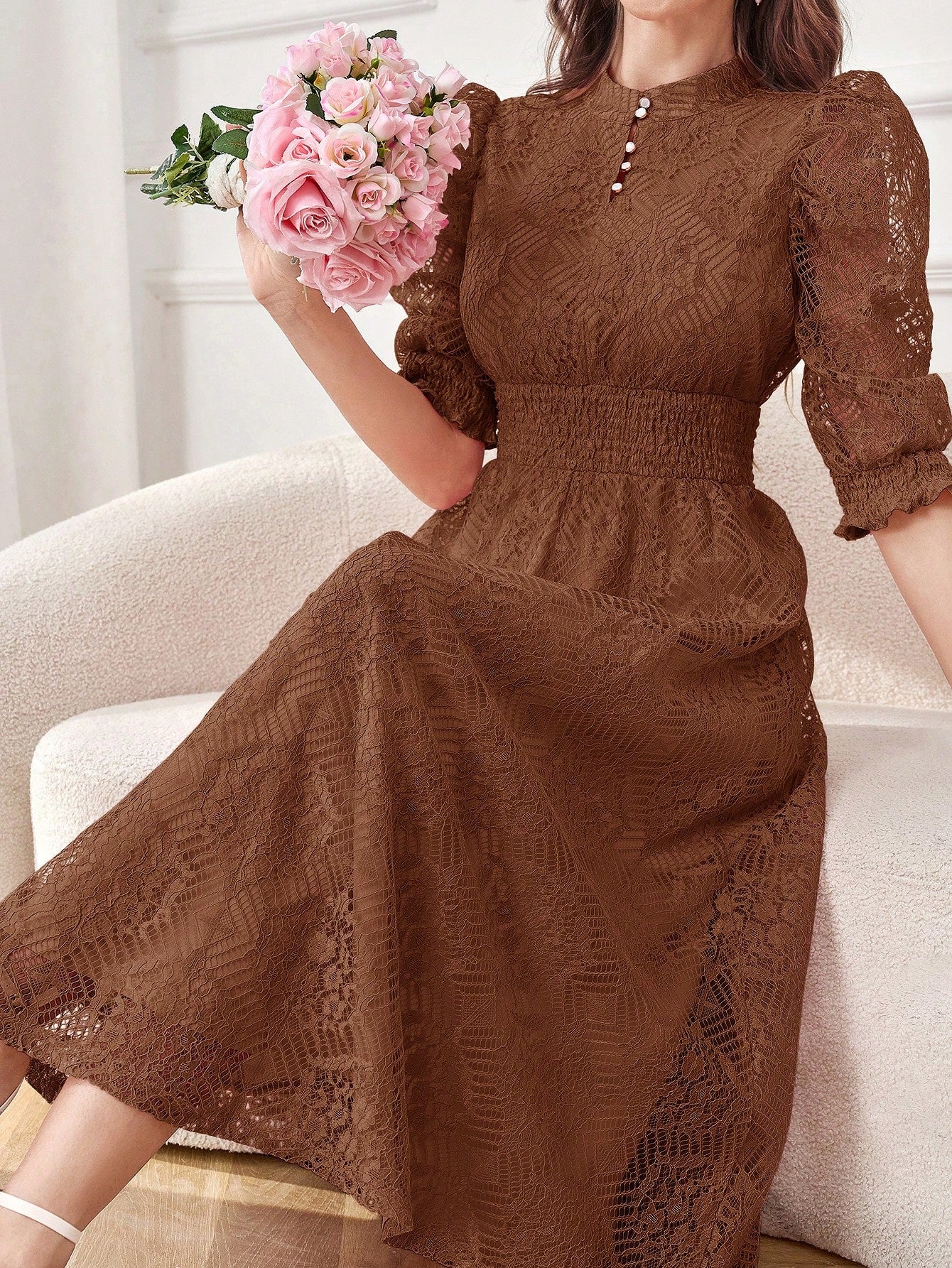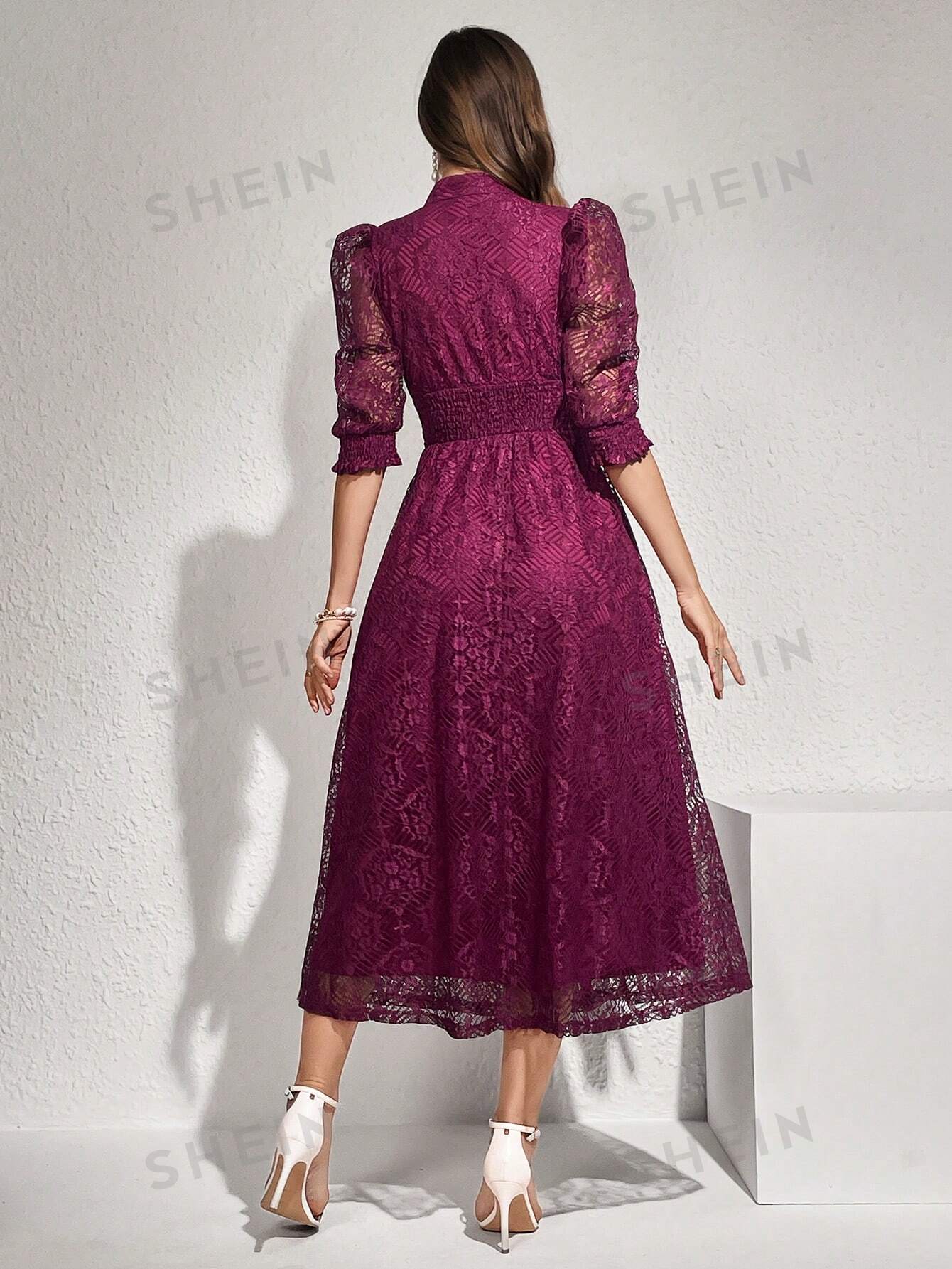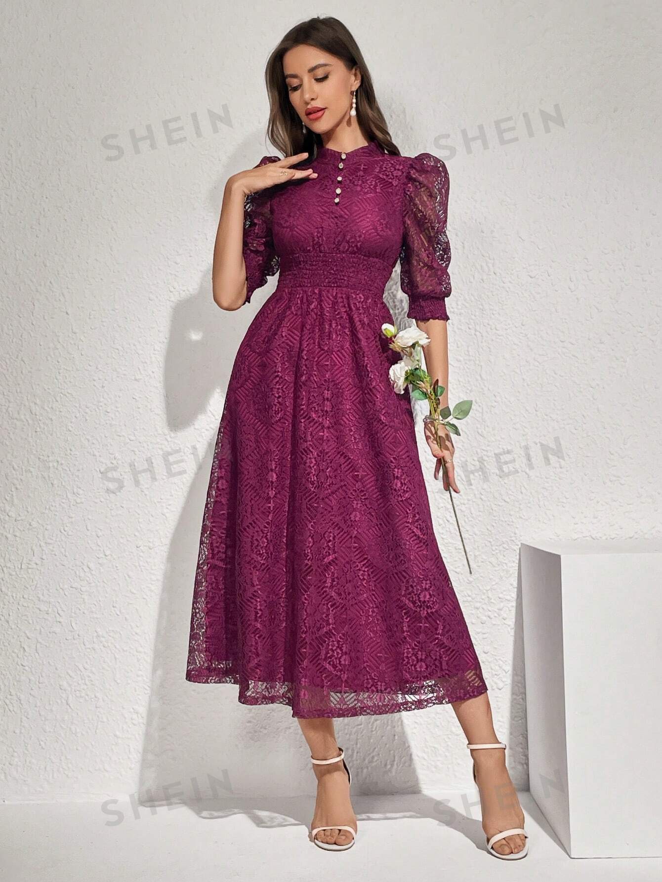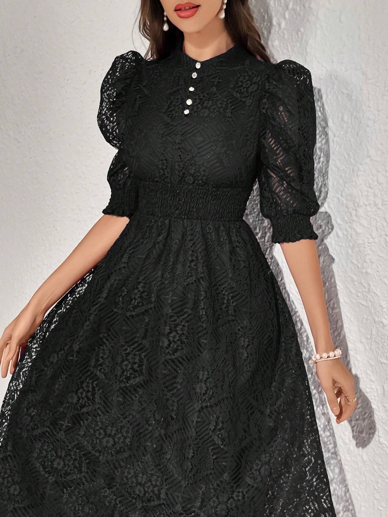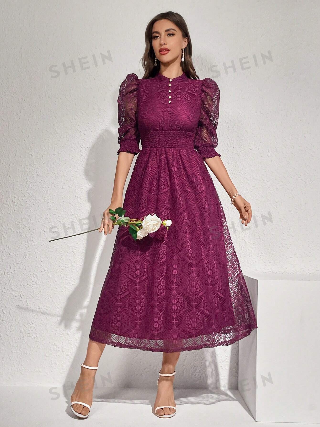 Modely Lace Panel Buttoned Detailing Waist Cinched Dress, Elegant Evening Party Maxi Dress