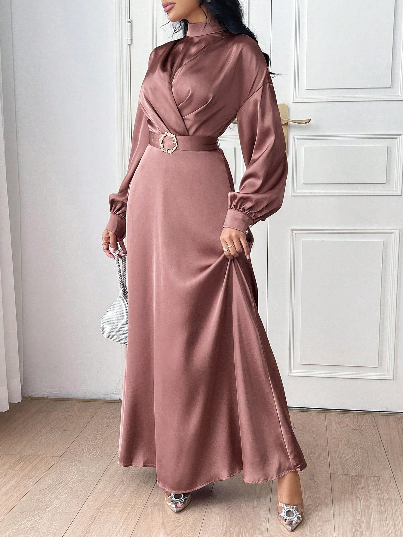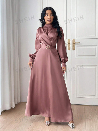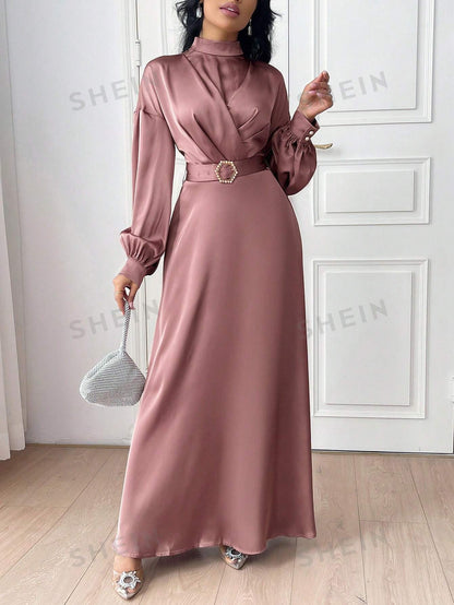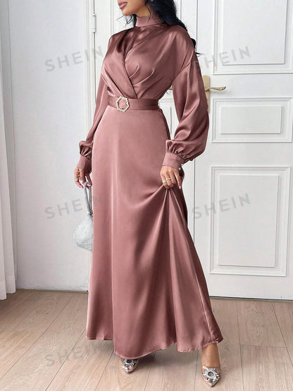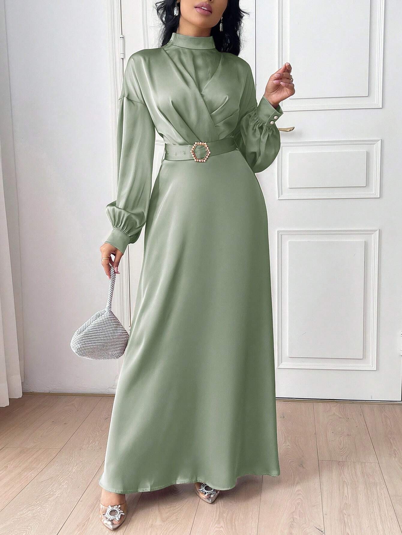 Modely Women Elegant Solid Color Lantern Sleeve Buckle Waist Dress,Elegant Evening Party Maxi Dress